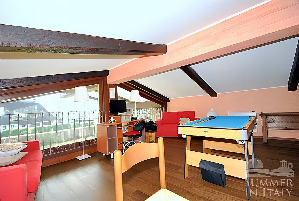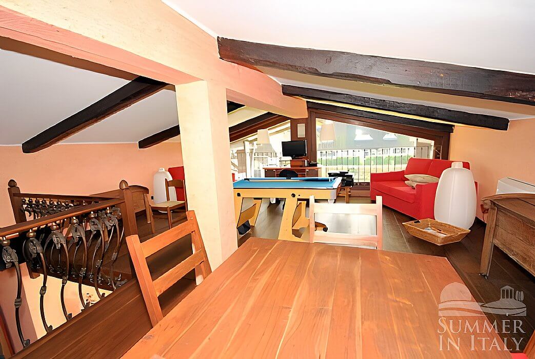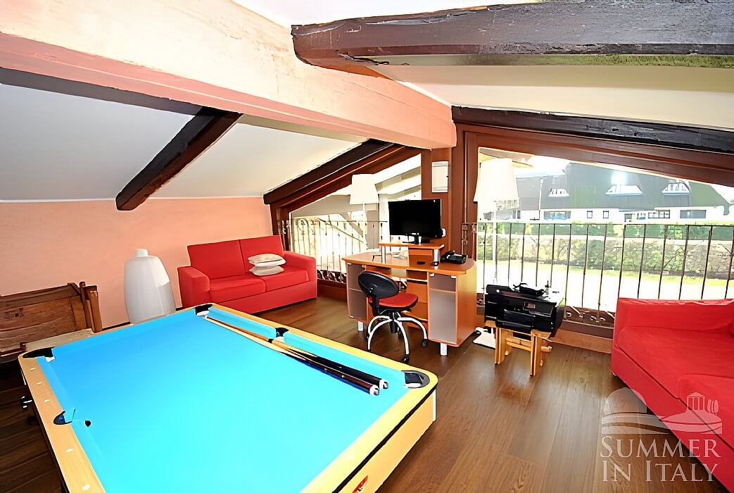In the living room you will find an open mezzanine level, without door. The furnishings of the mezzanine include two sofas and a desk. The ceiling is sloped, has characteristic exposed wood beams and has an height of 1.50 meters (5 feet) at its lowest point. The mezzanine has two large panoramic windows. In this room you will find a flat-screen satellite television (local channels), a DVD player and a CD player. Here you will be able to have fun with a pool table.