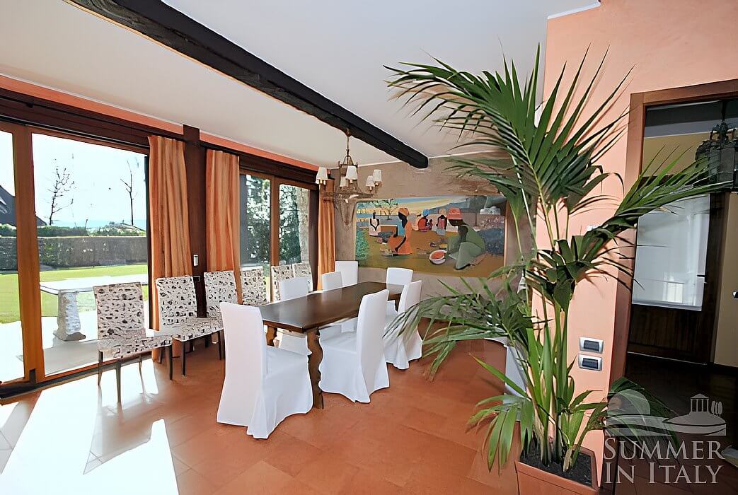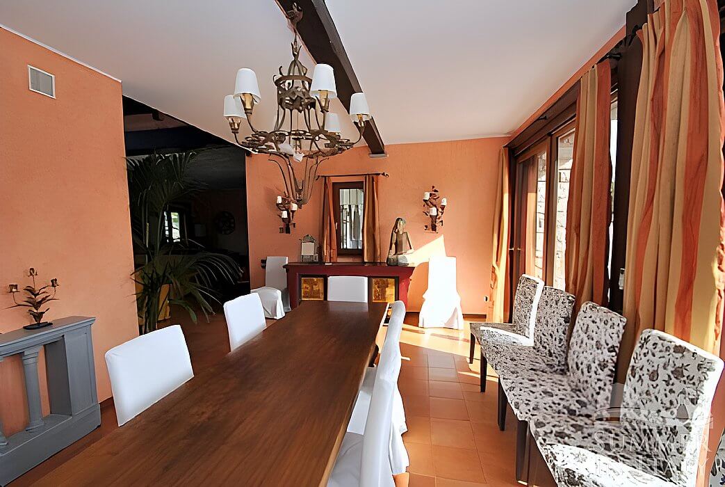 You will be able to enter the dining room from the living room. The ceiling has characteristic exposed wood beams. The furnishings are bright and cheerful. The dining table can accommodate ten guests. From the dining room you will be able to enter the patio with a view of the garden through two French doors. The room also has a window with a view of the patio, and is equipped with an air conditioning/heating unit.