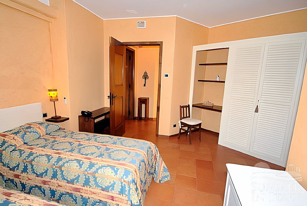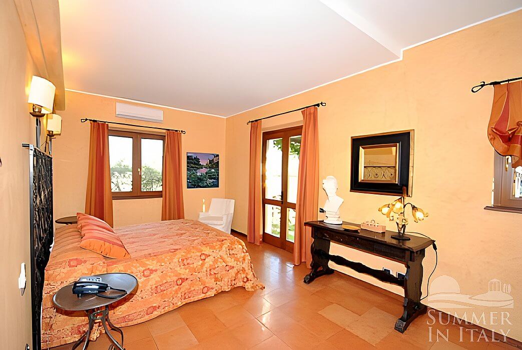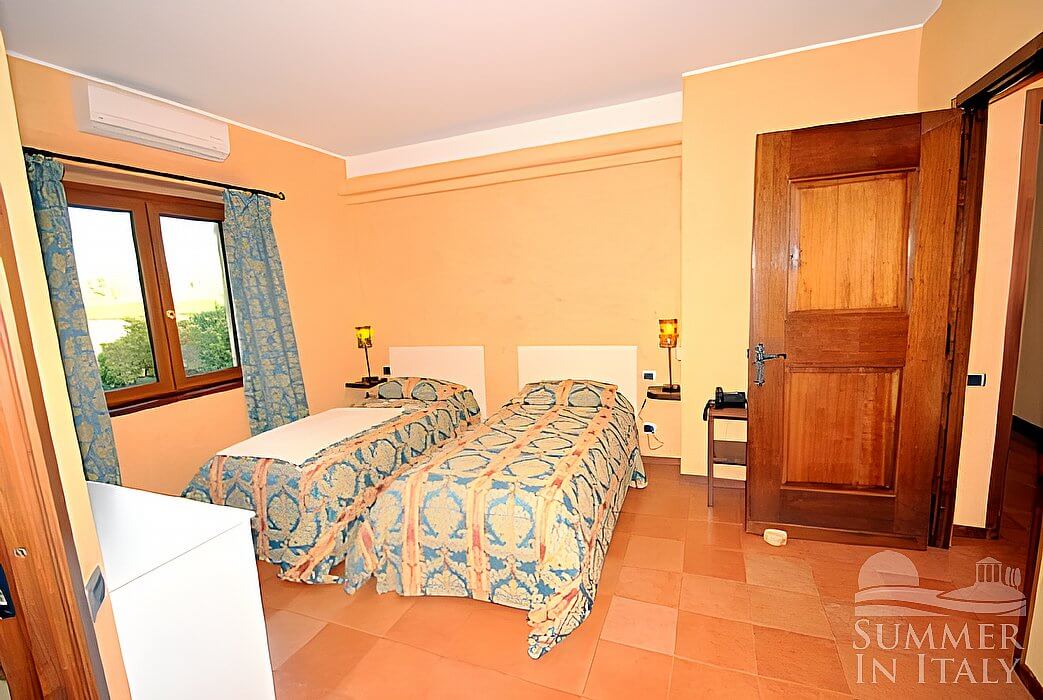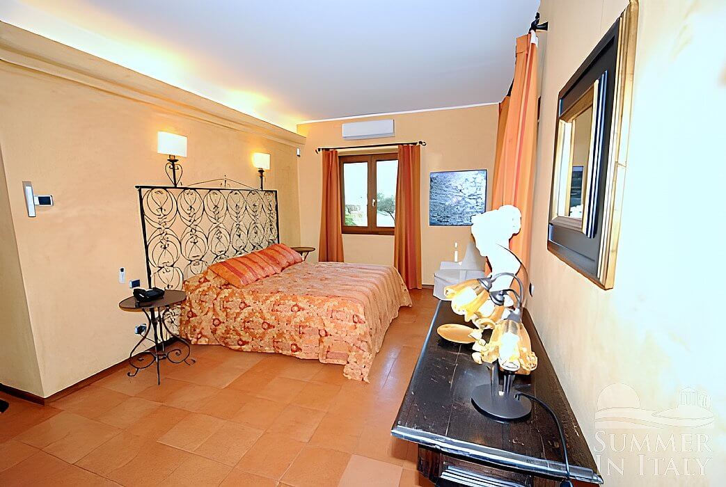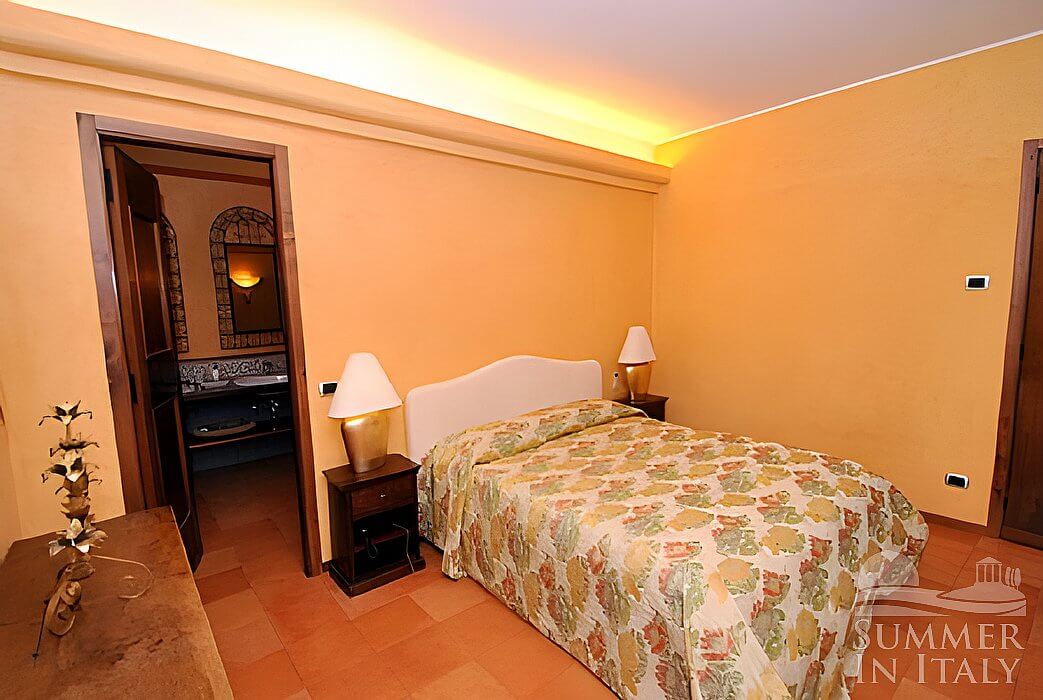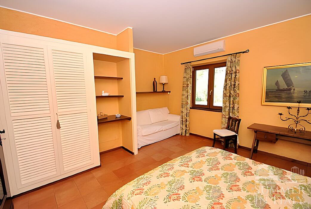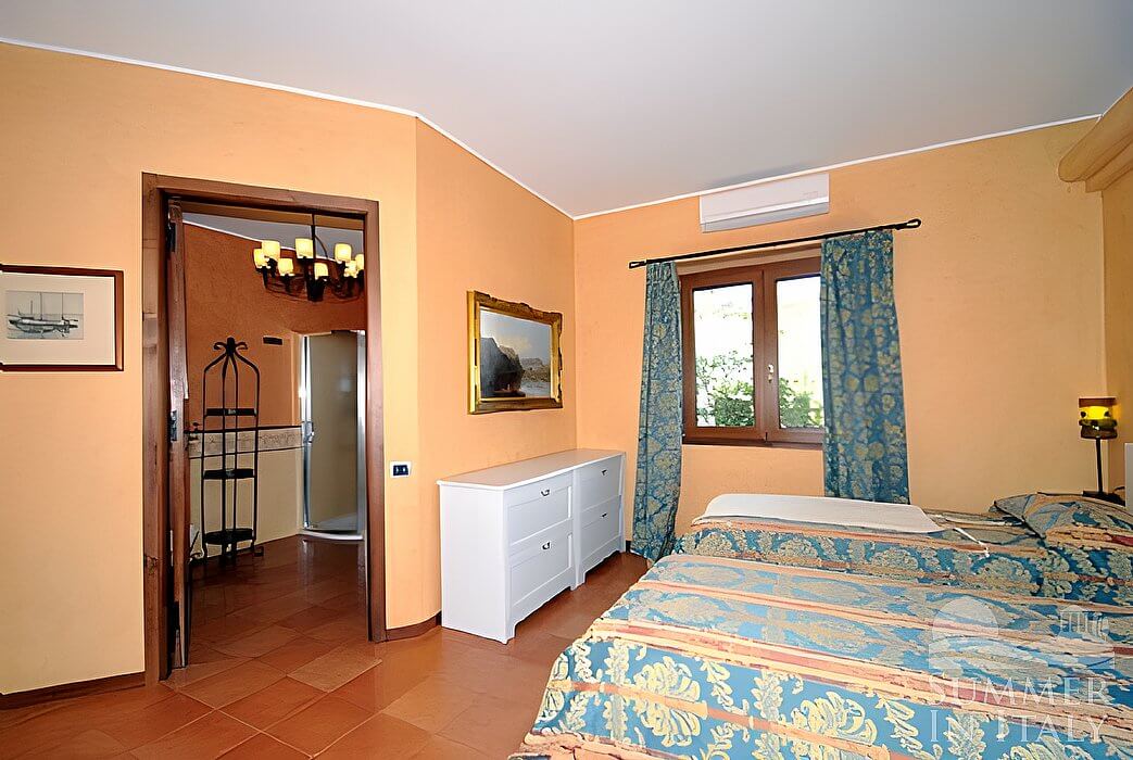 You will be able to enter the first bedroom from the living room through a corridor. The bedroom has a king-size bed (180 cm/71 inches). The furnishings include an armchair. From the bedroom you will be able to enter the swimming pool through a French door. The room has three windows with a view of the garden and of the swimming pool, and it's equipped with an air conditioning/heating unit, and you will also find a safe. This bedroom has an en-suite bathroom, spacious, well decorated and equipped with a washbasin, a toilet, a large fully-enclosed shower and a hairdryer.