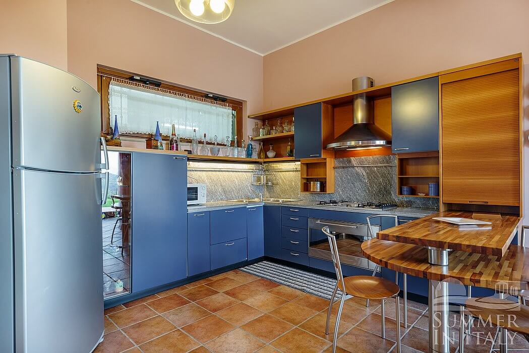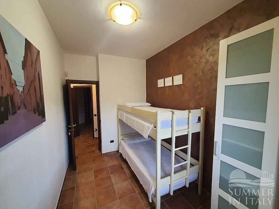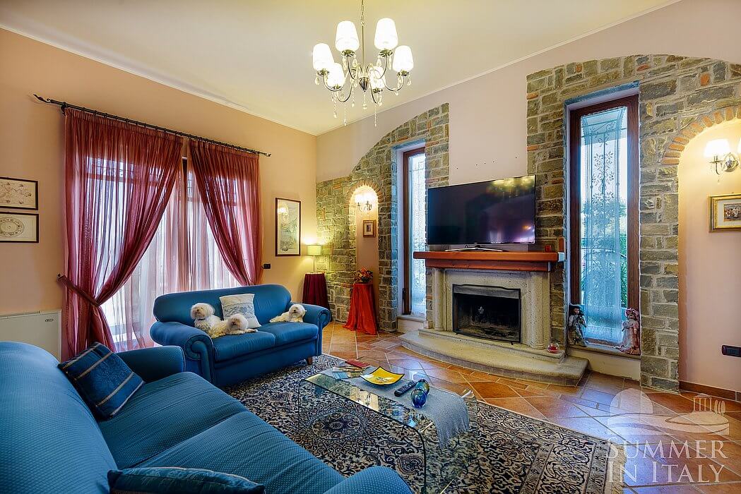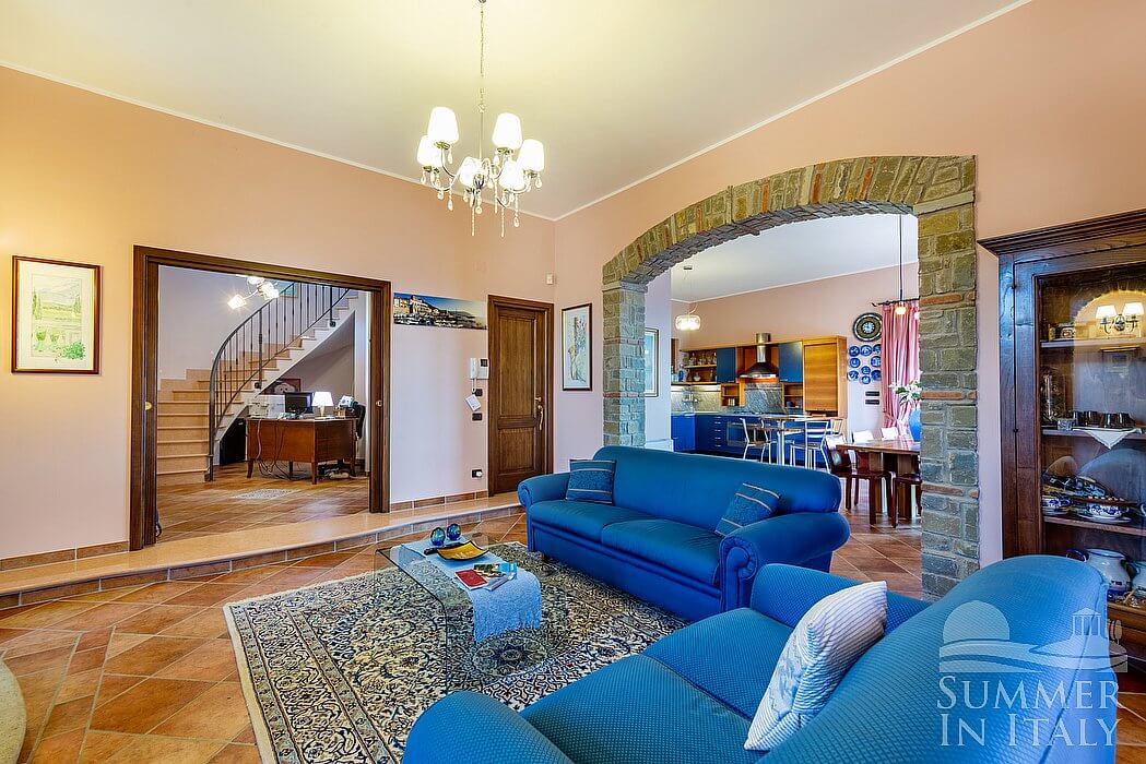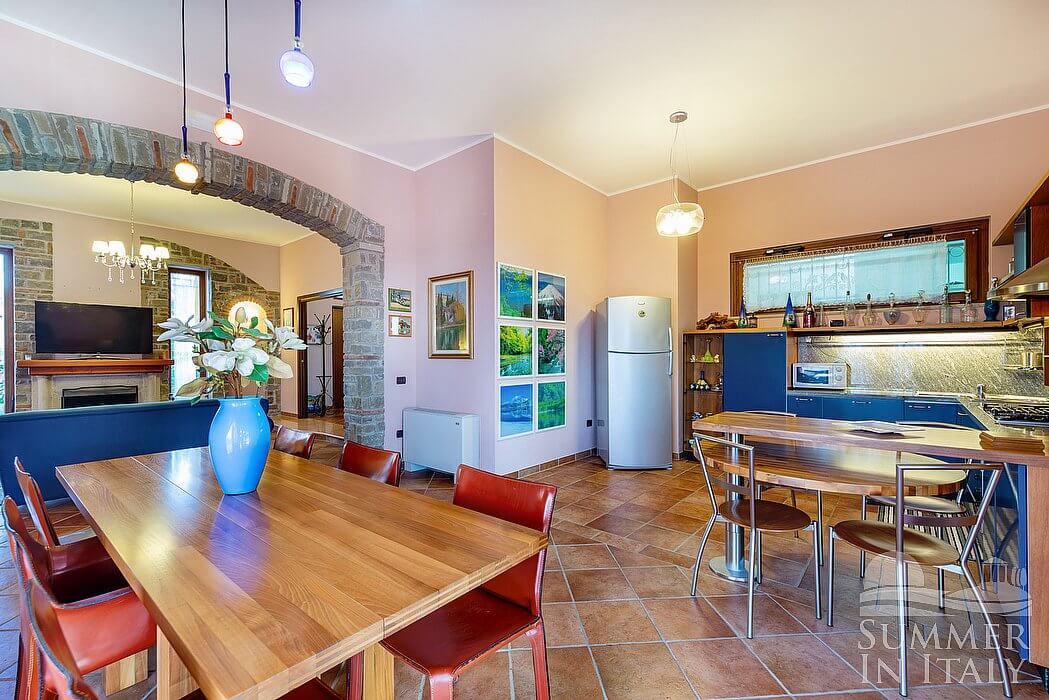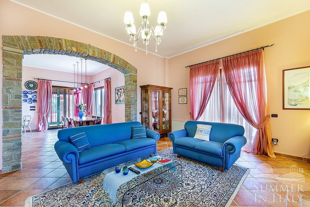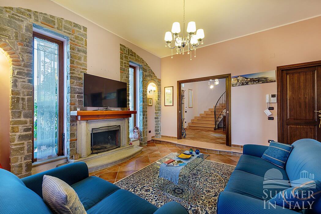 The living room is paved with terracotta tiles. The furnishings are elegant and welcoming. The furnishings include two sofas. There is a practical fireplace. In the living room you will also find a cooking area. The kitchenette is equipped with a four-burner gas cooker, an electric oven, a refrigerator with freezer, a dishwasher, a microwave oven, an Italian-style coffee-maker and a kettle. The dining table can accommodate eight guests. In this room you will find a satellite television (local channels). From the living room you will be able to enter the garden through three double-glazed French doors. The room has two windows. It is equipped with an air conditioning/heating unit.