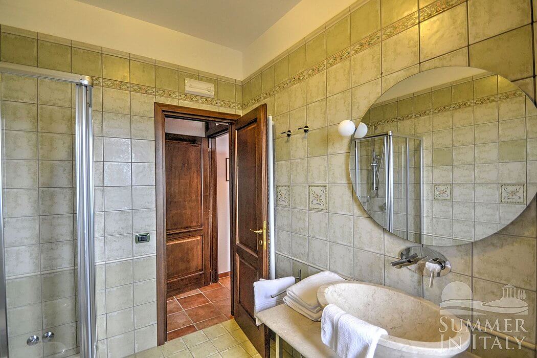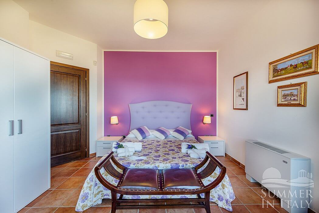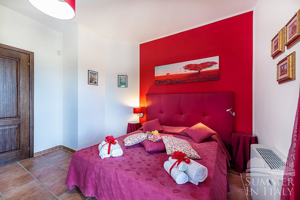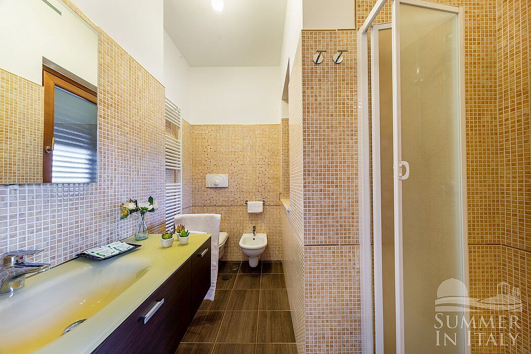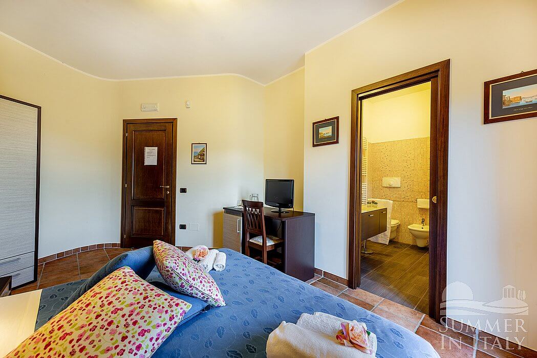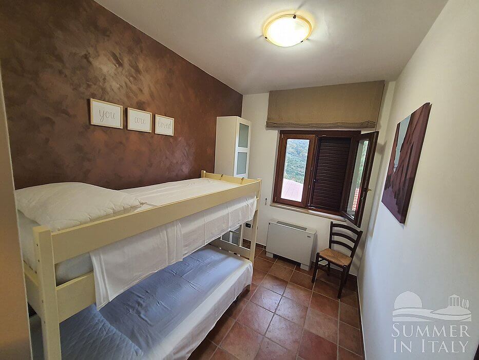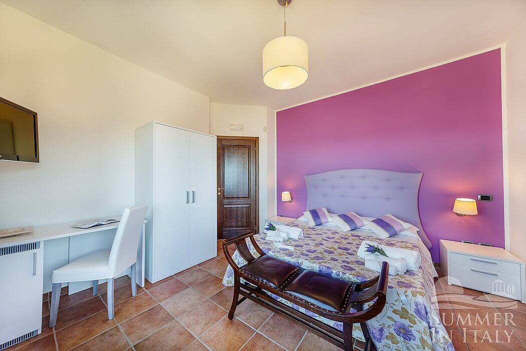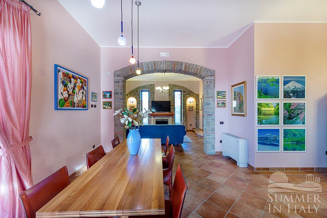 The living room is paved with terracotta tiles. The furnishings are elegant and welcoming. The furnishings include two sofas. There is a practical fireplace. In the living room you will also find a cooking area. The kitchenette is equipped with a four-burner gas cooker, an electric oven, a refrigerator with freezer, a dishwasher, a microwave oven, an Italian-style coffee-maker and a kettle. The dining table can accommodate eight guests. In this room you will find a satellite television (local channels). From the living room you will be able to enter the garden through three double-glazed French doors. The room has two windows. It is equipped with an air conditioning/heating unit.