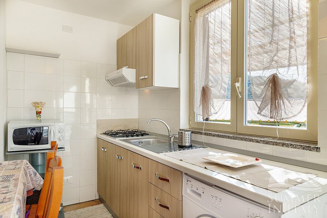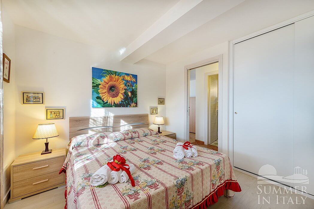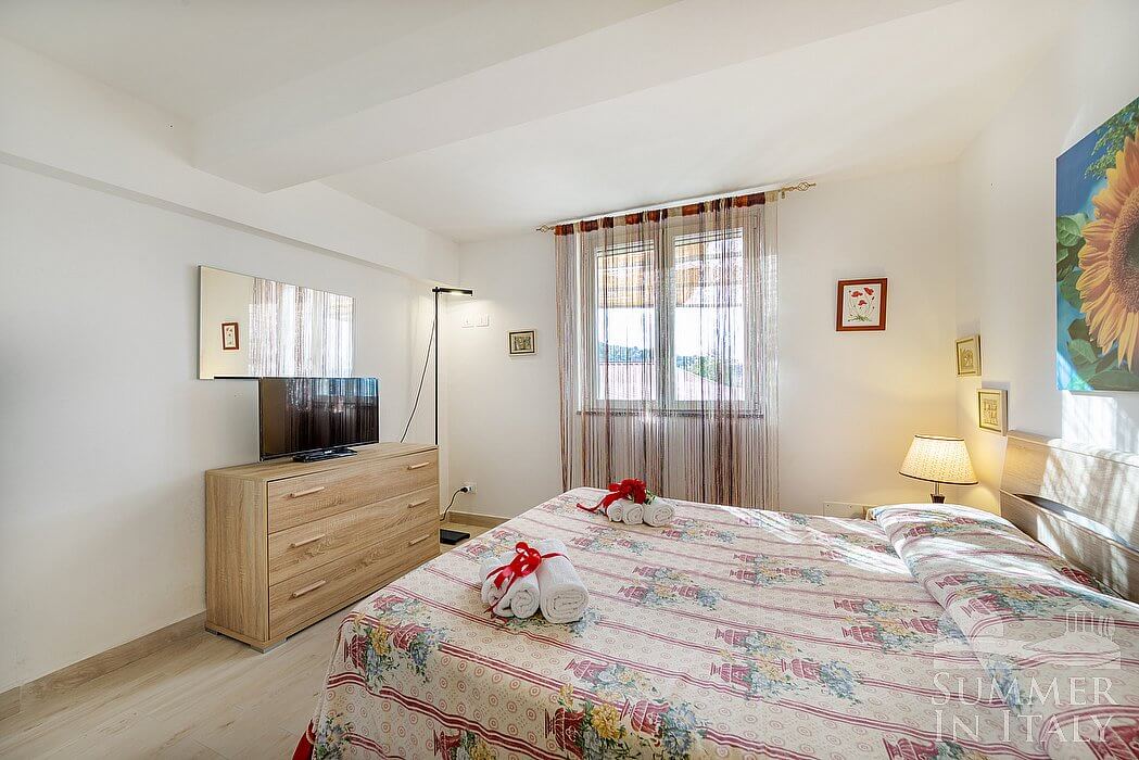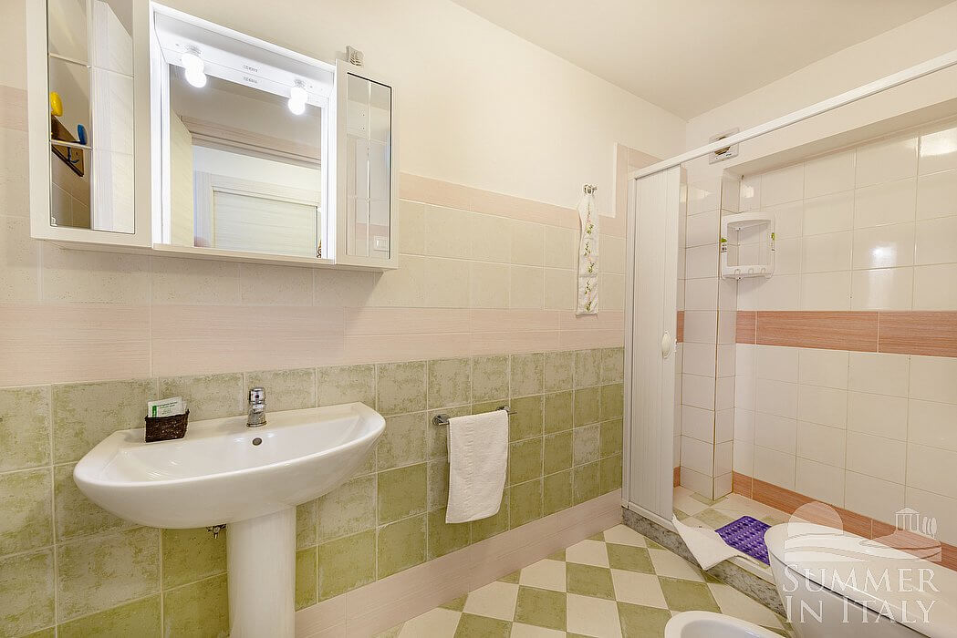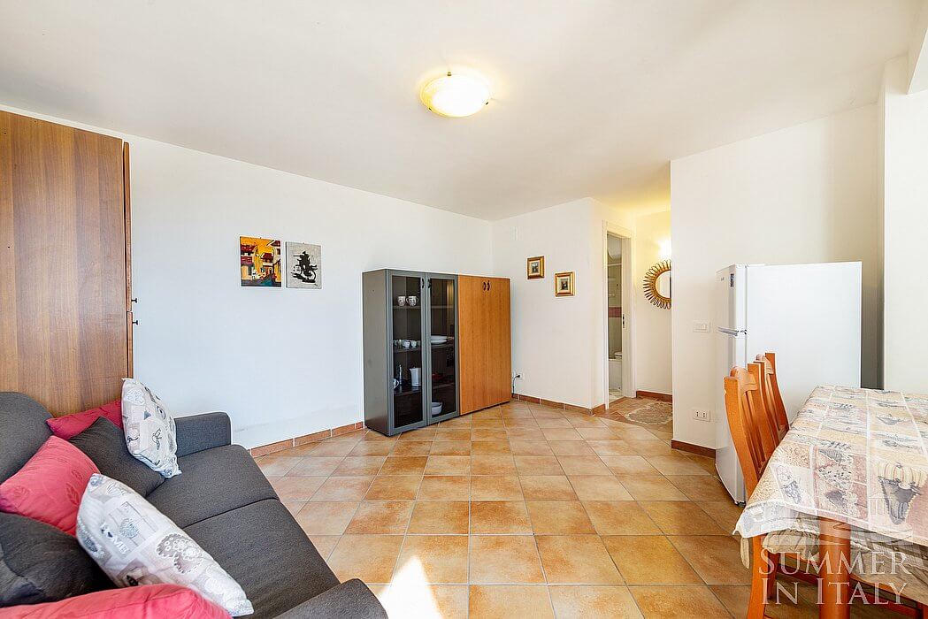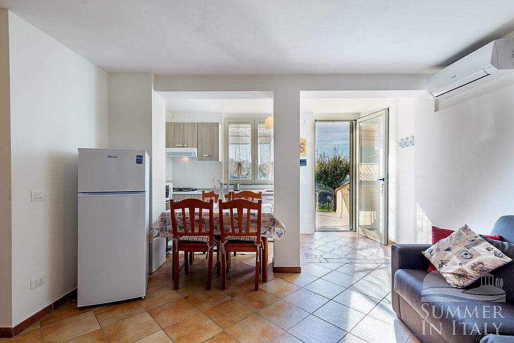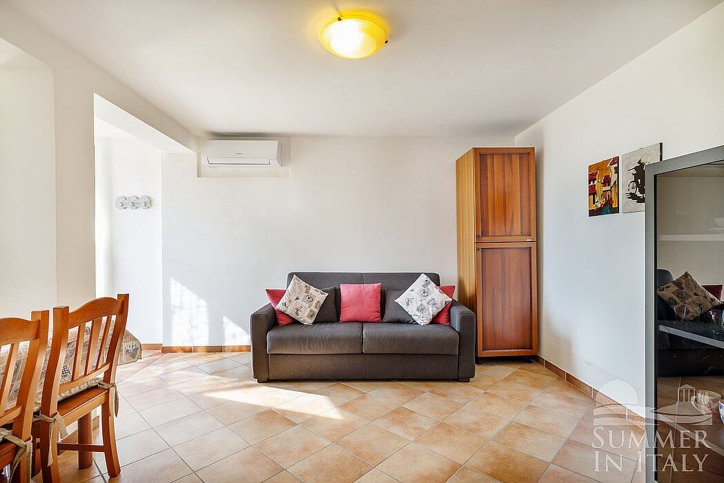 The furnishings of the living room are simple and comfortable. The furnishings include a divan that unfolds into a double bed. In the living room you will also find a cooking area. The kitchenette is equipped with a four-burner gas cooker, a refrigerator with freezer, a microwave oven, an Italian-style coffee-maker and other small appliances. There is also a washing machine. The dining table can accommodate four guests. From the living room you will be able to enter the patio through a double-glazed French door. The room also has a window. It is equipped with an air conditioning/heating unit.