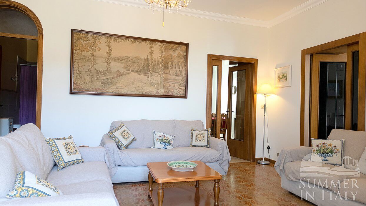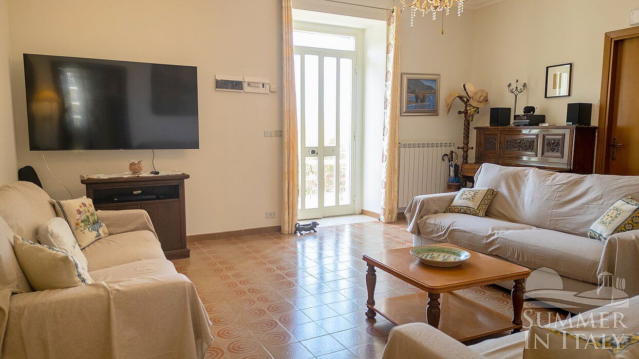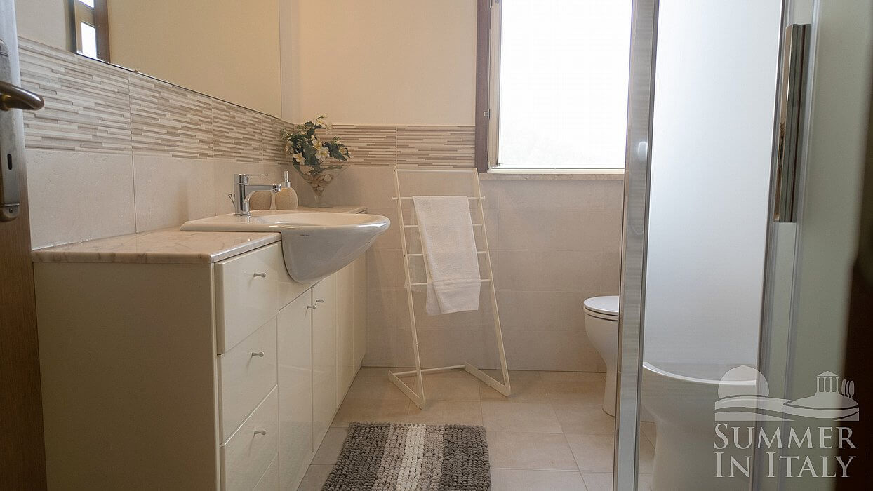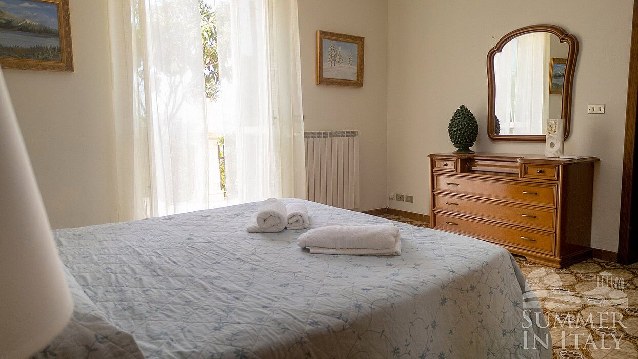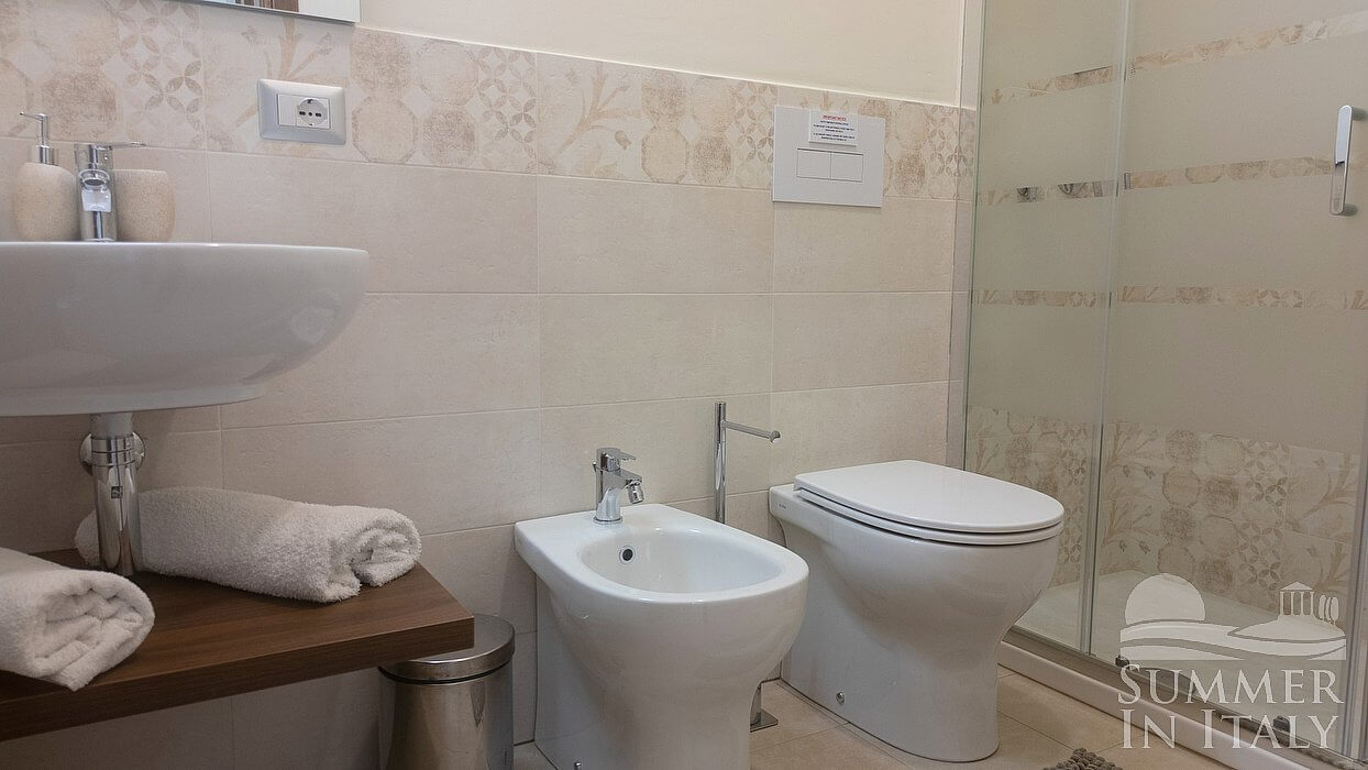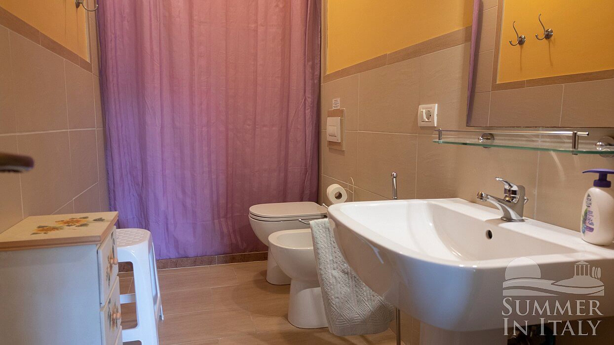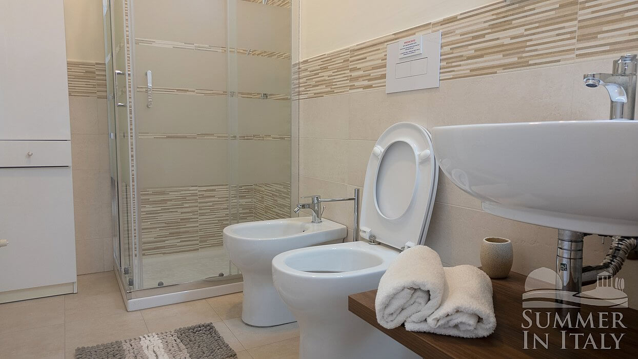 You will be able to enter the kitchen from the living room. It is equipped with a five-burner gas cooker and one electric burner, two gas ovens, a refrigerator with freezer, a dishwasher, a microwave oven, an Italian-style coffee-maker and an American-style coffee-maker. The dining table can accommodate ten guests. The kitchen has a Juliet balcony, and here you will also find a ceiling fan.