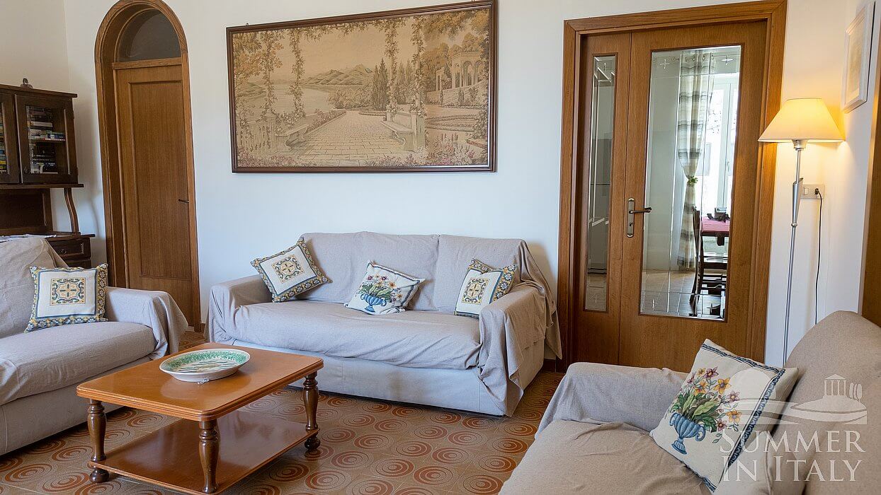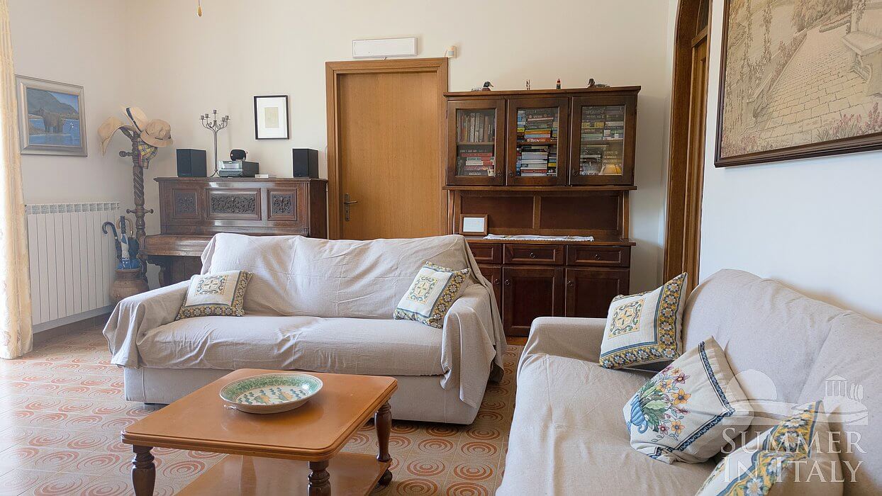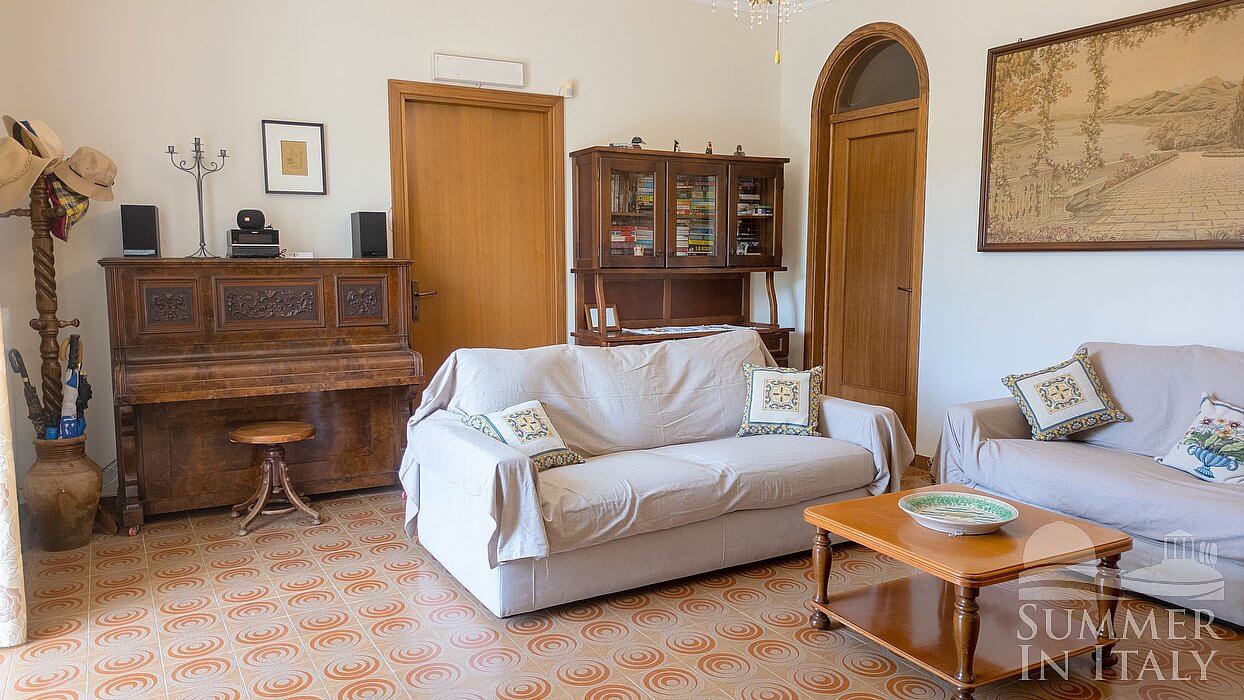 The living room is paved with tiles with inlaid designs. The furnishings are simple and comfortable, and include three sofas. In this room you will find an upright piano (please contact us before making your reservation if you plan to use the piano, as we need to make sure that it is in working order). In this room you will find a large flat-screen satellite television (local channels). From the living room you will be able to enter the terrace through a French door. Here you will also find a ceiling fan.