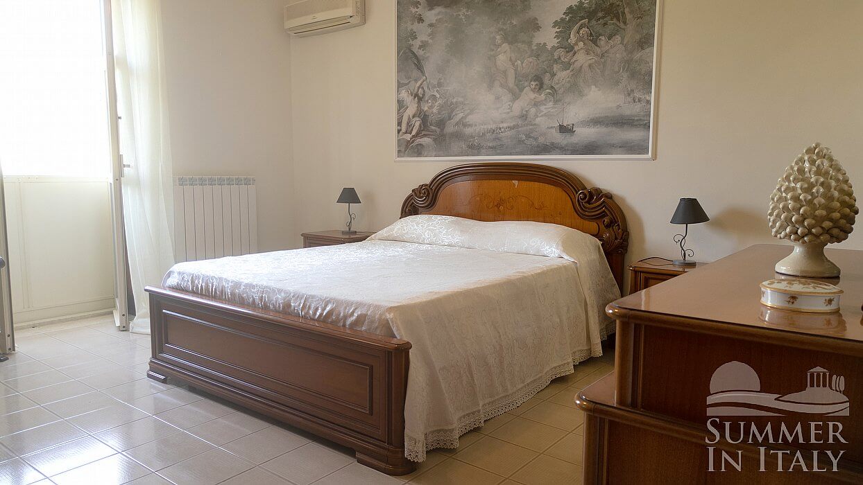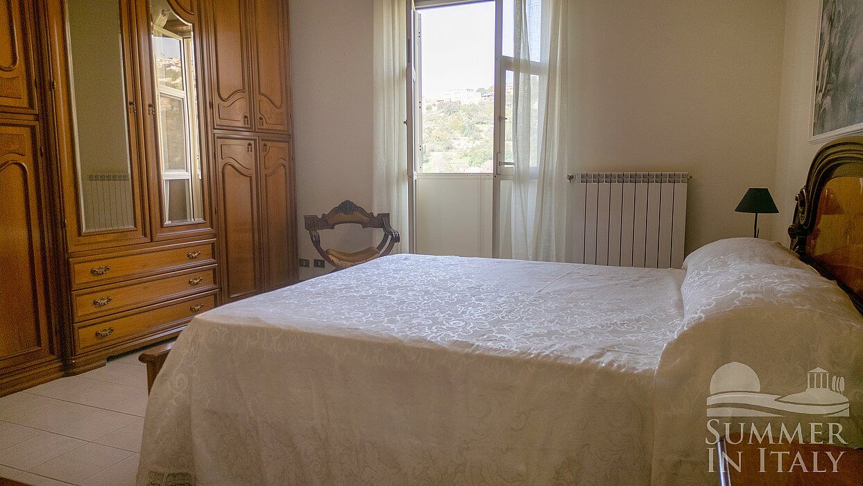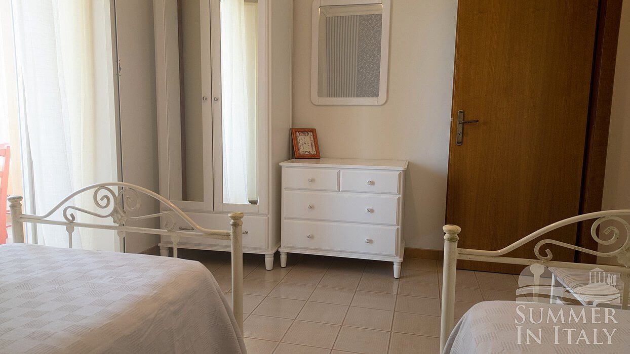 You will be able to enter the second bedroom from the living room. The bedroom has a matrimonial bed (160 cm/63 inches, wider than a queen-size bed). The furnishings include a bedroom chair. From the bedroom you will be able to enter the terrace through a French door. The bedroom is equipped with an air conditioning/heating unit, and you will also find a ceiling fan.