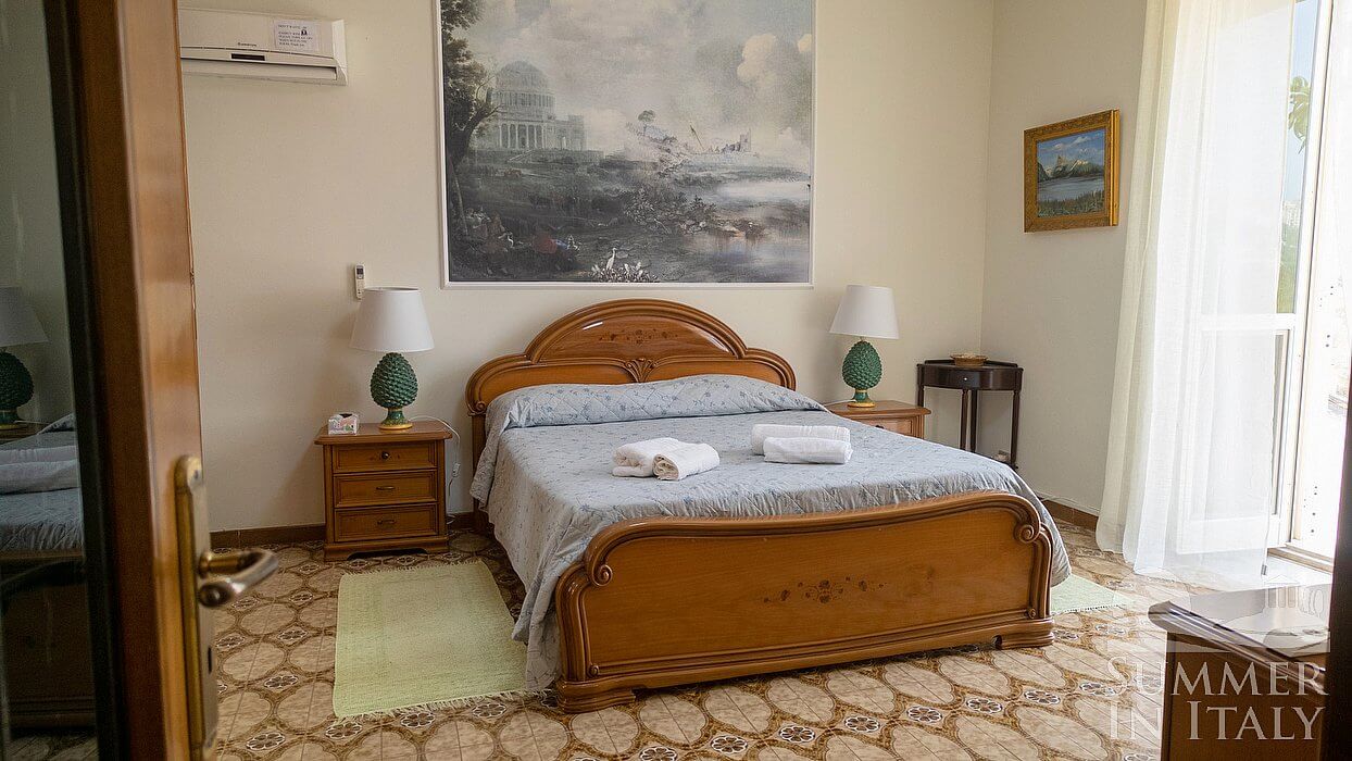 You will be able to enter the first bedroom through a corridor. The bedroom has a matrimonial bed (160 cm/63 inches, wider than a queen-size bed). The room has a Juliet balcony, and it's equipped with an air conditioning/heating unit, and you will also find a ceiling fan. This bedroom has an en-suite bathroom, equipped with a washbasin, a toilet, a fully enclosed shower and a hairdryer.