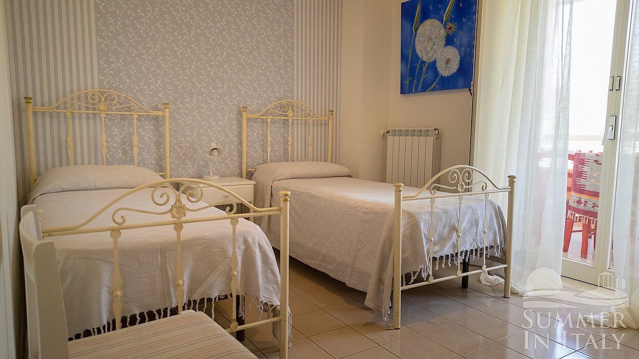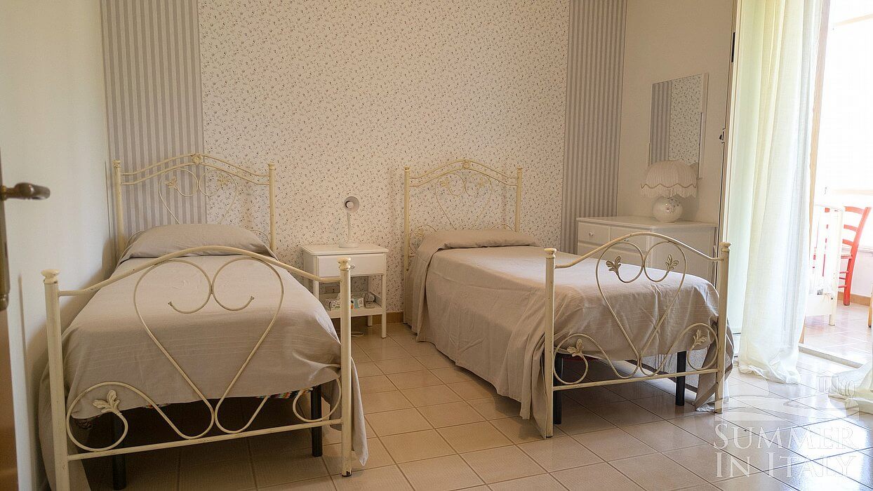 You will be able to enter the fifth bedroom from the second living room. It has two twin beds (80 cm/32 inches), that can be pushed together into a matrimonial bed if requested (please contact our staff in advance to make arrangements). The furnishings include a sofa. The room has a window, and it's equipped with an air conditioning/heating unit, and you will also find a ceiling fan. This bedroom has an en-suite bathroom, equipped with a washbasin, a toilet, a fully enclosed shower and a hairdryer. Here you will also find a washing machine.
