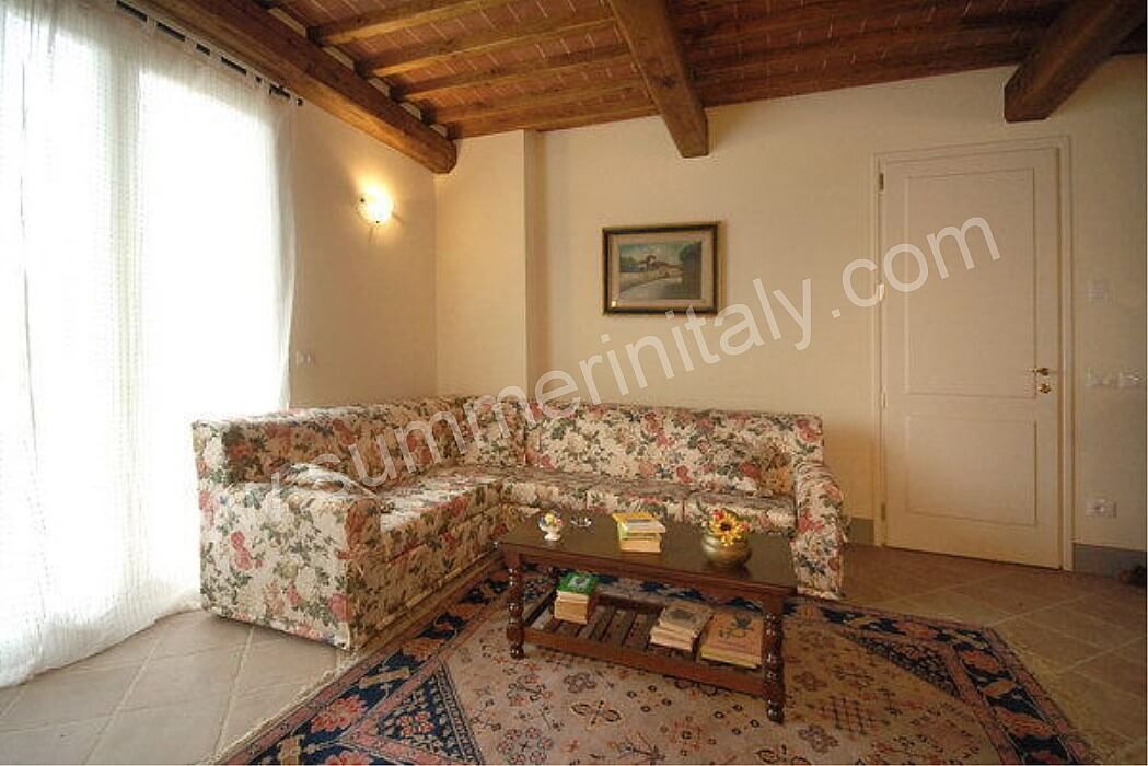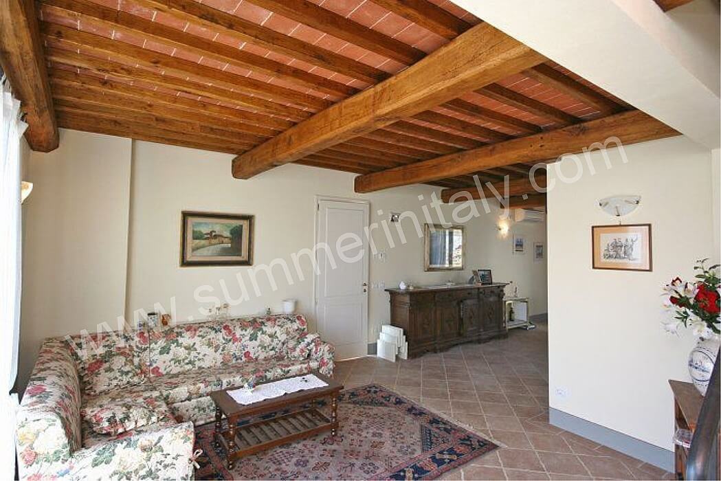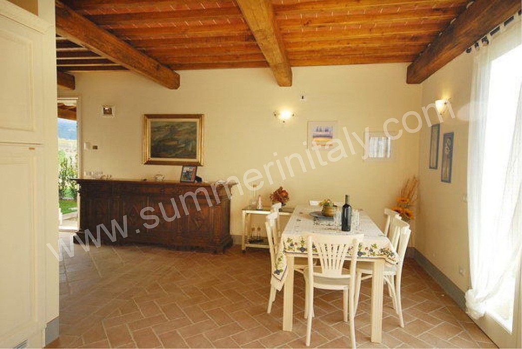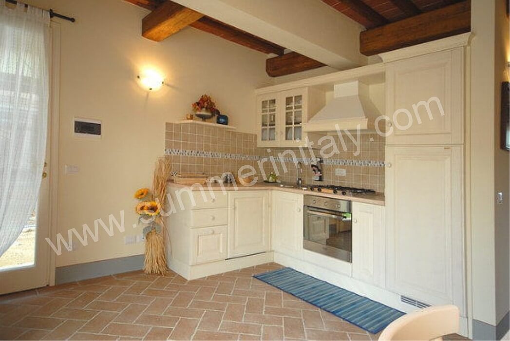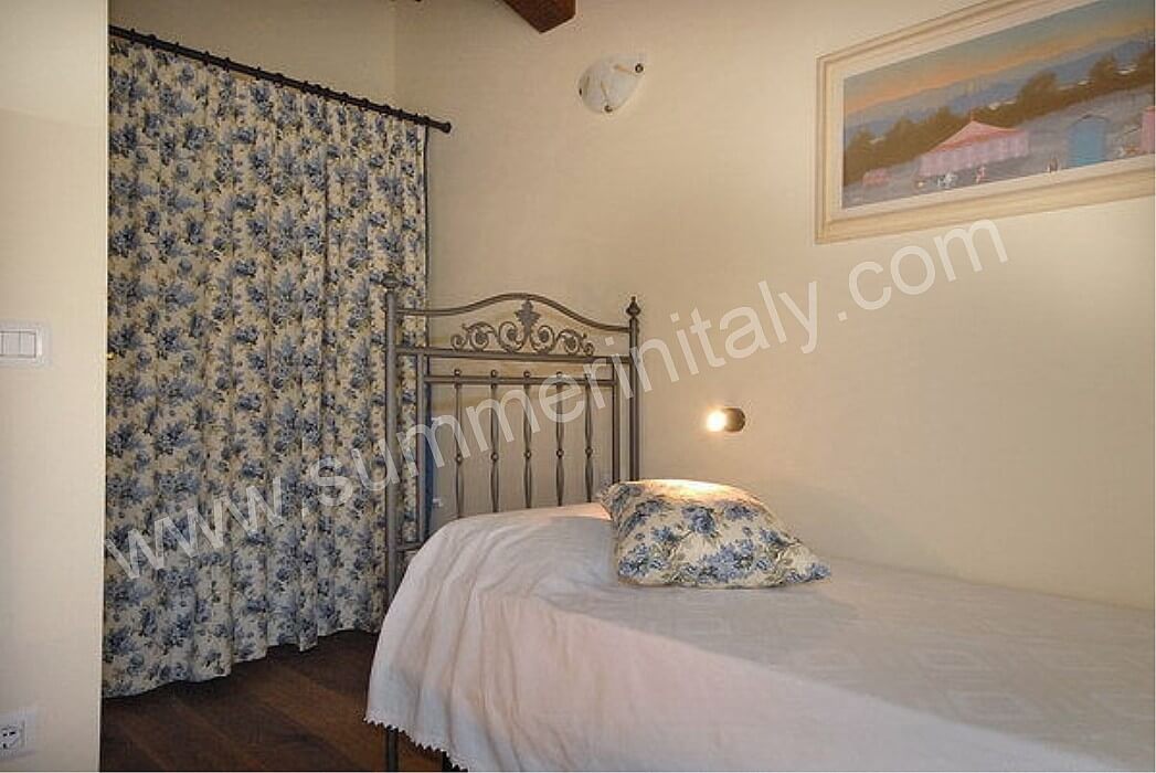 The living room is paved with Tuscan terracotta tiles. The ceiling has characteristic exposed wood beams. The furnishings are bright and agreeable. The furnishings include two sofas. In the living room you will also find a cooking area. The kitchenette is equipped with a four-burner gas cooker, an electric oven, a refrigerator with freezer, an Italian-style coffee-maker and other small appliances. The dining table can accommodate six guests. In this room you will find a television (local channels). From the living room you will be able to enter the garden and the swimming pool through three double-glazed French doors. The room is equipped with an air conditioning/heating unit.