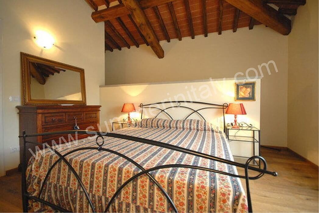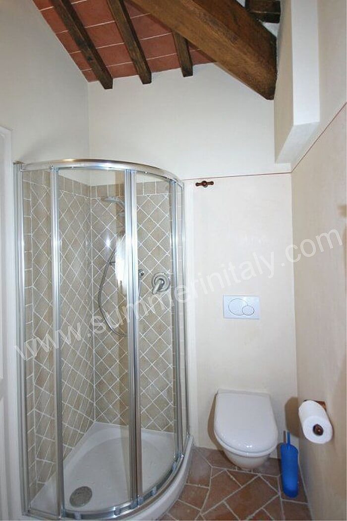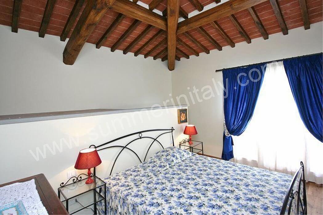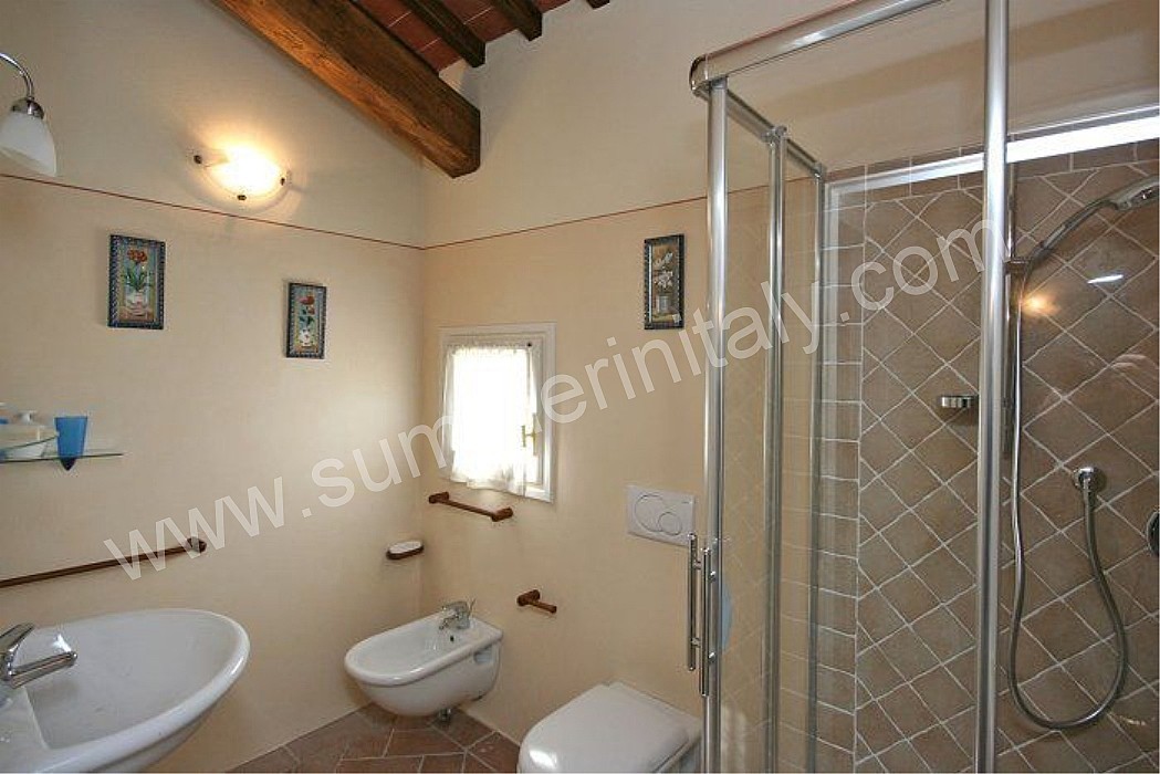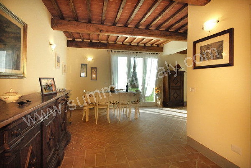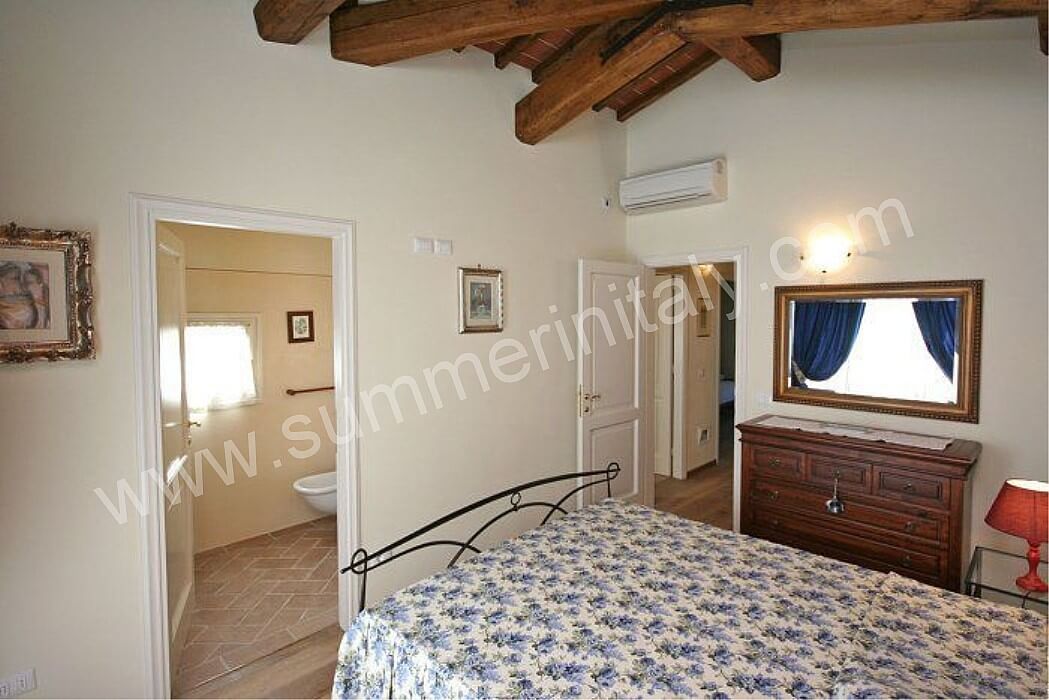 The living room is paved with Tuscan terracotta tiles. The ceiling has characteristic exposed wood beams. The furnishings are bright and agreeable. The furnishings include two sofas. In the living room you will also find a cooking area. The kitchenette is equipped with a four-burner gas cooker, an electric oven, a refrigerator with freezer, an Italian-style coffee-maker and other small appliances. The dining table can accommodate six guests. In this room you will find a television (local channels). From the living room you will be able to enter the garden and the swimming pool through three double-glazed French doors. The room is equipped with an air conditioning/heating unit.