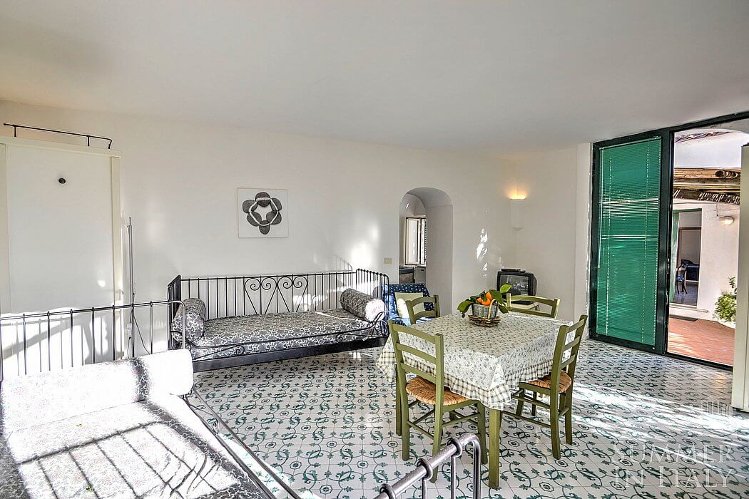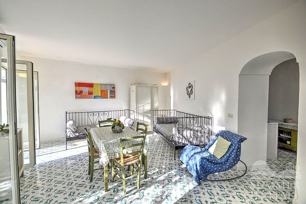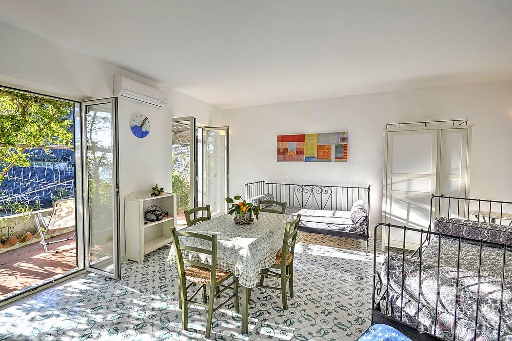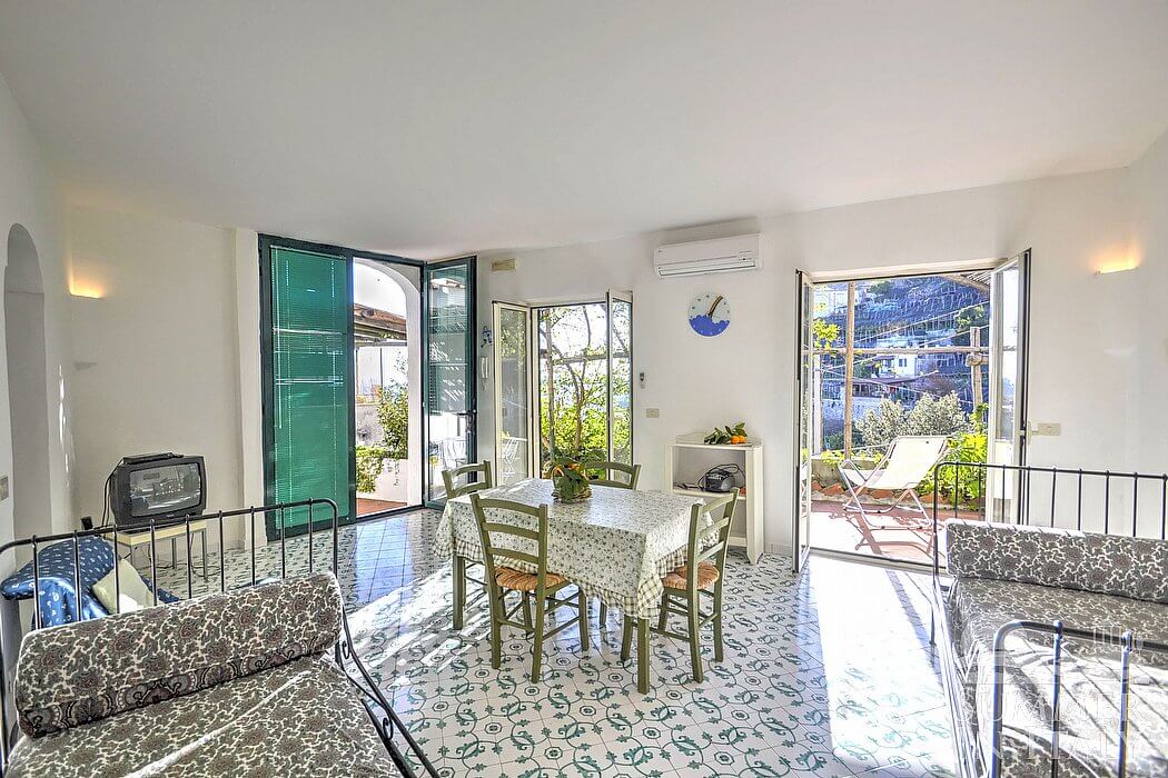 The living room is paved with tiles with handmade decoration, in the characteristic style of the Amalfi Coast. The furnishings are cozy and comfortable. The furnishings include an armchair and two single divan beds. In the living room you will also find a cooking area. The kitchenette is equipped with a four-burner gas cooker, an electric oven, a small refrigerator with freezer and an Italian-style coffee-maker. The dining table can accommodate four guests. In this room you will find a television (local channels) and a CD player with FM radio. From the living room you will be able to enter the first terrace with a view of the sea and of the coast of Amalfi through two double-glazed French doors. The room is equipped with an air conditioning/heating unit.