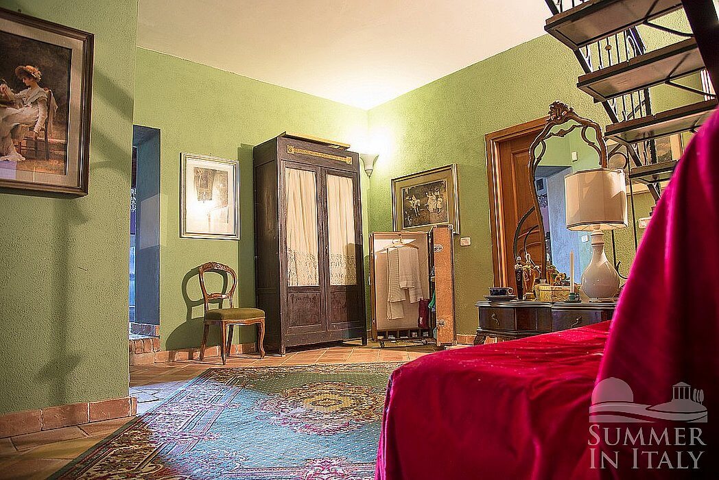 The second living room is paved with ancient terracotta tiles. The ceiling has characteristic exposed wood beams. The furnishings are elegant and refined, featuring some antique pieces, and include a sofa and an armchair. There is an impressive fireplace decorated with age-old majolica tiles. From the living room you will be able to enter the garden through a French door. The room also has two windows with a view of the garden.