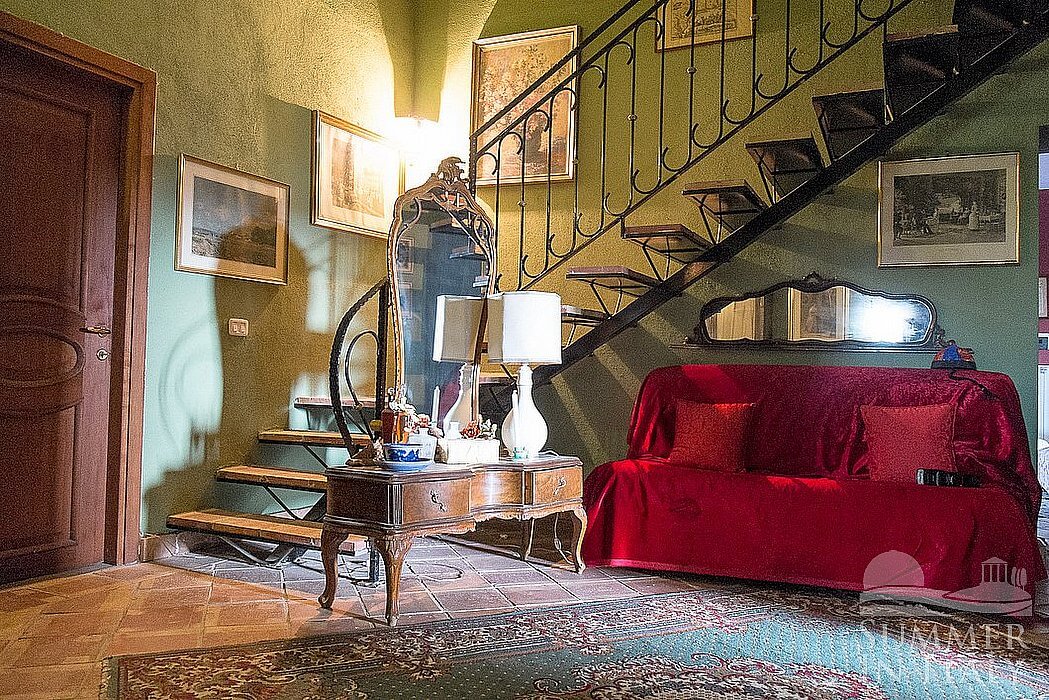 The first living room is paved with ancient terracotta tiles. The ceiling has characteristic exposed wood beams. The furnishings are elegant and refined, featuring some antique pieces, and include three sofas and two armchairs. In this room you will find a grand piano. There is an age-old and impressive fireplace decorated with age-old majolica tiles. From the living room you will be able to enter the garden through two French doors. The room also has a window with a view of the garden.
