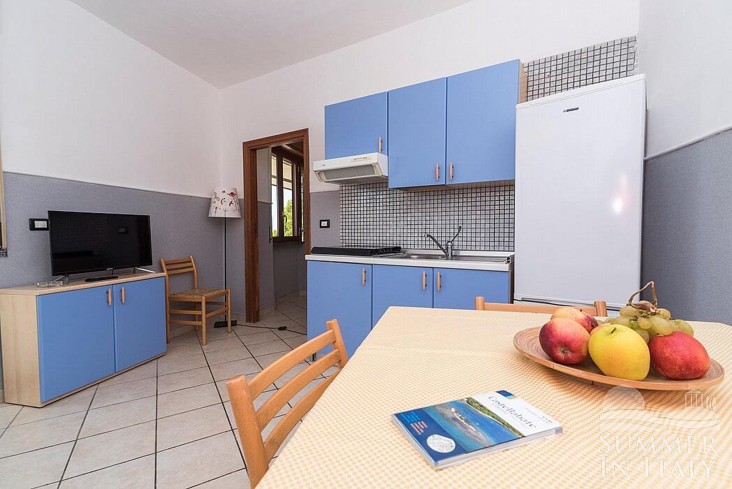 The furnishings of the living room are comfortable. The furnishings include a divan bed with a trundle bed to sleep two guests. In the living room you will also find a cooking area. The kitchenette is equipped with a four-burner gas cooker and a refrigerator with freezer. The dining table can accommodate four guests. In this room you will find a satellite television (local channels). From the living room you will be able to enter the terrace through a French door. The room is equipped with an air conditioning/heating unit.