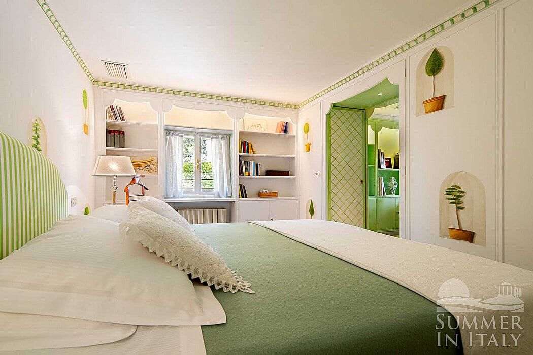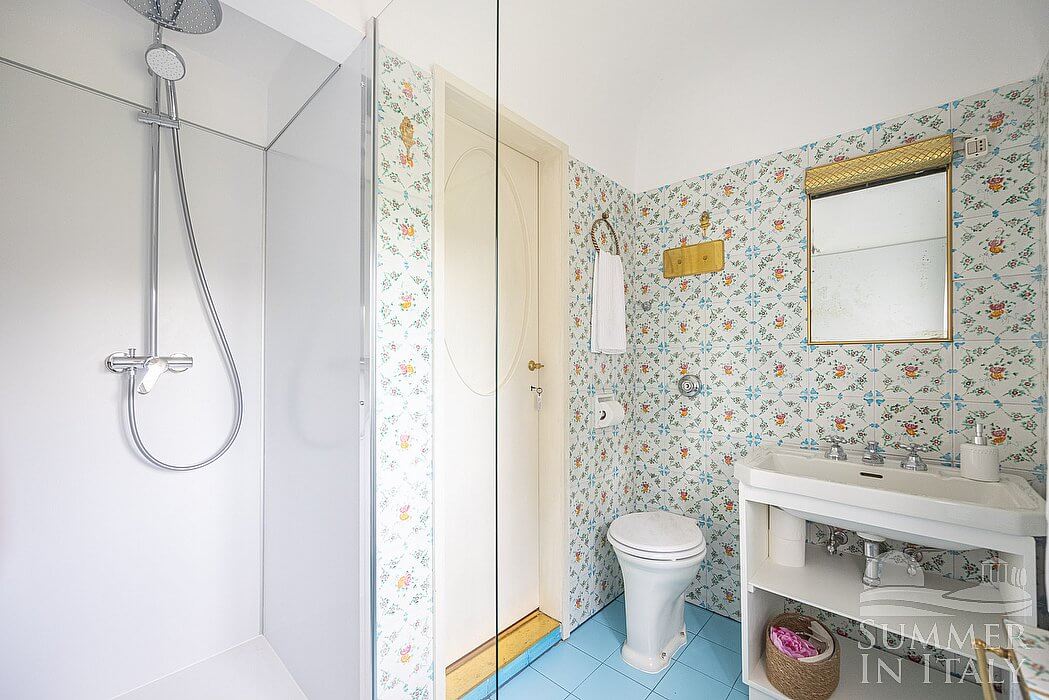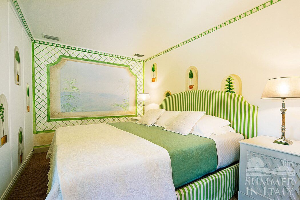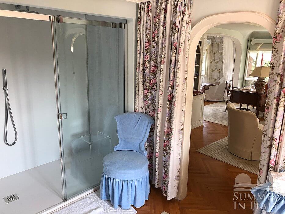 This suite is made up by three interconnected rooms: a sleeping area, a sitting area and a bathroom. You will be able to enter the fifth bedroom through an access area. The floor is paved with carpet. The room has a matrimonial bed (160 cm/63 inches, wider than a queen-size bed). The furnishings include an armchair, a divan bed for one guest and a desk. The room has two windows, and it's equipped with an air conditioning/heating unit. This bedroom has an en-suite bathroom, decorated with majolica tiles and equipped with a washbasin, a toilet, an open shower and a hairdryer.