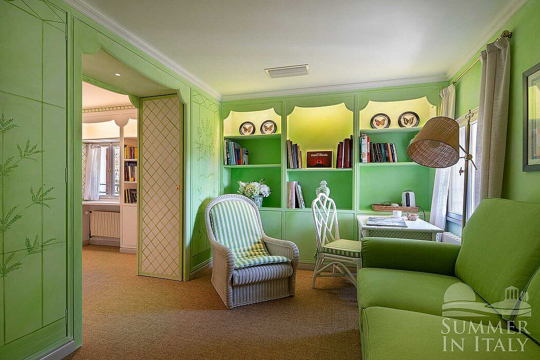 The second living room is paved with ancient Venetian mosaic. The ceiling has decorated exposed wood beams. The furnishings are elegant and refined, featuring some antique pieces, and include sofas and armchairs. From the living room you will be able to enter the second terrace through a French door. The room also has four windows.