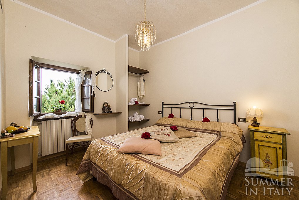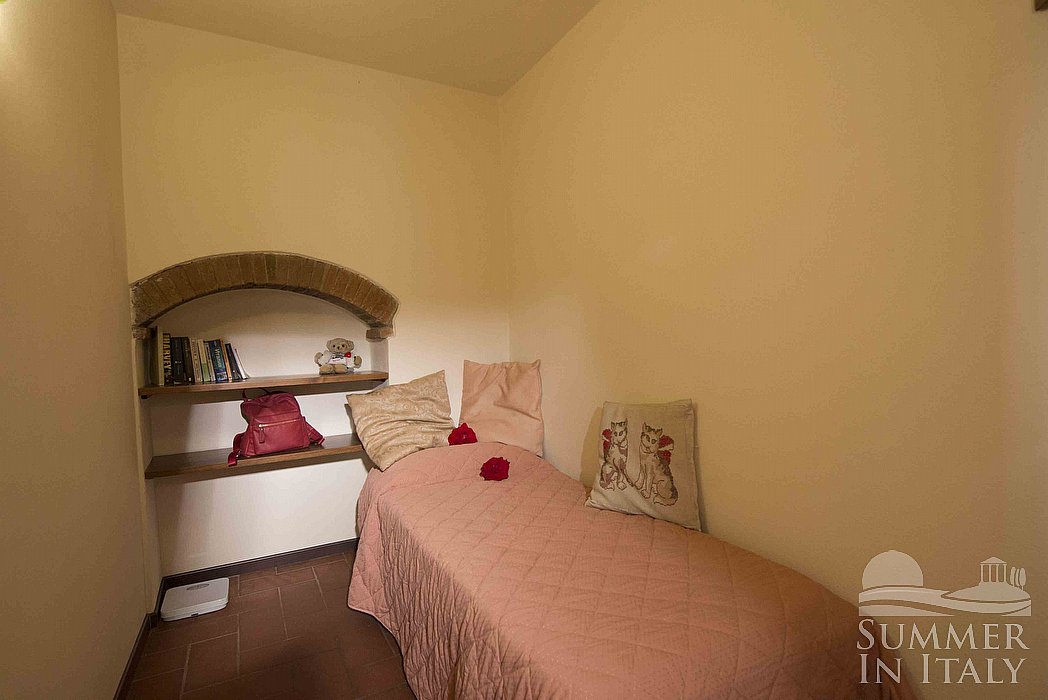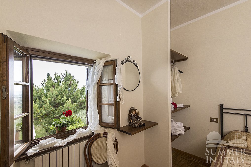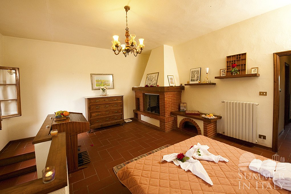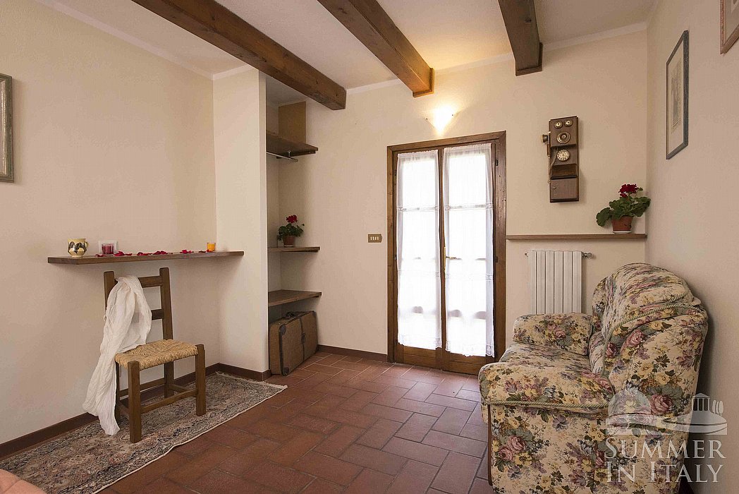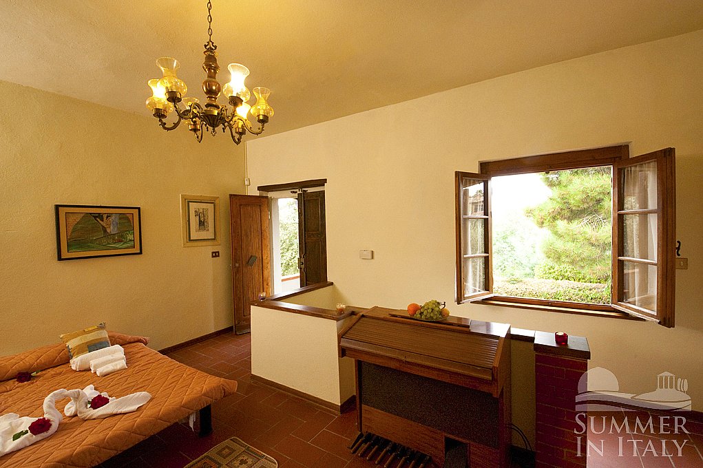 You will be able to enter the living room from the corridor or from another independent entrance along an external stairway, climbing 16 steps. The floor is paved with Tuscan terracotta tiles. The furnishings are warm and welcoming, and include some antique pieces. The furnishings include a divan that unfolds into a double bed. There is an elegant fireplace made of bricks. In this room you will find a television (local channels). The room has two windows with a view of the garden and of the surrounding green fields.