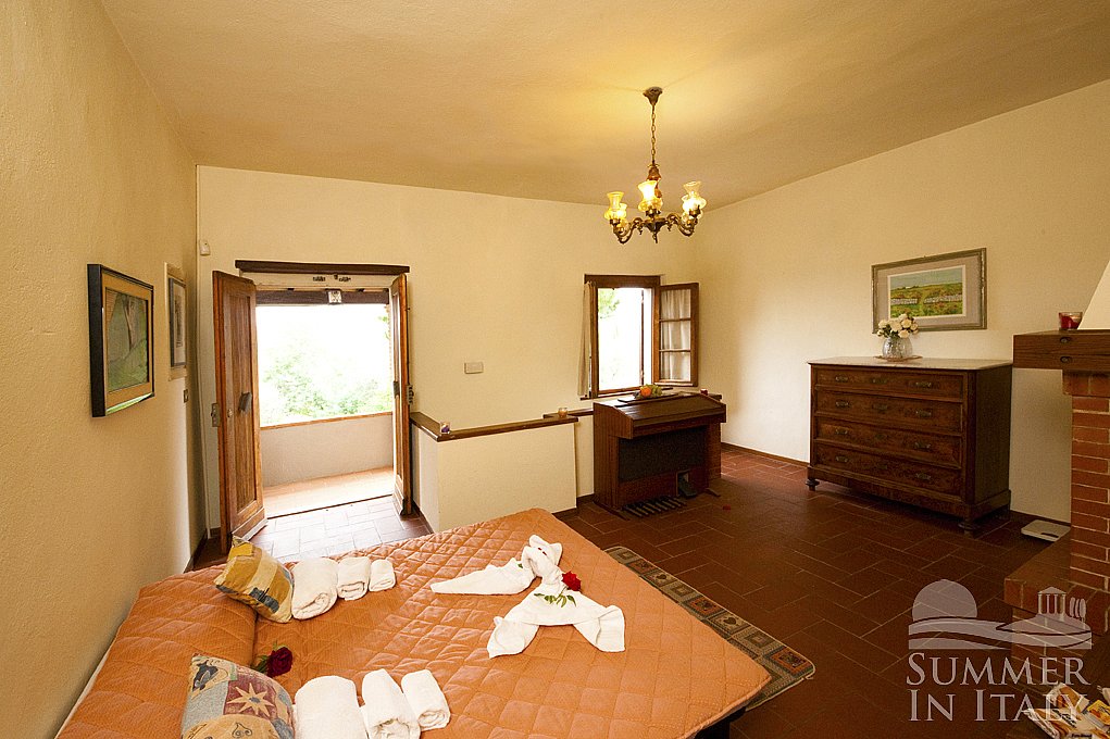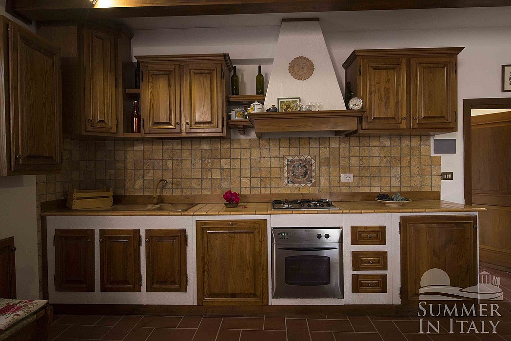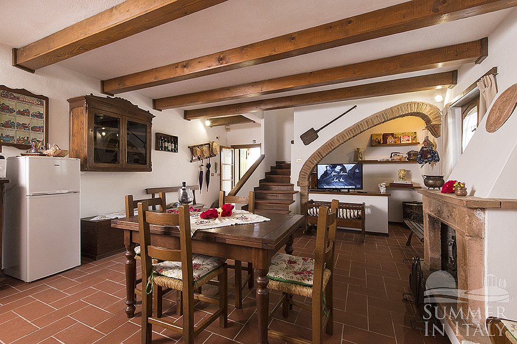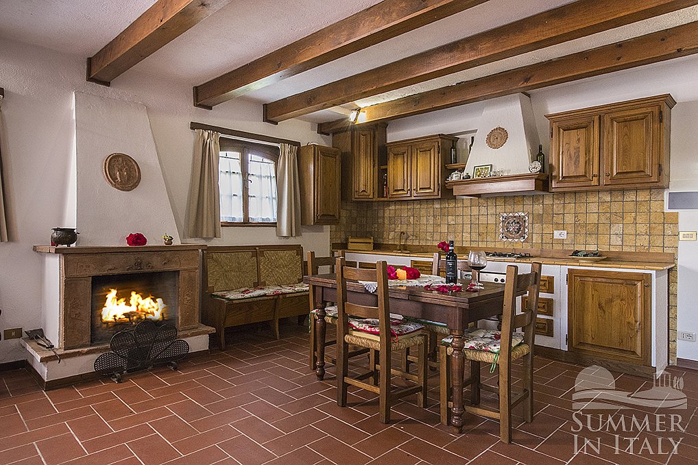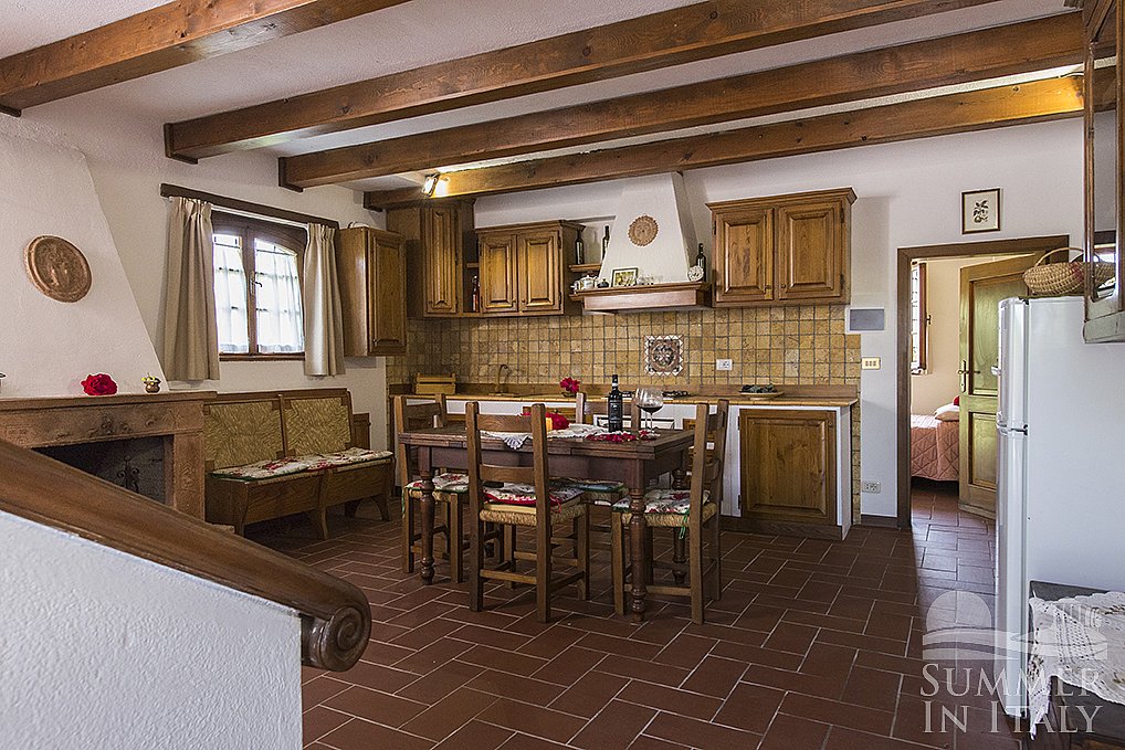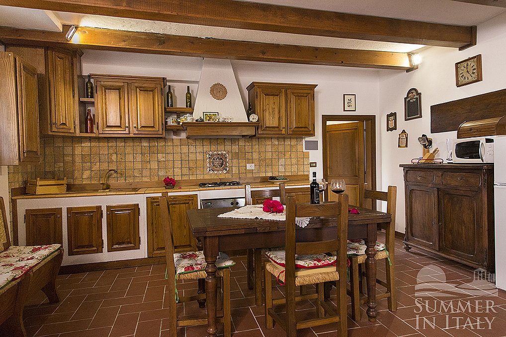 The kitchen is paved with Tuscan terracotta tiles. The ceiling has characteristic exposed wood beams. It is spacious and comfortable, equipped with a four-burner gas cooker, an electric oven, a refrigerator with freezer, a microwave oven, an Italian-style coffee-maker, an American-style coffee-maker (bring your filters!), a toaster and other small appliances. There is a fireplace. There is a table to seat eight guests. The kitchen is also equipped with a satellite television (local channels). From the kitchen a French door will take you to the garden and the swimming pool. The room has two windows with a view of the countryside.