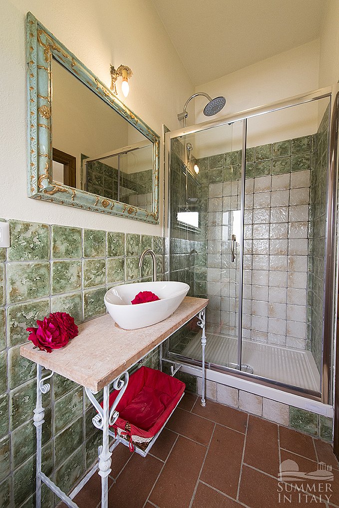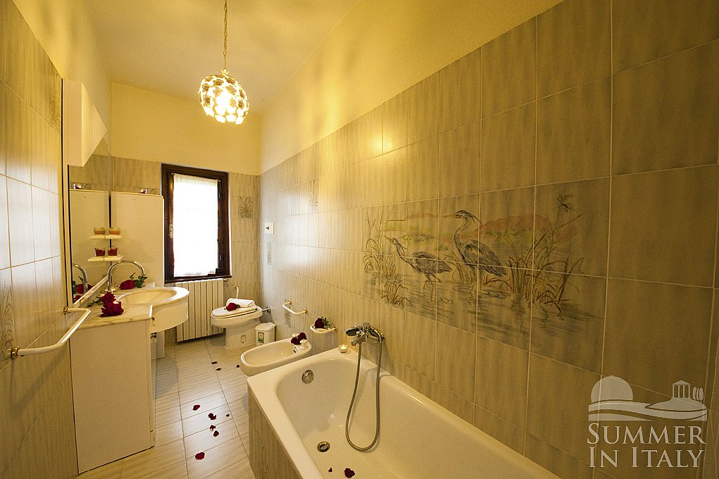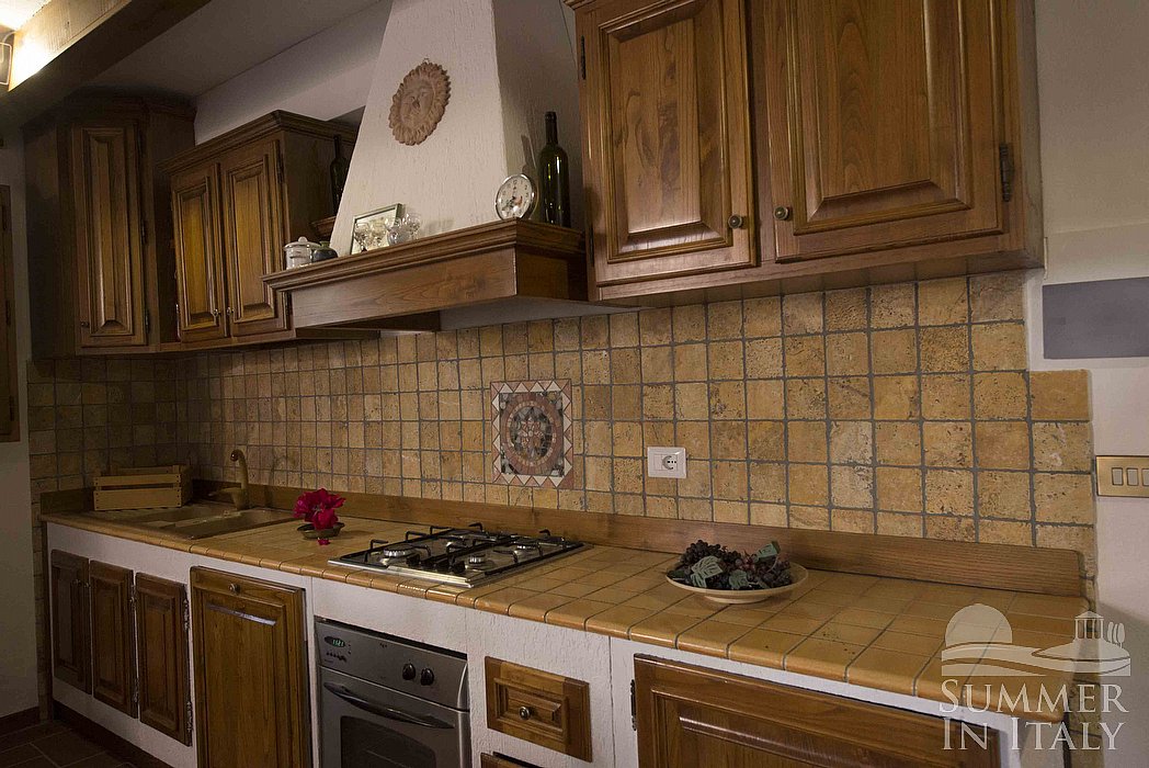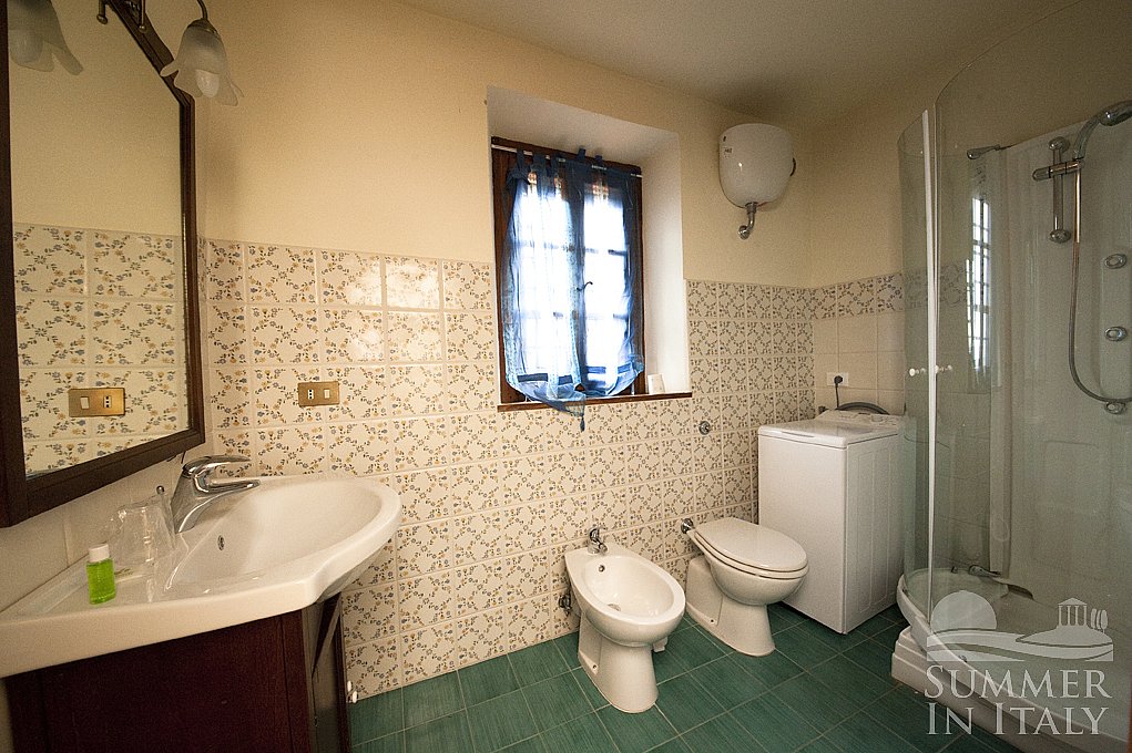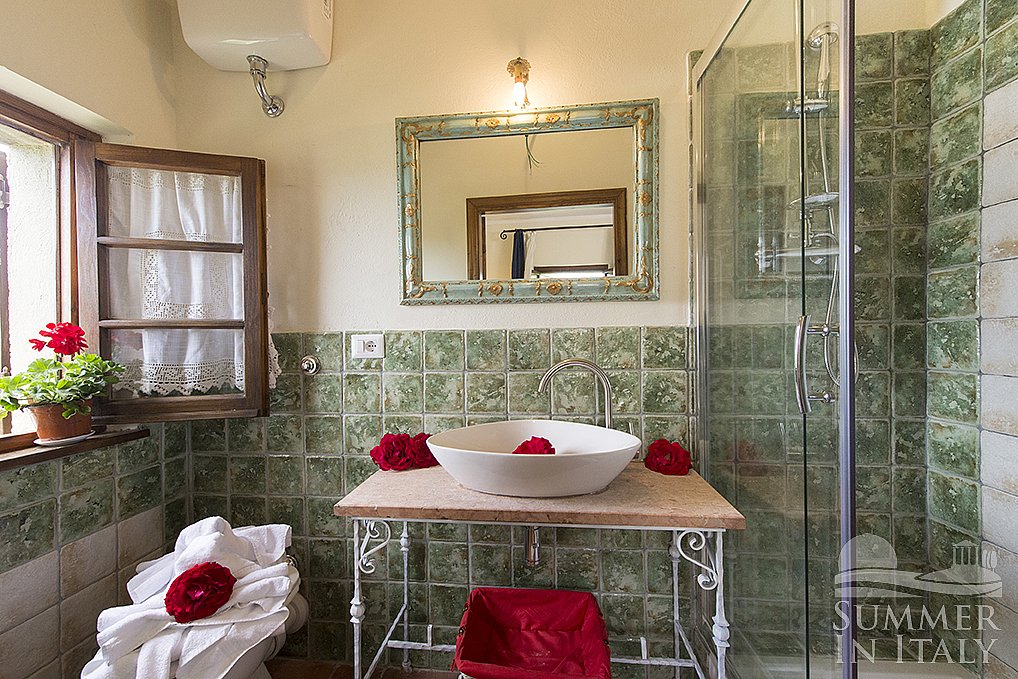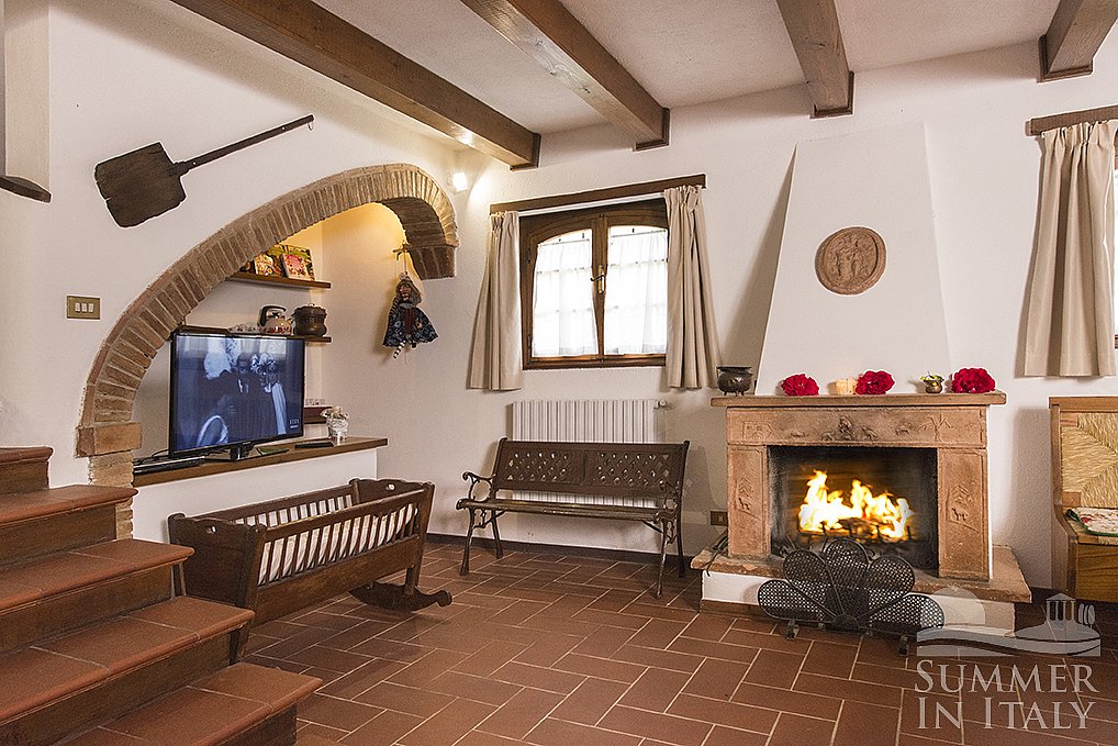 The kitchen is paved with Tuscan terracotta tiles. The ceiling has characteristic exposed wood beams. It is spacious and comfortable, equipped with a four-burner gas cooker, an electric oven, a refrigerator with freezer, a microwave oven, an Italian-style coffee-maker, an American-style coffee-maker (bring your filters!), a toaster and other small appliances. There is a fireplace. There is a table to seat eight guests. The kitchen is also equipped with a satellite television (local channels). From the kitchen a French door will take you to the garden and the swimming pool. The room has two windows with a view of the countryside.