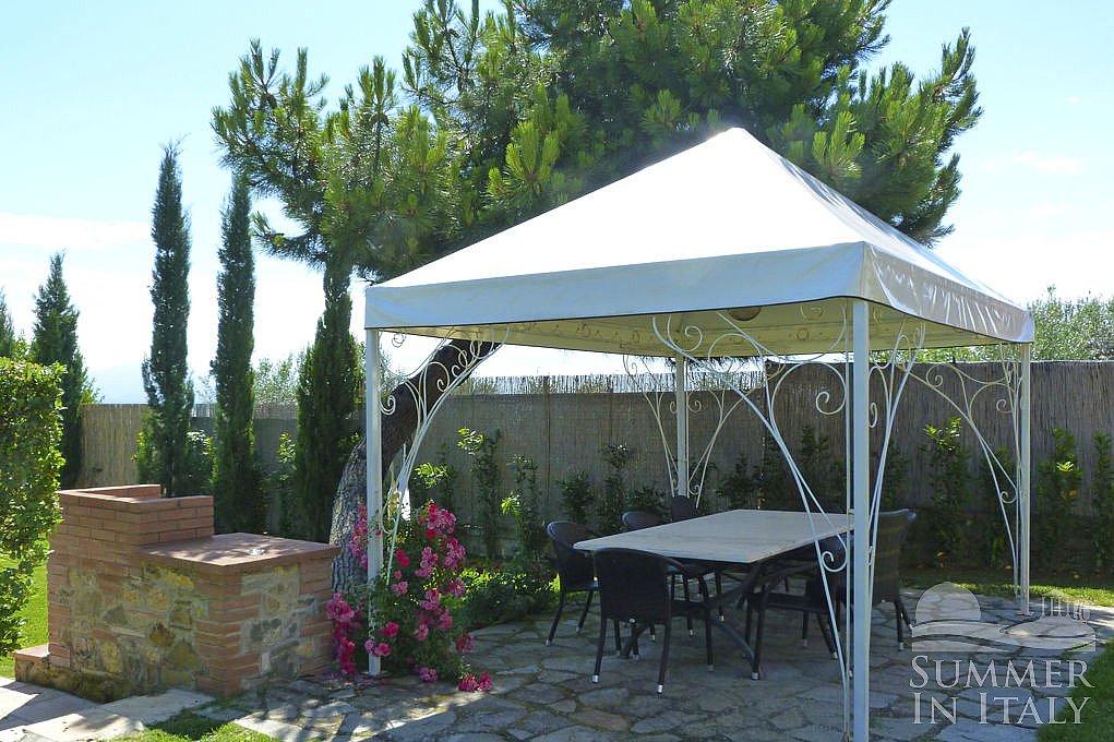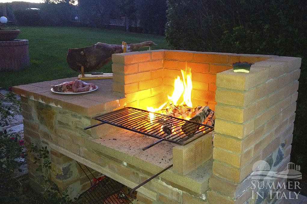 The garden is 1000 square meters (10800 square feet) large. It features an above-ground Jacuzzi pool with hydromassage (2 by 2 meters, 6.5 by 6.5 feet). It is equipped with tables, chairs, deck chairs, sun loungers and a gazebo. Here you will also find a brickwork barbecue and a small wood-fired pizza oven.