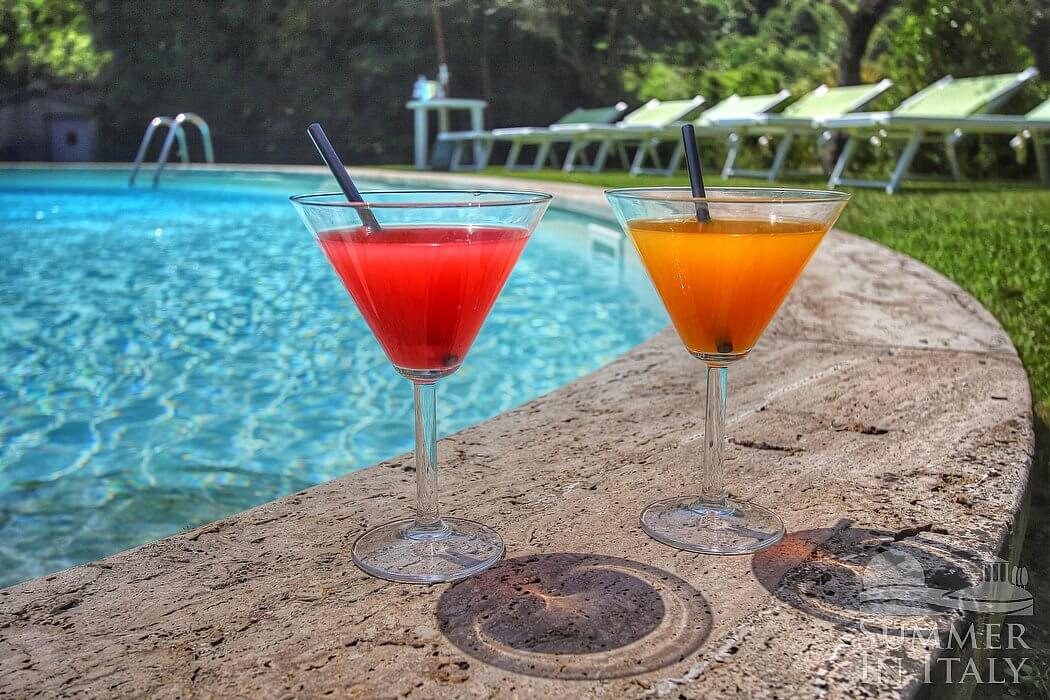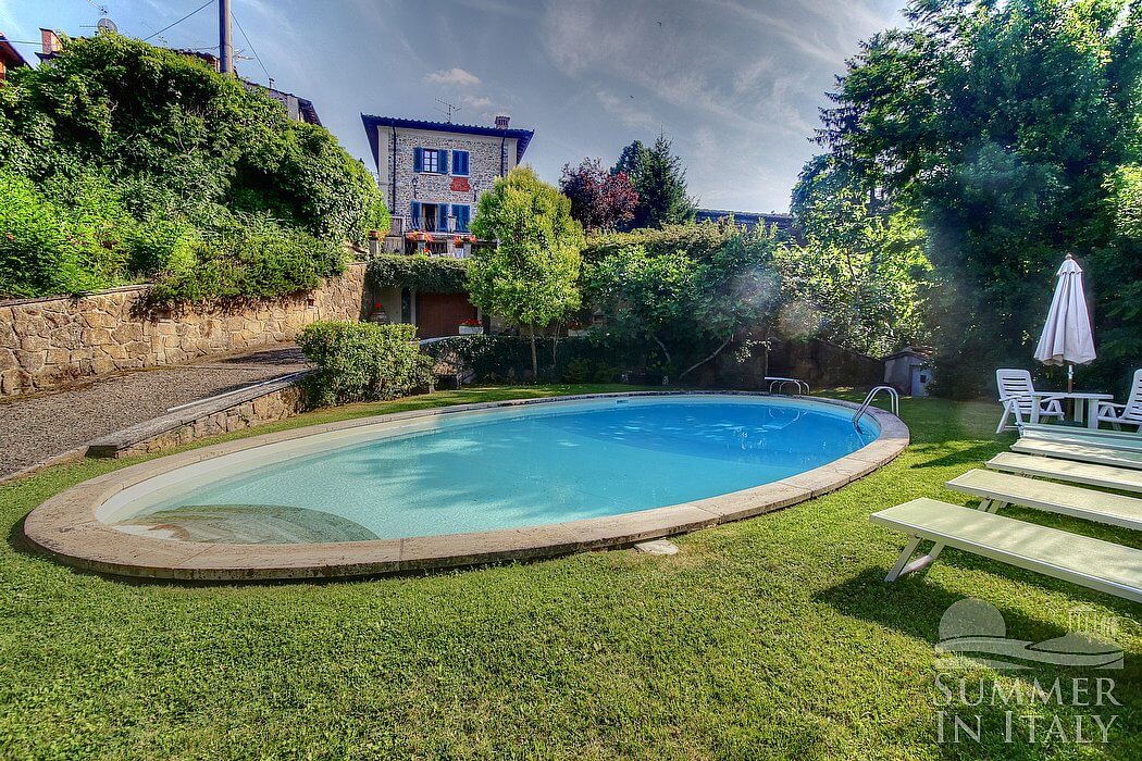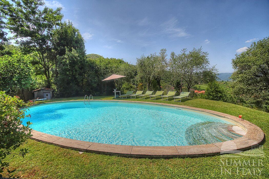 You will reach the swimming pool from the villa going down a walkway that cuts through the terrace and includes approximately 30 stairway steps. The pool is 7 meters (23 feet) large by 14 meters (46 feet) long, from 1.20 meter (4 feet) to 2.60 meters (8.5 feet) deep. The swimming pool has a circular shape. The area is equipped with a table, chairs, sun loungers and an external shower. From the swimming pool you will enjoy a pleasant view of the valley and of the hills. The pool is open from the beginning of May until the end of October.