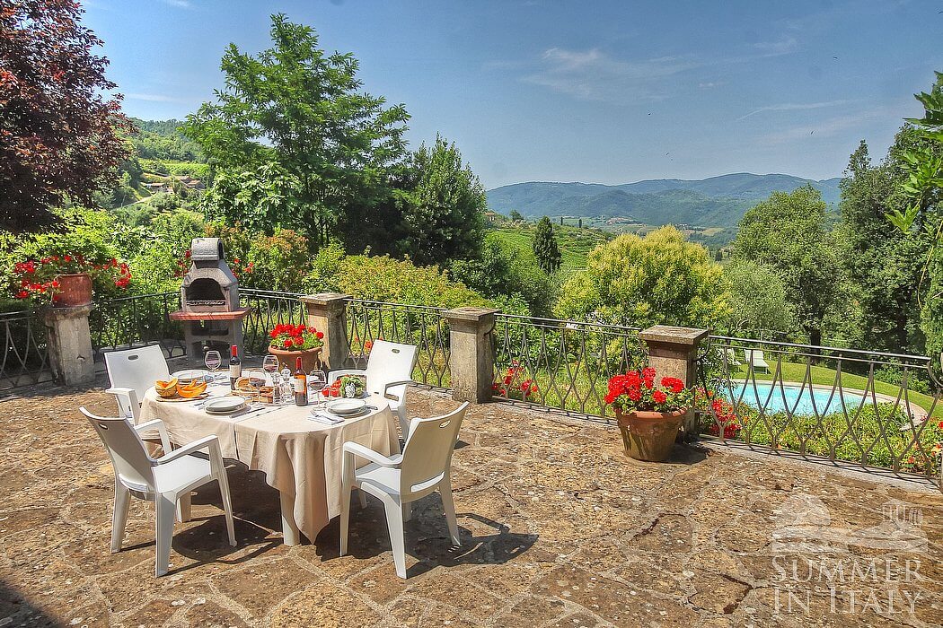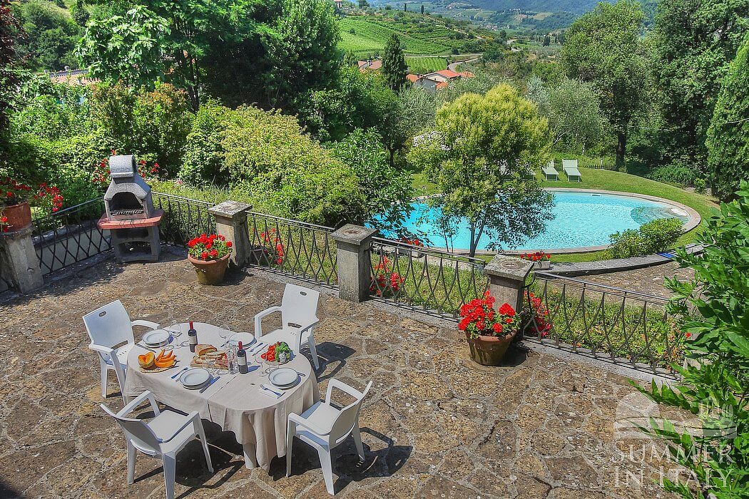 The terrace is 50 square meters (540 square feet) large. You will reach it from the living room going down a route that includes approximately 15 stairway steps. It is partly shaded by a porch. It is equipped with a table and chairs. Here you will also find a brickwork barbecue. From the terrace you will enjoy a splendid view of the swimming pool and of the garden and of the vineyards.