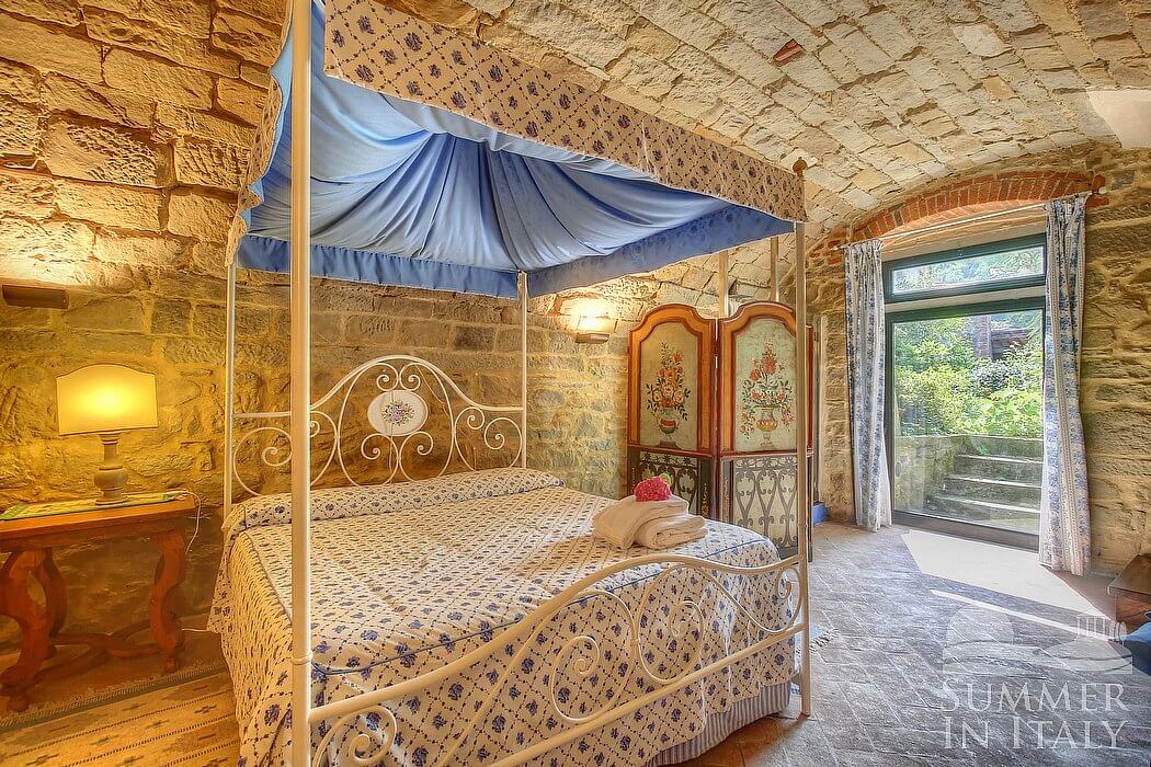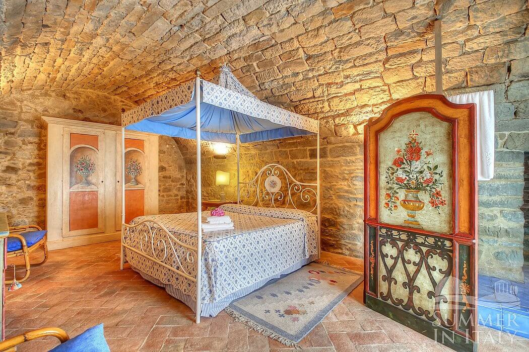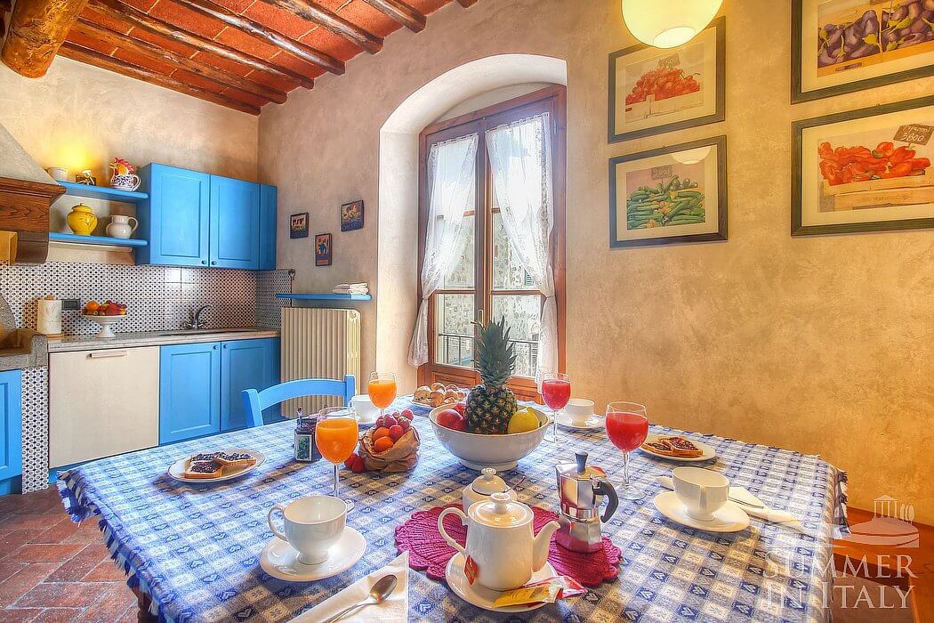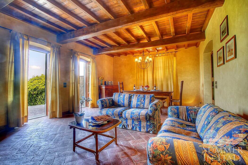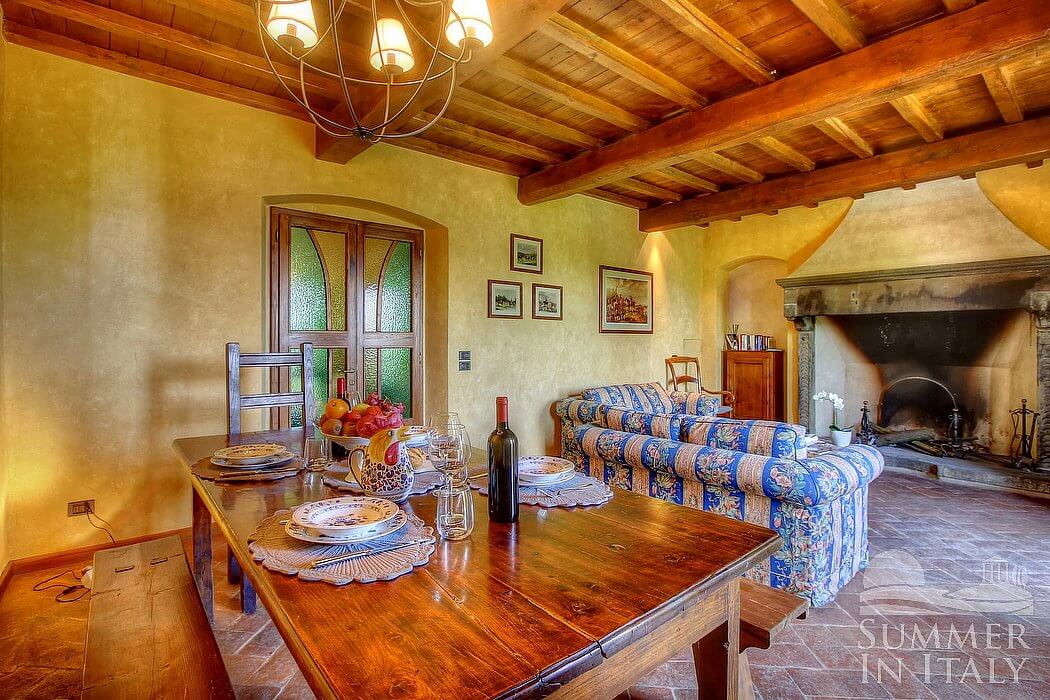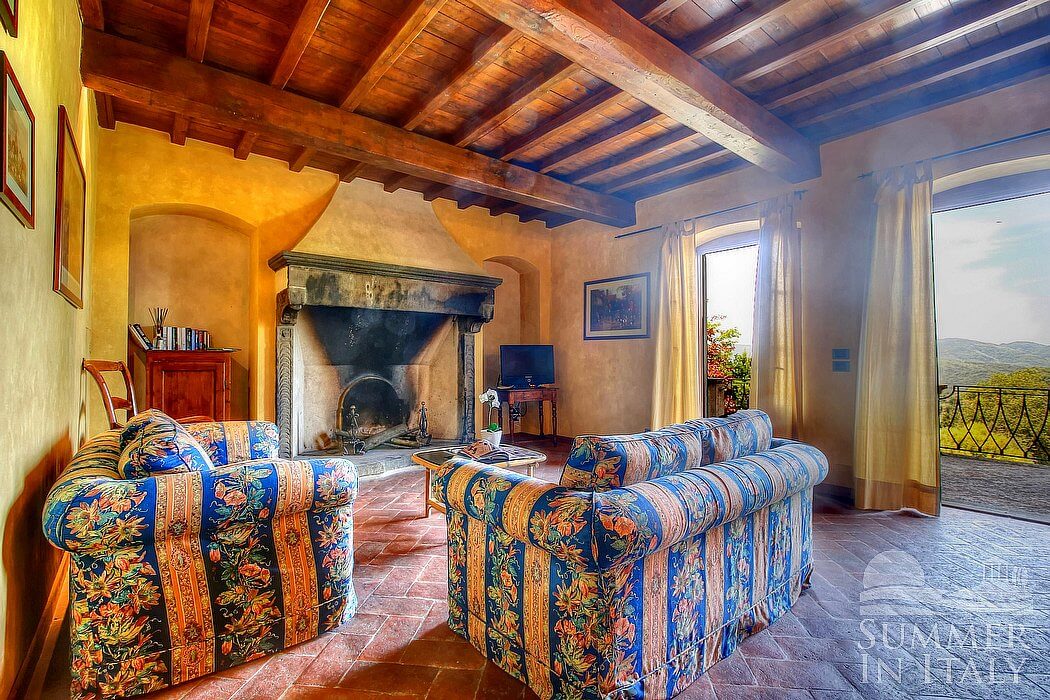 You will be able to enter the living room from the corridor. The furnishings are rural and characteristic of the Tuscan house, and include two sofas. There is a big and age-old fireplace. The dining table can accommodate six guests. In this room you will find a flat-screen satellite television (local channels). From the living room you will be able to enter a terrace through two French doors.