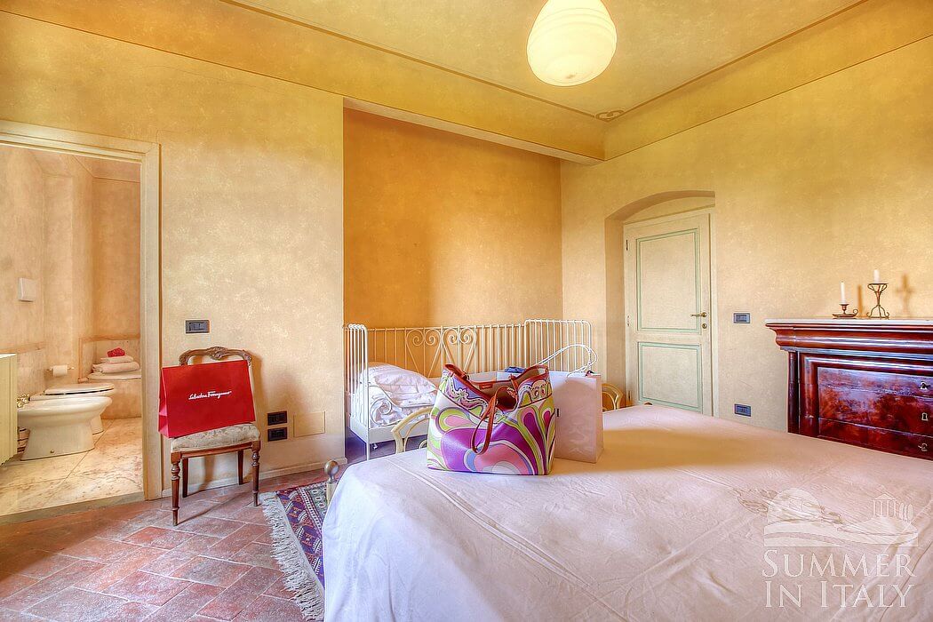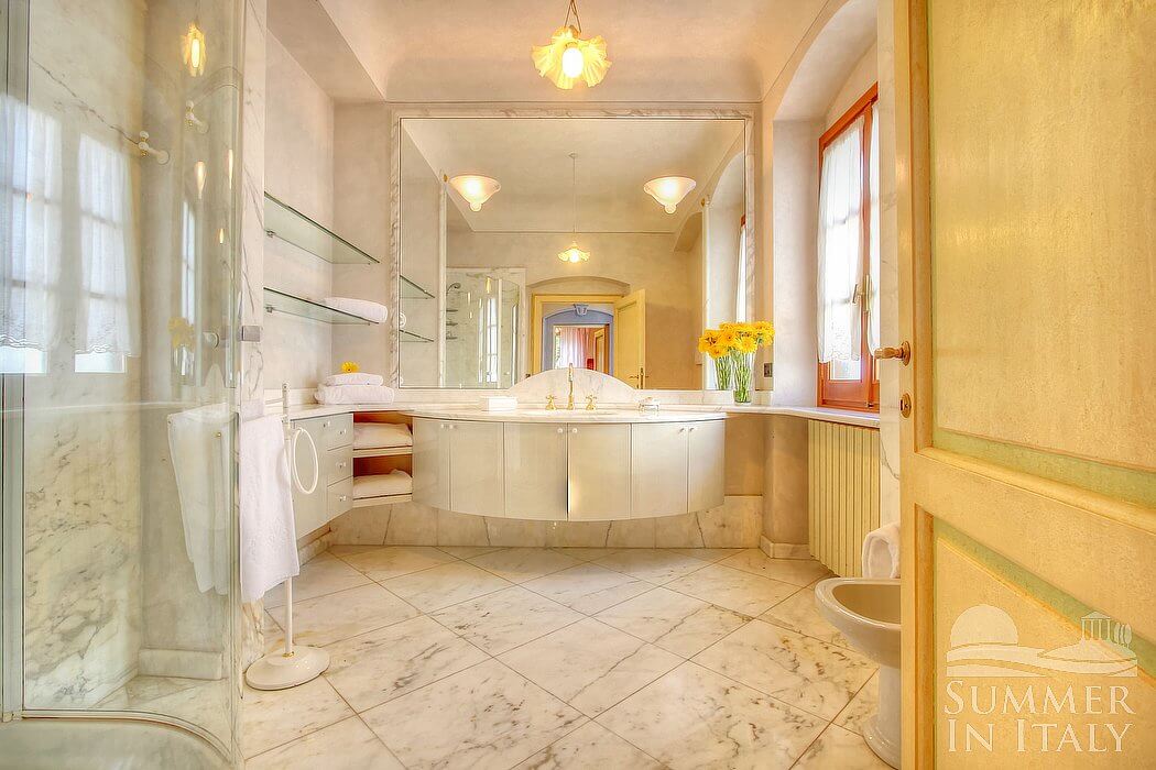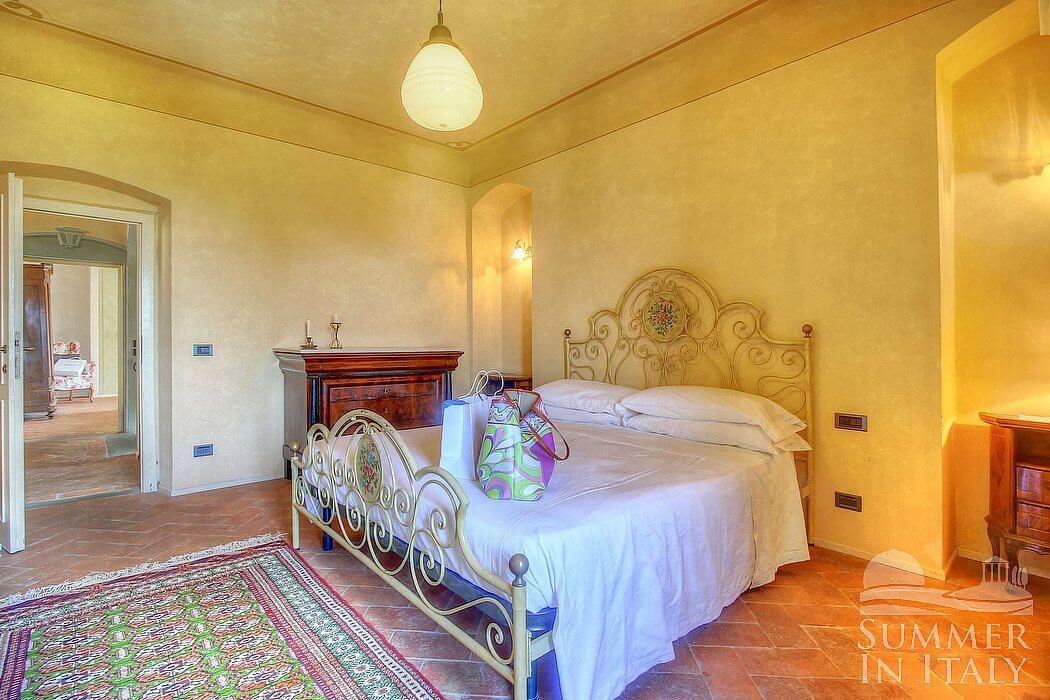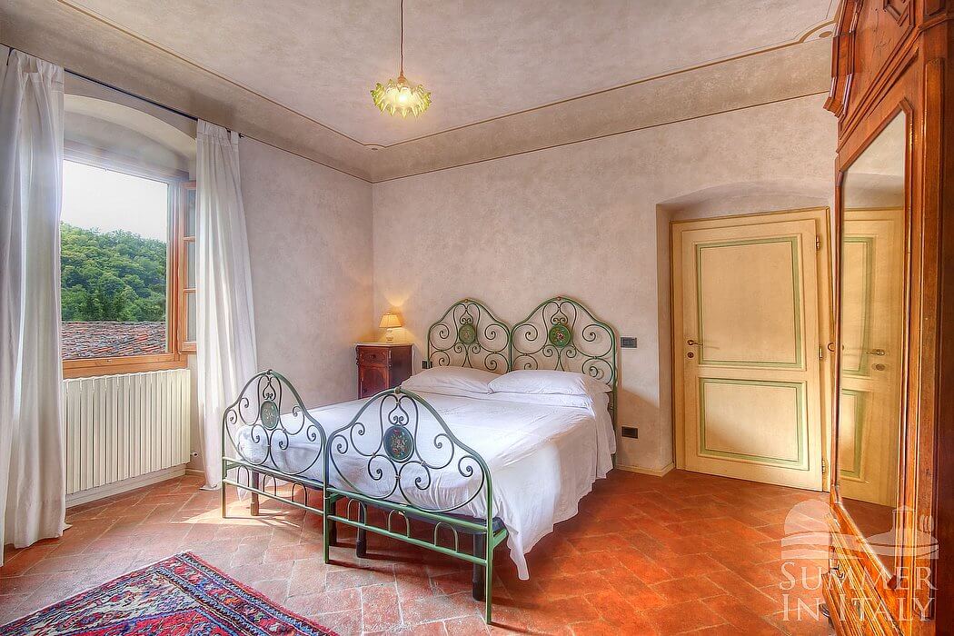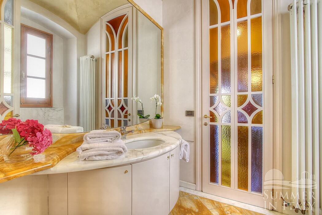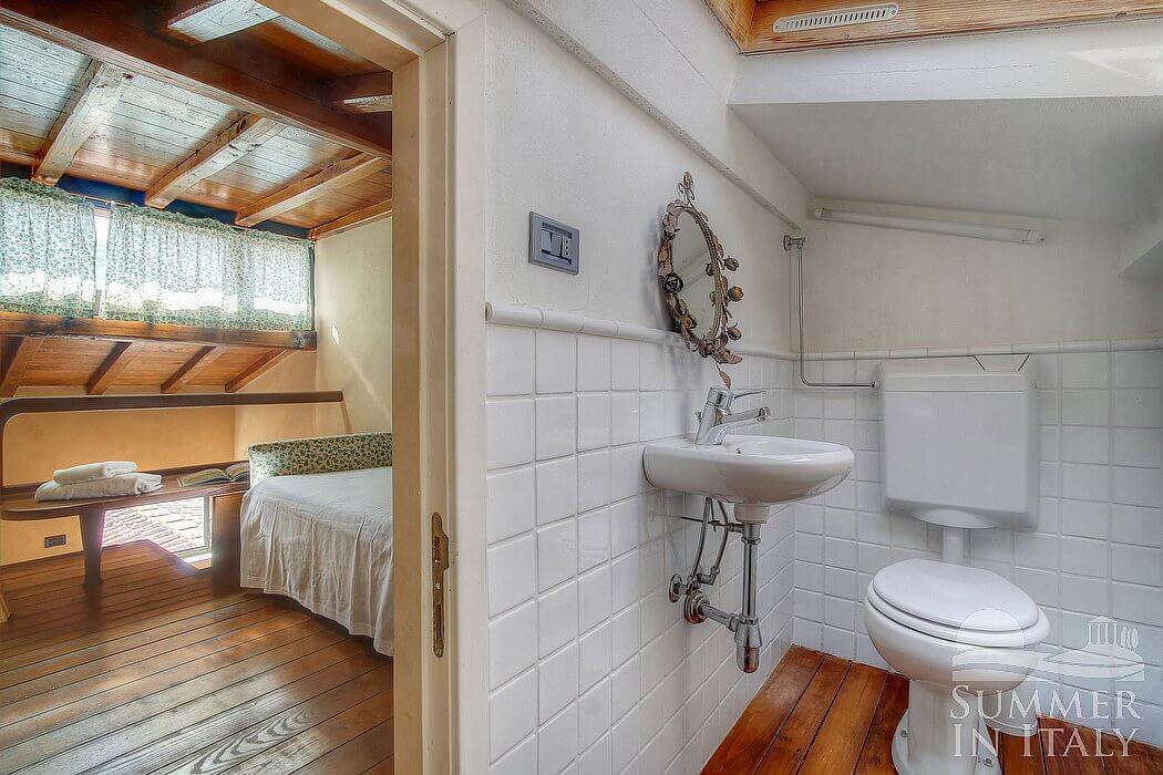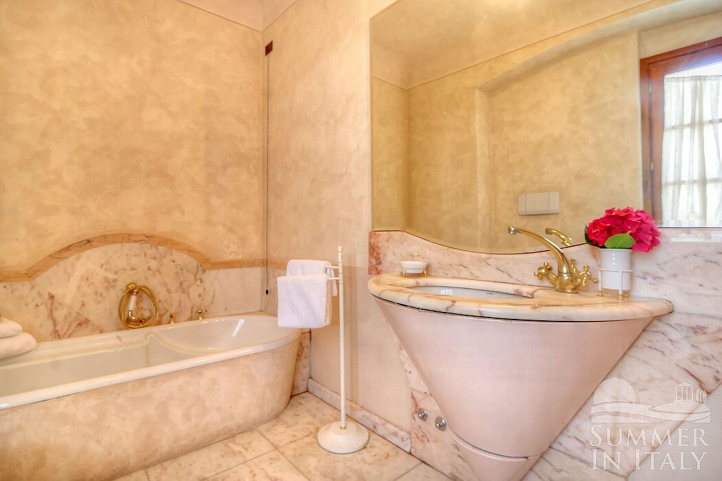You will be able to enter the first bedroom from the corridor. The bedroom has a wrought iron matrimonial bed (160 cm/63 inches, wider than a queen-size bed) and a single bed (80 cm/32 inches). The room has a window. This bedroom has an en-suite bathroom, made of lucid majolica tiles and marble and equipped with a washbasin, a toilet and a bathtub with shower wand.