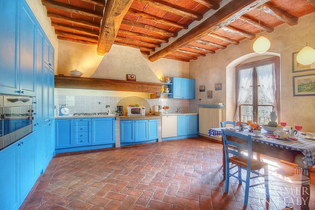 You will be able to enter the kitchen from the corridor. It is equipped with a five-burner gas cooker, an electric oven, a refrigerator with freezer, a dishwasher, a microwave oven, an Italian-style coffee-maker and an American-style coffee-maker. The dining table can accommodate eight guests. The kitchen has a Juliet balcony.
