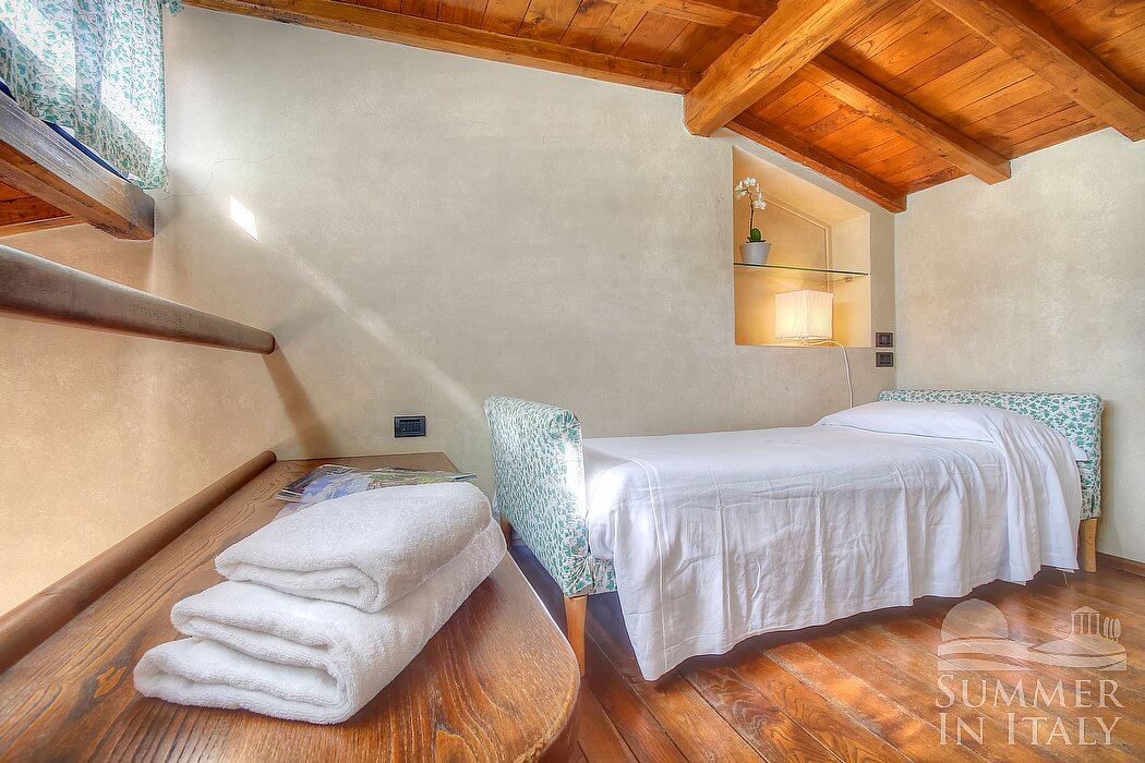 You will be able to enter the third bedroom from the corridor. It has two twin beds (80 cm/32 inches), that can be pushed together into a matrimonial bed if requested (please contact our staff in advance to make arrangements). There is an age-old fireplace, for decorative purposes only. The room has a window overlooking the gardens of the surrounding houses.
