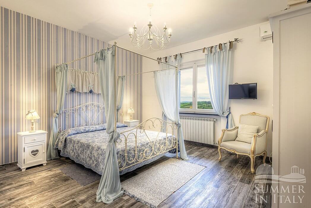 You will be able to enter the second bedroom through a corridor. The floor is paved with wood. The room has a matrimonial bed (160 cm/63 inches, wider than a queen-size bed). The furnishings include a bedroom chair and an upholstered fabric bench. From the bedroom you will be able to enter the long terrace through a French door. The bedroom is equipped with an air conditioning/heating unit.