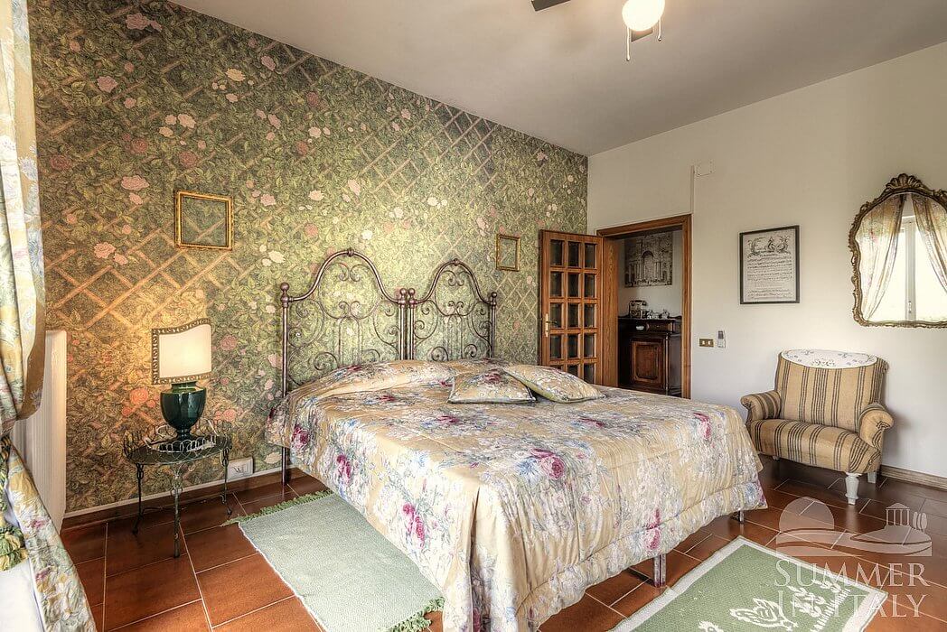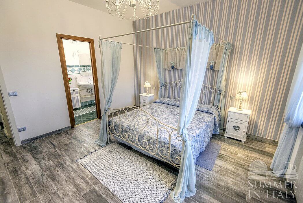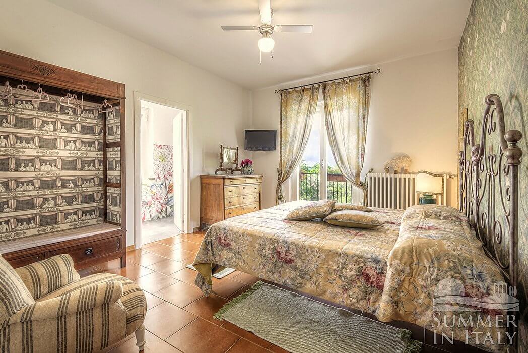 You will be able to enter the fourth bedroom through a corridor. The floor is paved with terracotta tiles. The room has a matrimonial bed (160 cm/63 inches, wider than a queen-size bed), that can be split into twins if requested (please contact our staff in advance to make arrangements). The furnishings include an armchair. In this room you will find a satellite television (local channels). From the bedroom you will be able to enter a balcony through a French door. Here you will also find a ceiling fan. This bedroom has an en-suite bathroom, equipped with a washbasin, a toilet, a fully enclosed shower and a hairdryer.