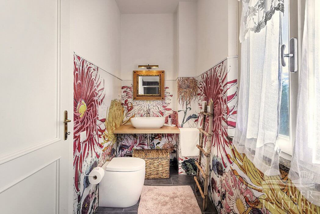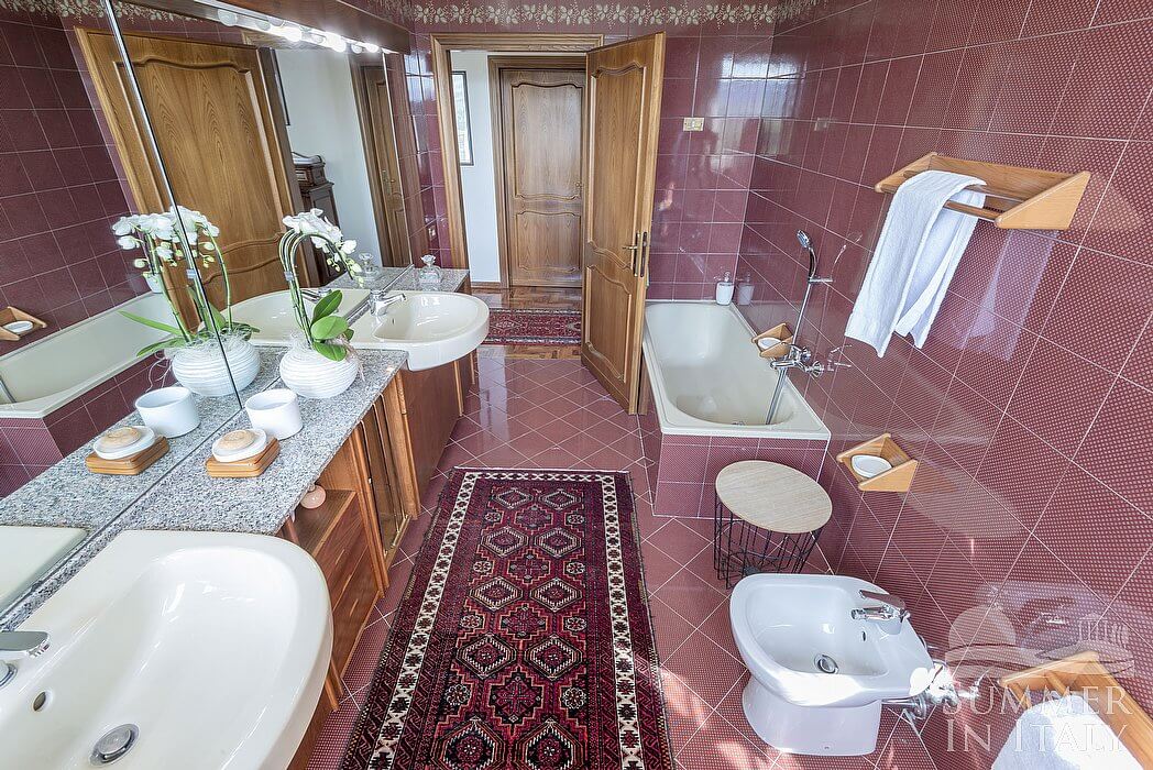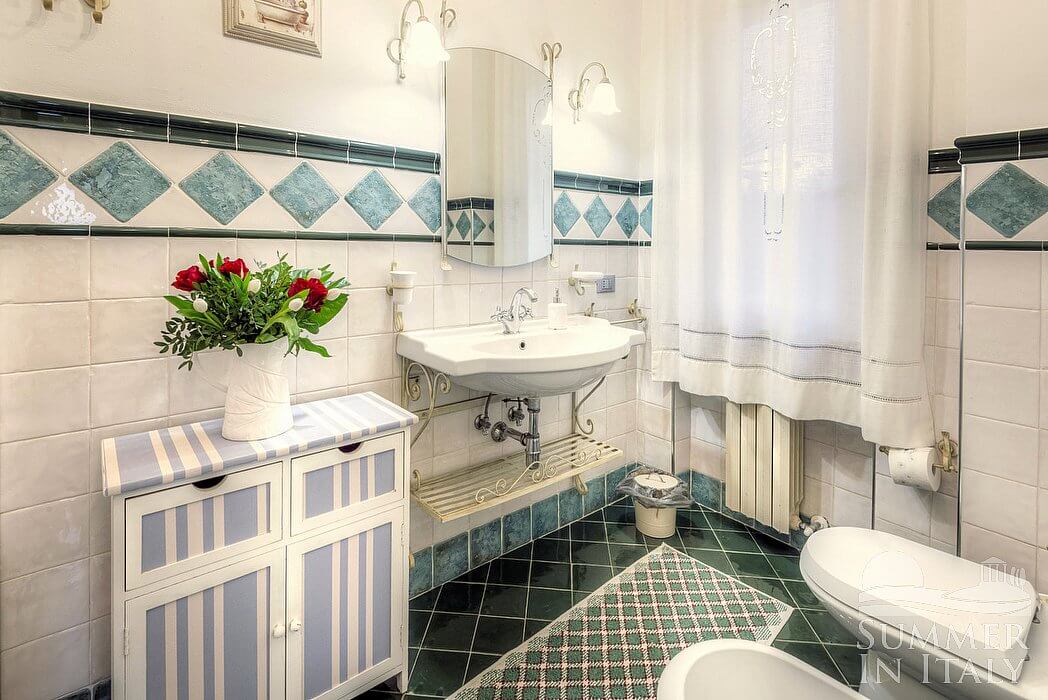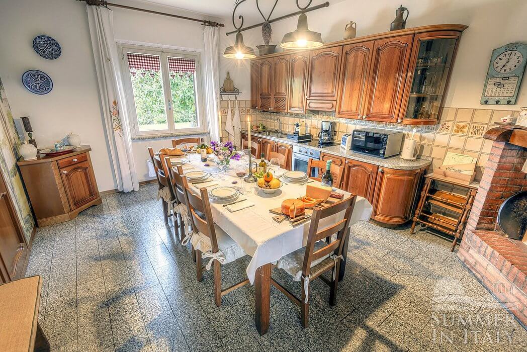 You will be able to enter the kitchen from the living room. The floor is paved with Venetian mosaic. It is equipped with a four-burner induction cooker, an electric oven, a refrigerator with freezer, a dishwasher, a microwave oven, an Italian-style coffee-maker, an American-style coffee-maker and a kettle. There is a big fireplace made of bricks, for decorative purposes only. The dining table can accommodate ten guests. The kitchen has a window.