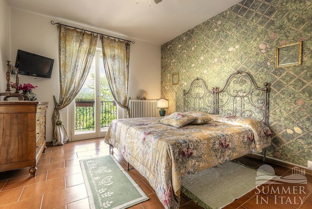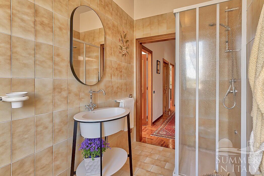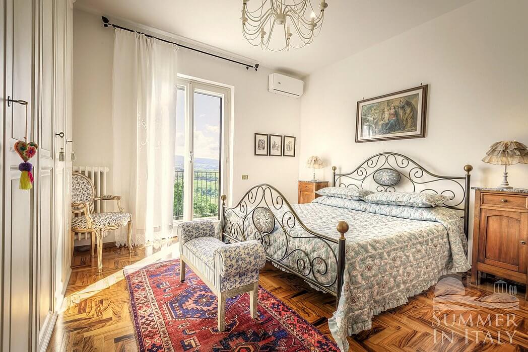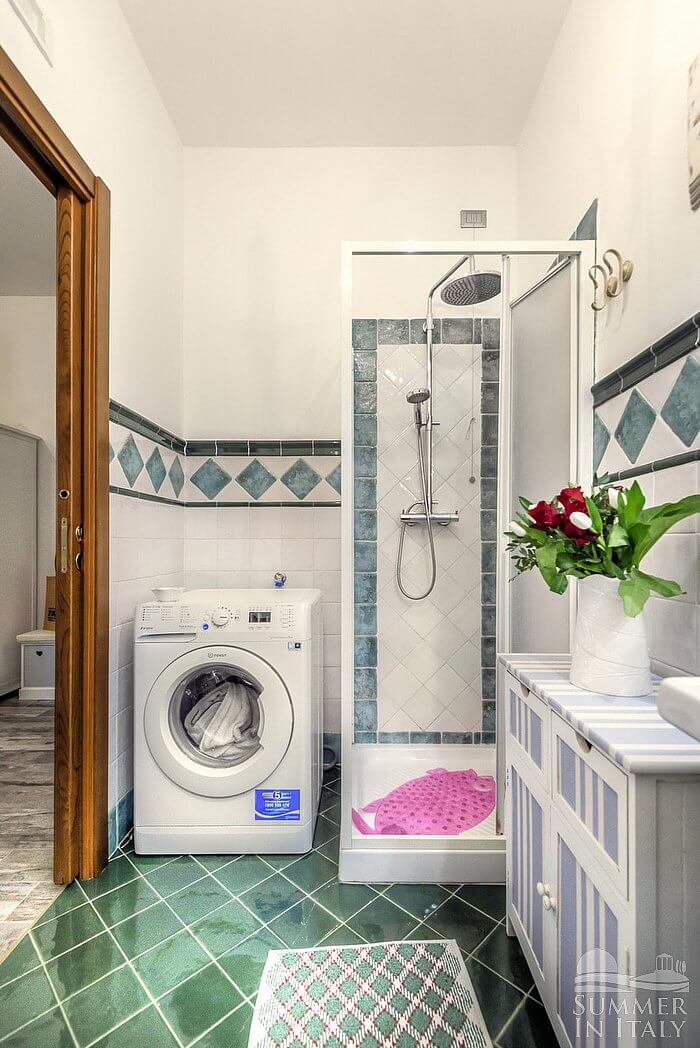 You will be able to enter the first bedroom from the living room. The bedroom has a matrimonial bed (160 cm/63 inches, wider than a queen-size bed). The furnishings include an armchair. In this room you will find a satellite television (local channels). The room has a window, and it's equipped with an air conditioning/heating unit. This bedroom has an en-suite bathroom, decorated with majolica tiles and equipped with a washbasin, a toilet, a fully enclosed shower and a hairdryer. Here you will also find a washing machine, a clothes dryer, an iron and an ironing board.