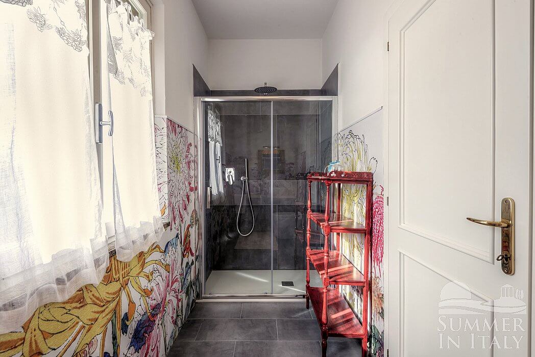 The swimming pool is 4 meters (13 feet) large by 9 meters (30 feet) long, 1.5 meters (5 feet) deep. It is filled with salt water. The area is equipped with two sun umbrellas, sun loungers and an external shower. From the swimming pool you will enjoy a fascinating view of the greenery and of the hills. The pool is open from the beginning of April until mid-October.
