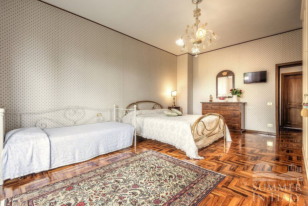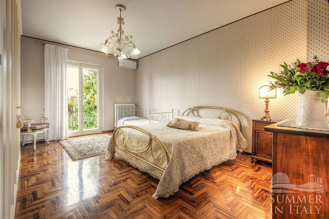 You will be able to enter the third bedroom through a corridor. The floor is paved with wood. The room has a matrimonial bed (160 cm/63 inches, wider than a queen-size bed) and a single bed (80 cm/32 inches). The furnishings include a bedroom chair. From the bedroom you will be able to enter the long terrace through a French door. The bedroom is equipped with an air conditioning/heating unit.