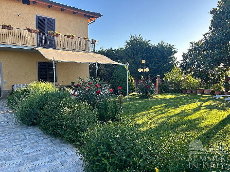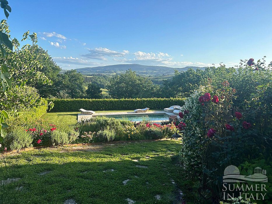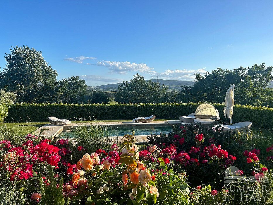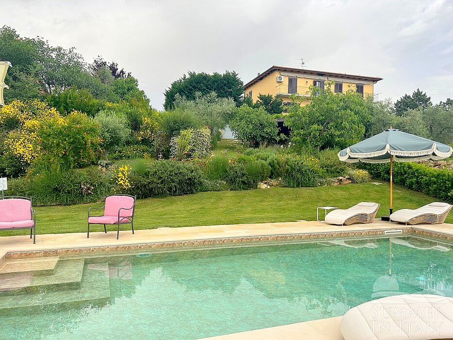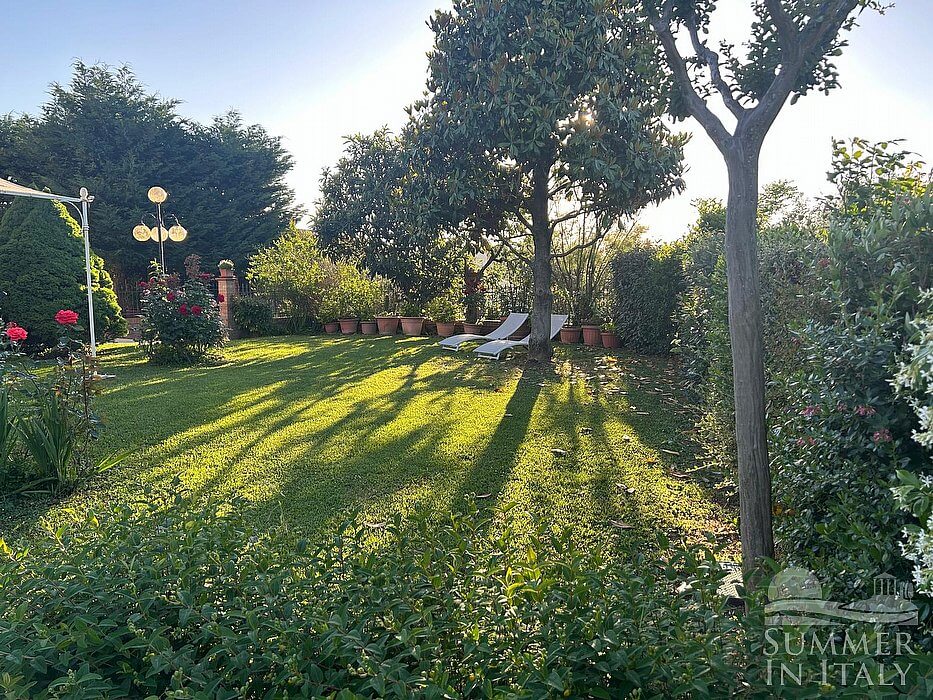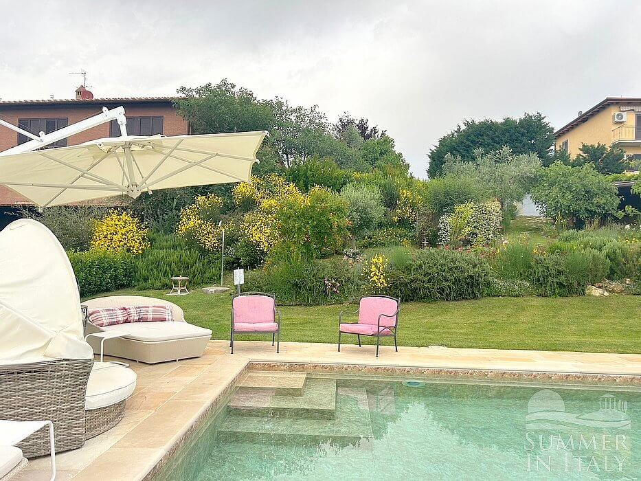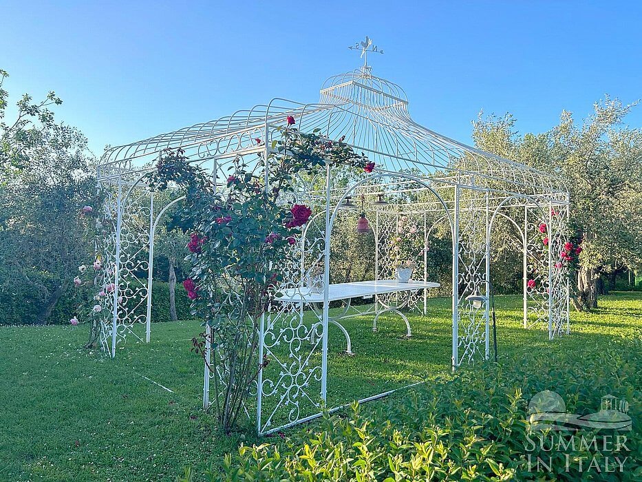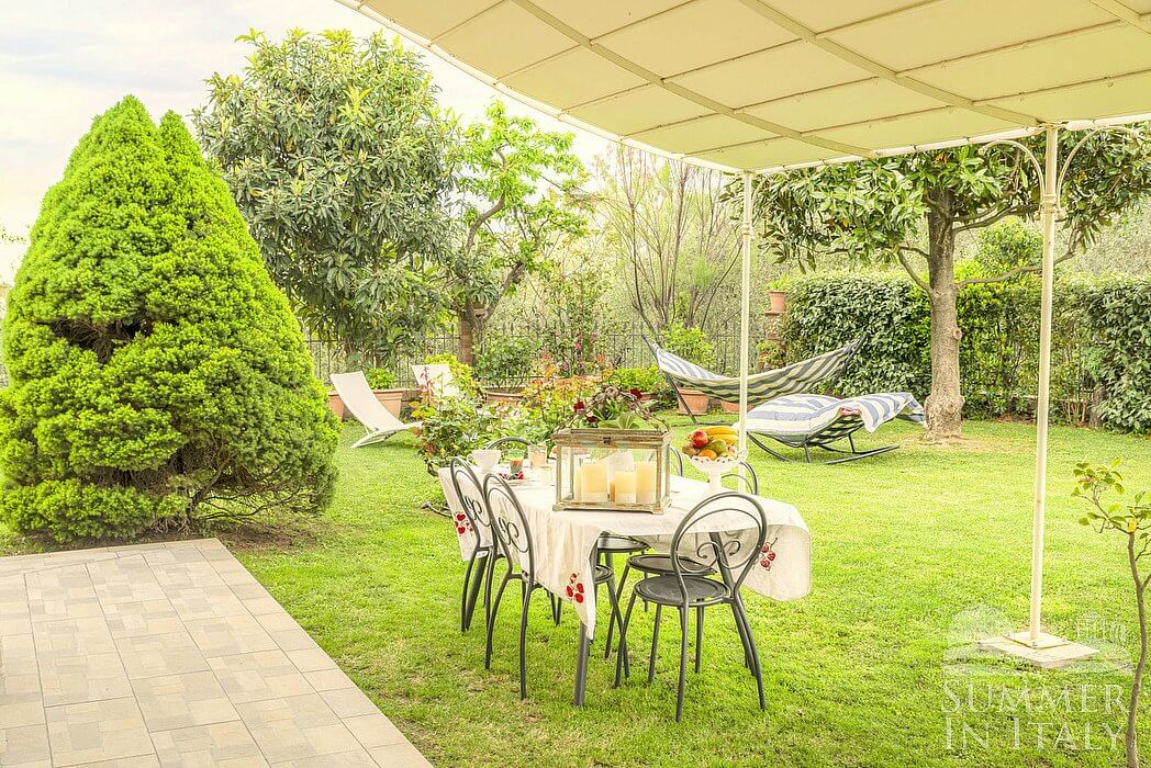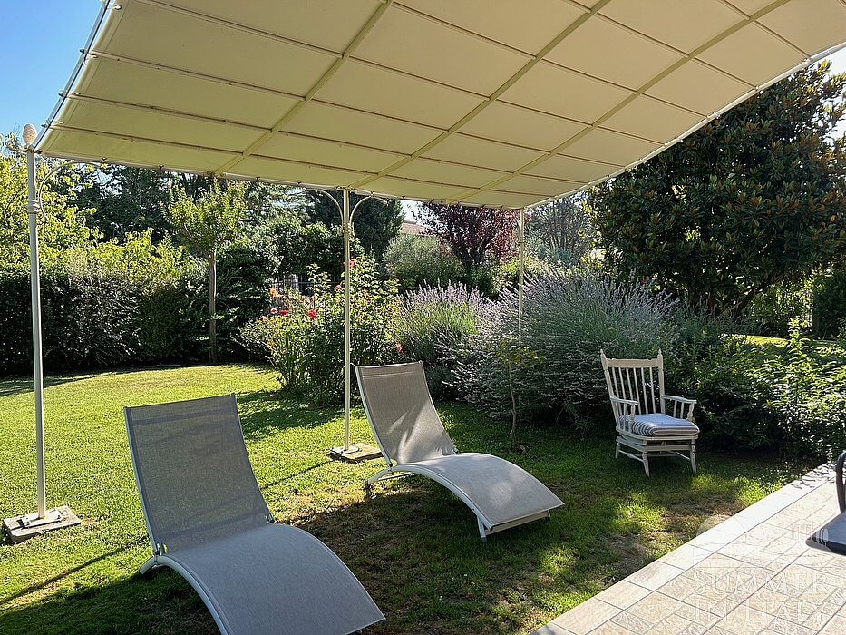 The garden is 300 square meters (3230 square feet). It is partly shaded by an elegant pergola and by trees. It is equipped with a table, chairs, sun loungers, a gazebo and an hammock. Here you will be able to have fun with a ping pong table, and you will also find a brickwork barbecue. From the garden you will enjoy a lovely view of the surrounding hills.