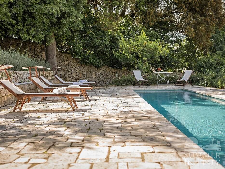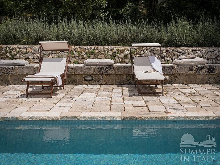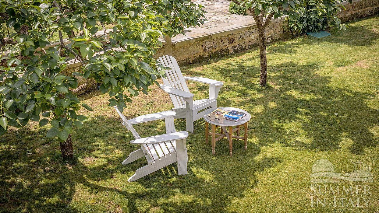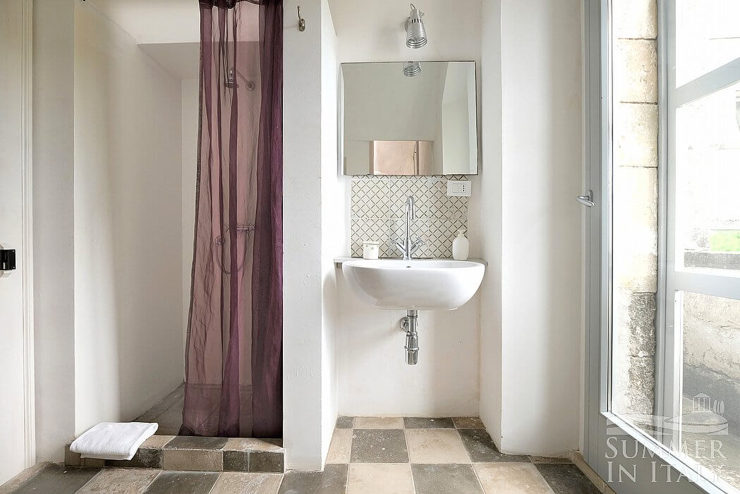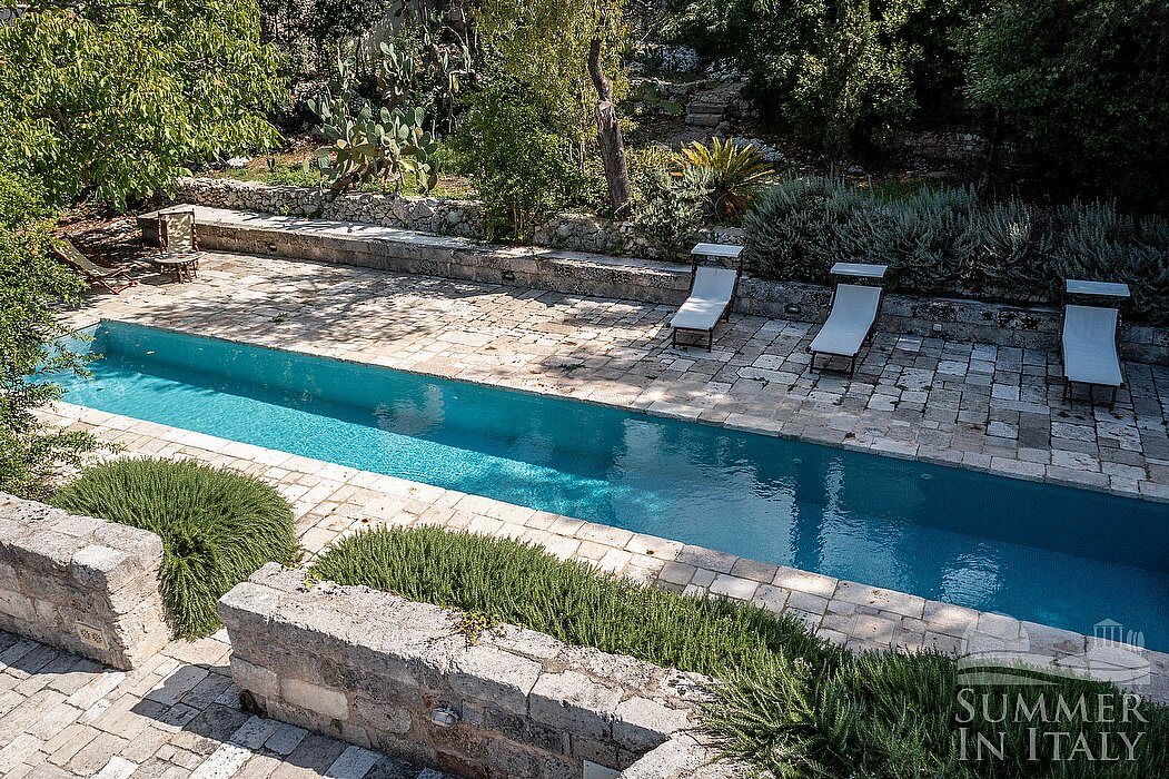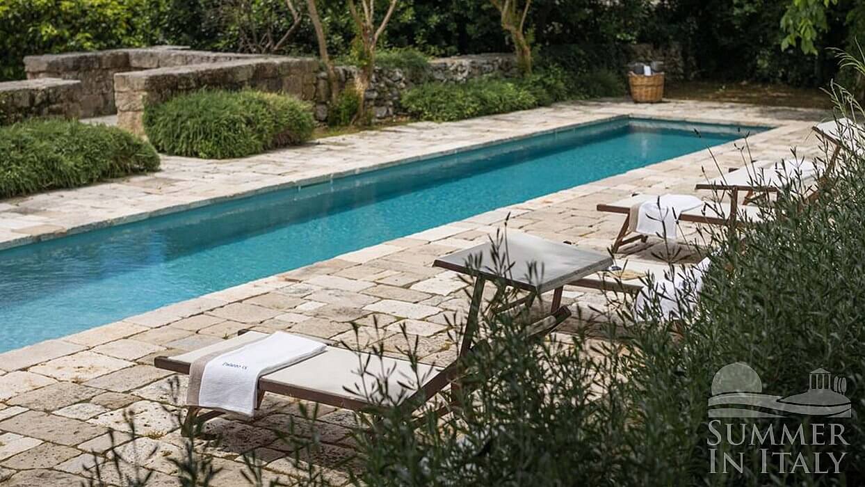 The swimming pool is 2.5 meters (8 feet) large by 15 meters (50 feet) long, 1.6 meters (5.2 feet) deep. The area is equipped with a table, two deck chairs and sun loungers, and it is partly shaded by tall trees. From the swimming pool you will enjoy a charming view of the greenery and of the other buildings. The pool is open all year round, although it is not heated.