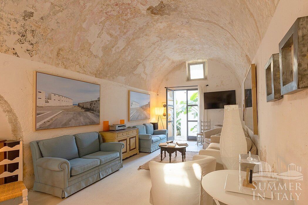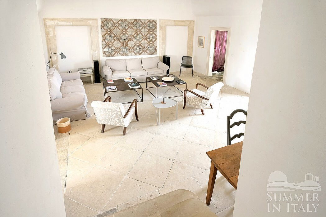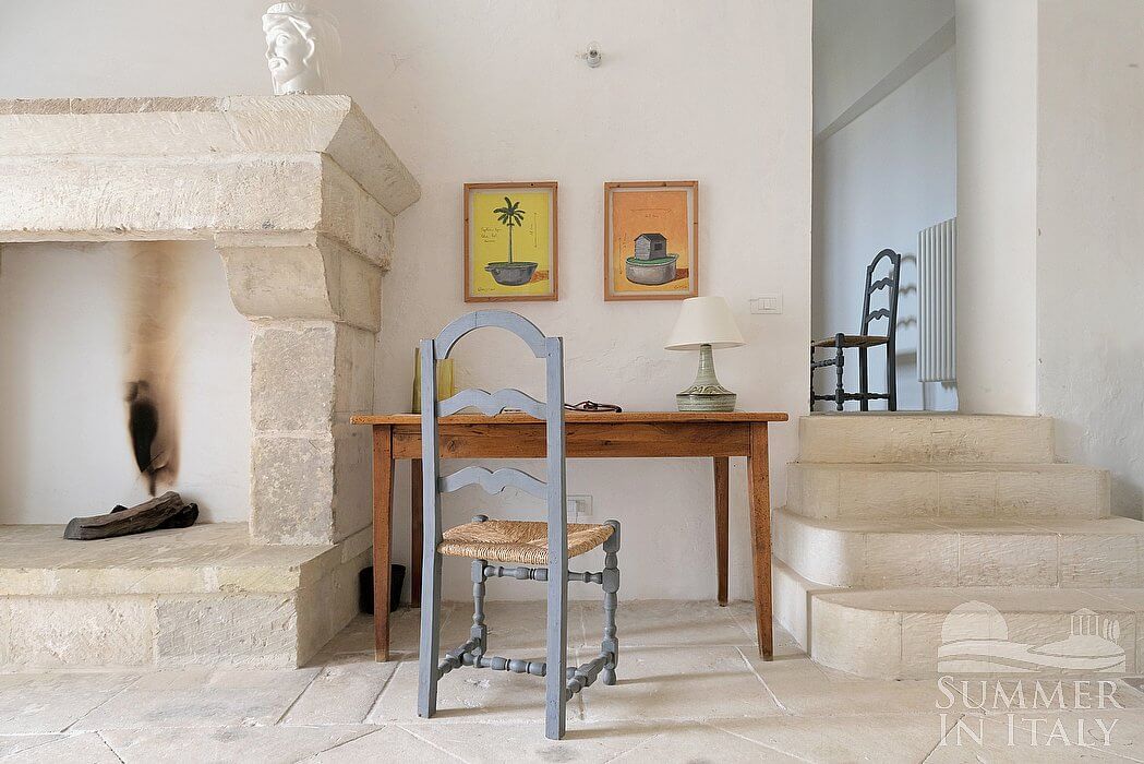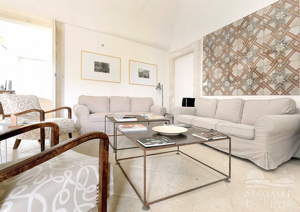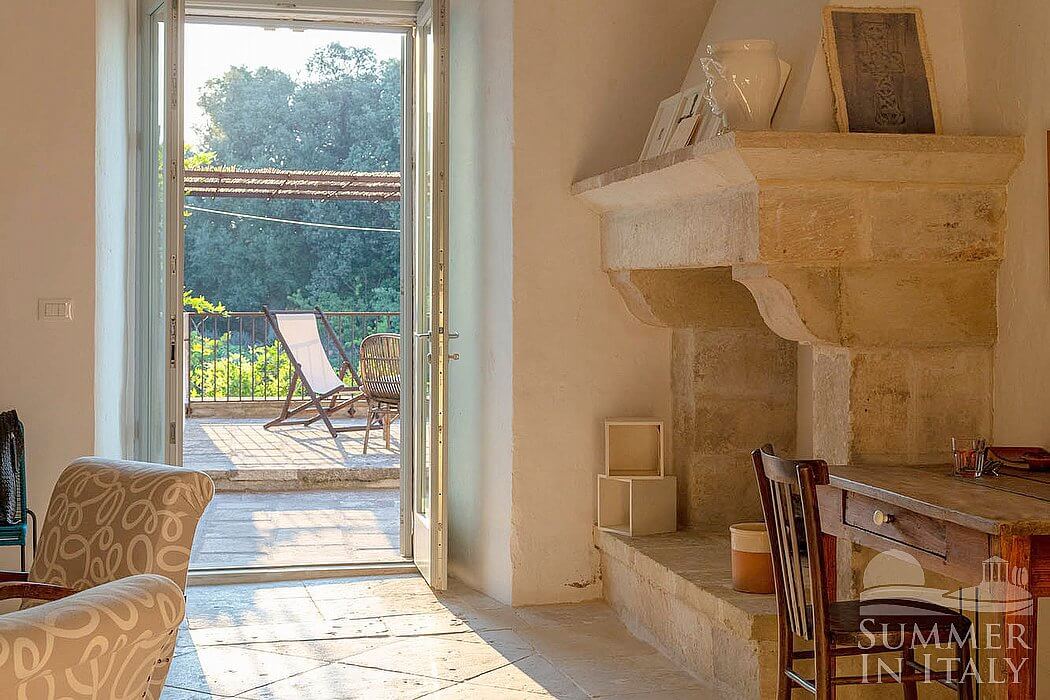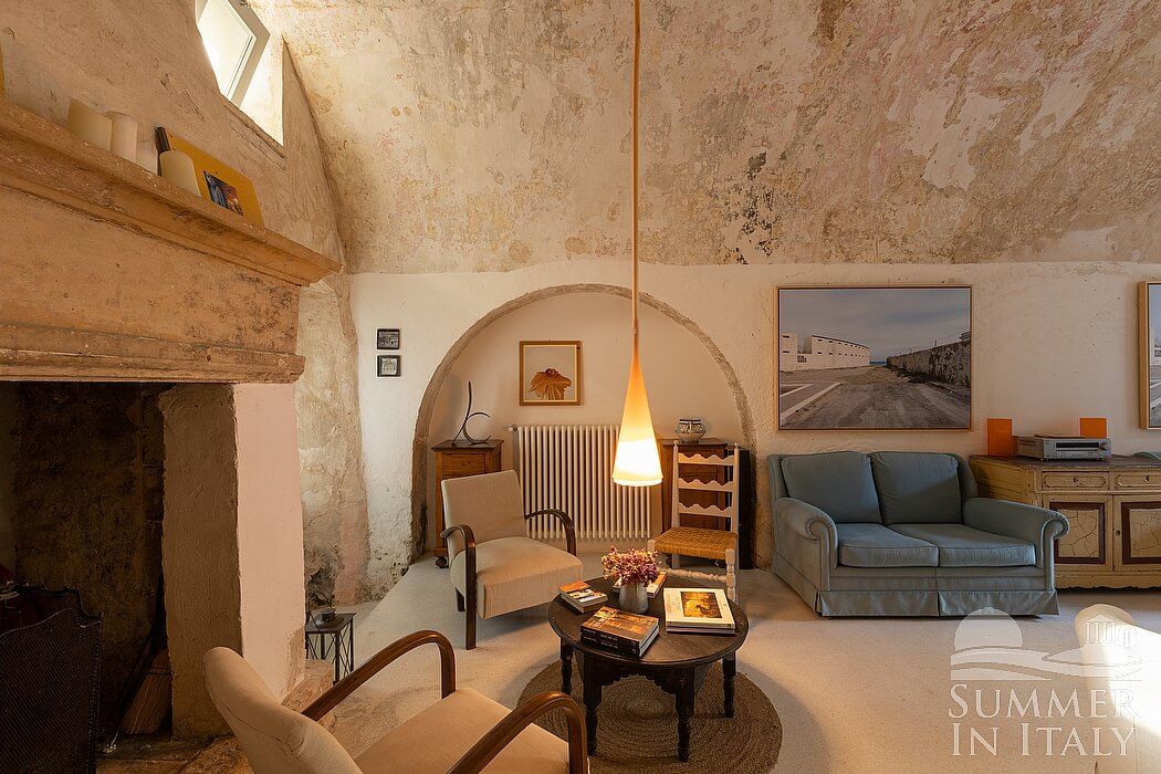 The second living room is paved with stone tiles. The ceiling is vaulted. The furnishings are classic and welcoming, and include two sofas, two armchairs and a desk. There is an age-old fireplace made of stone, for decorative purposes only. From the living room you will be able to enter the terrace through a French door.