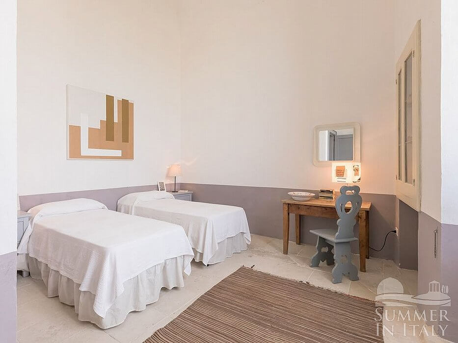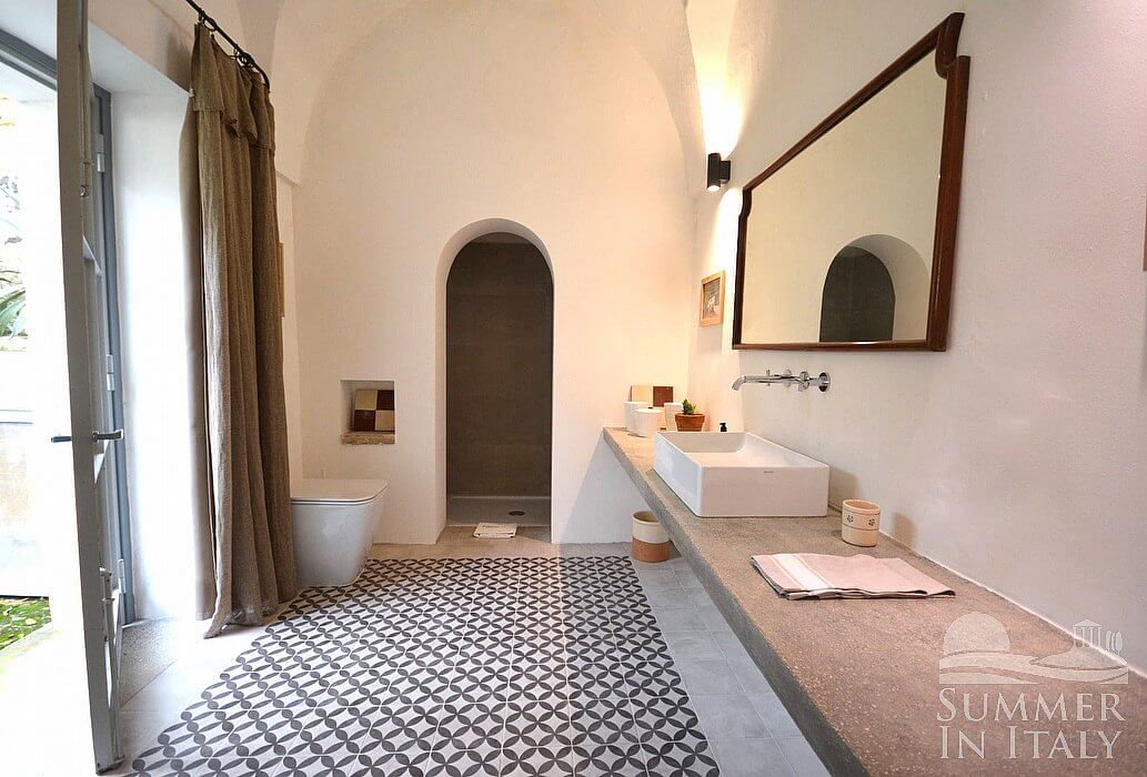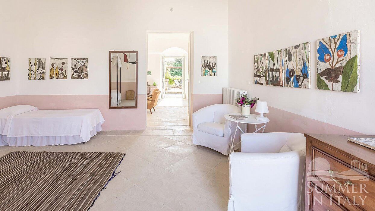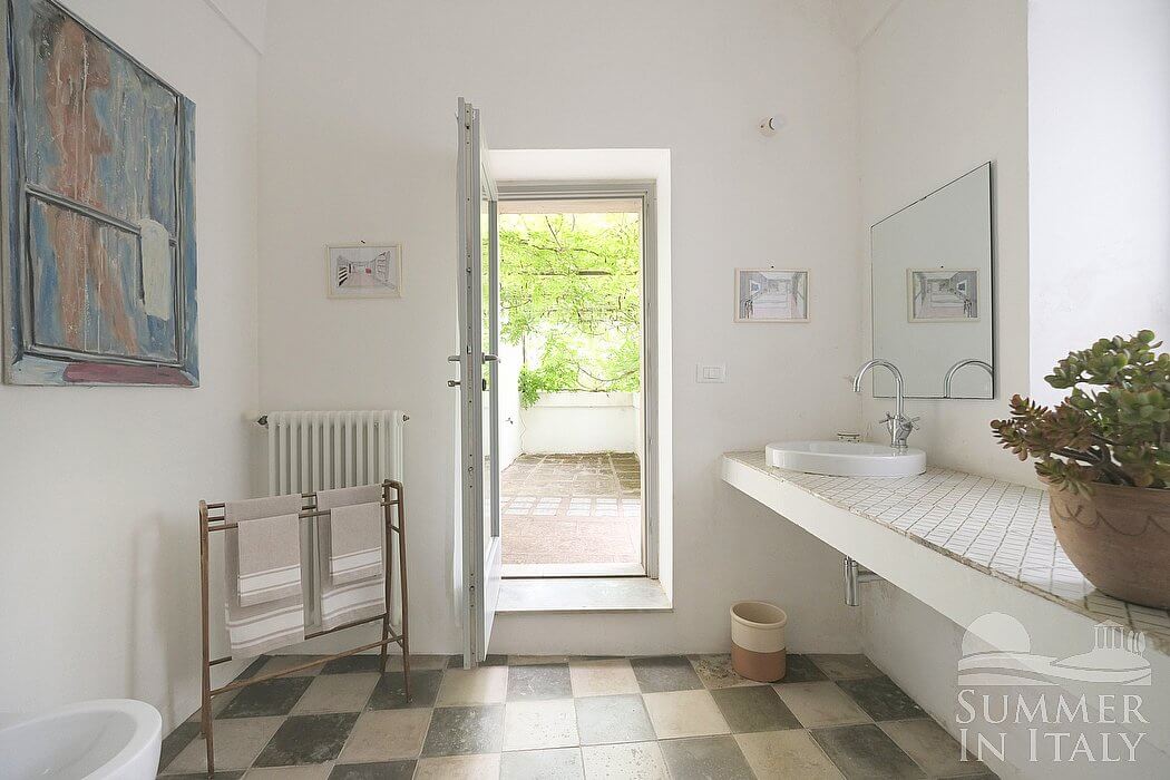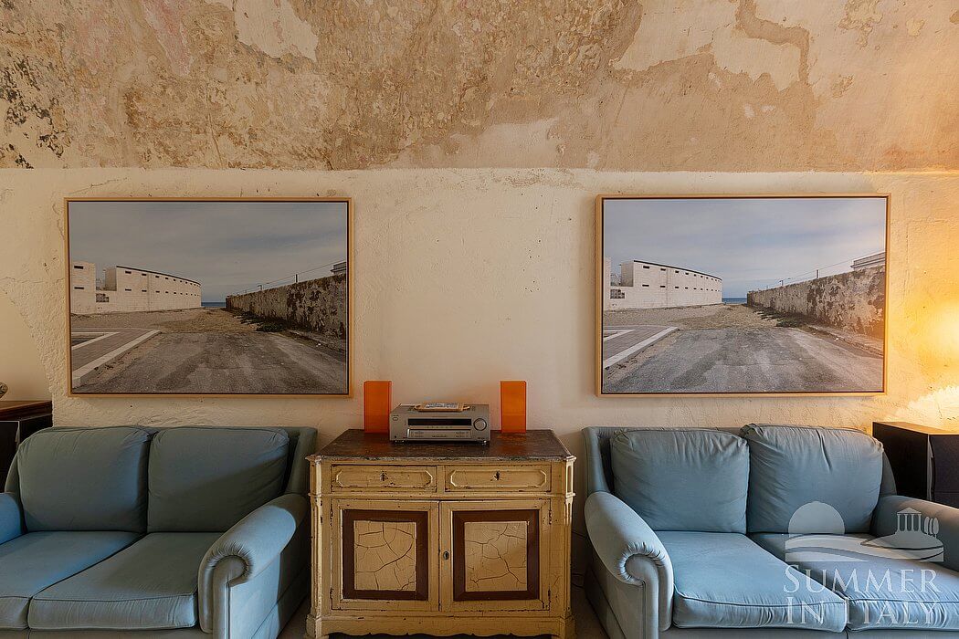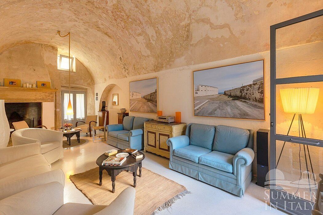 The second living room is paved with stone tiles. The ceiling is vaulted. The furnishings are classic and welcoming, and include two sofas, two armchairs and a desk. There is an age-old fireplace made of stone, for decorative purposes only. From the living room you will be able to enter the terrace through a French door.