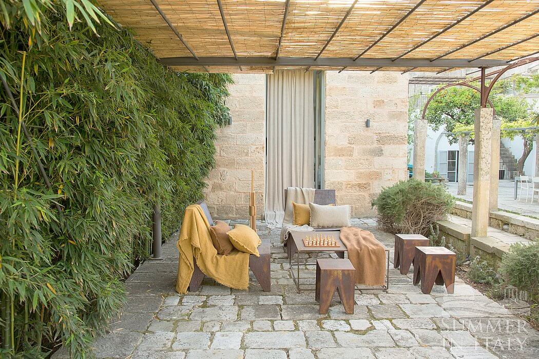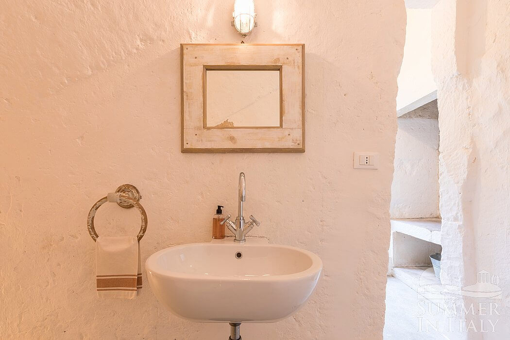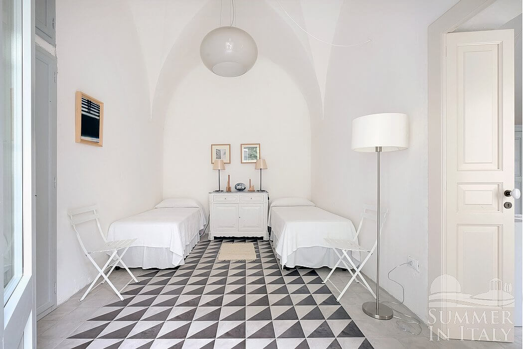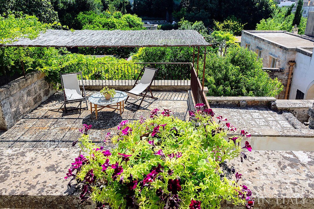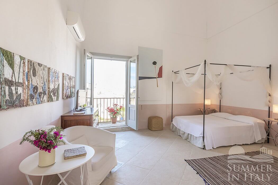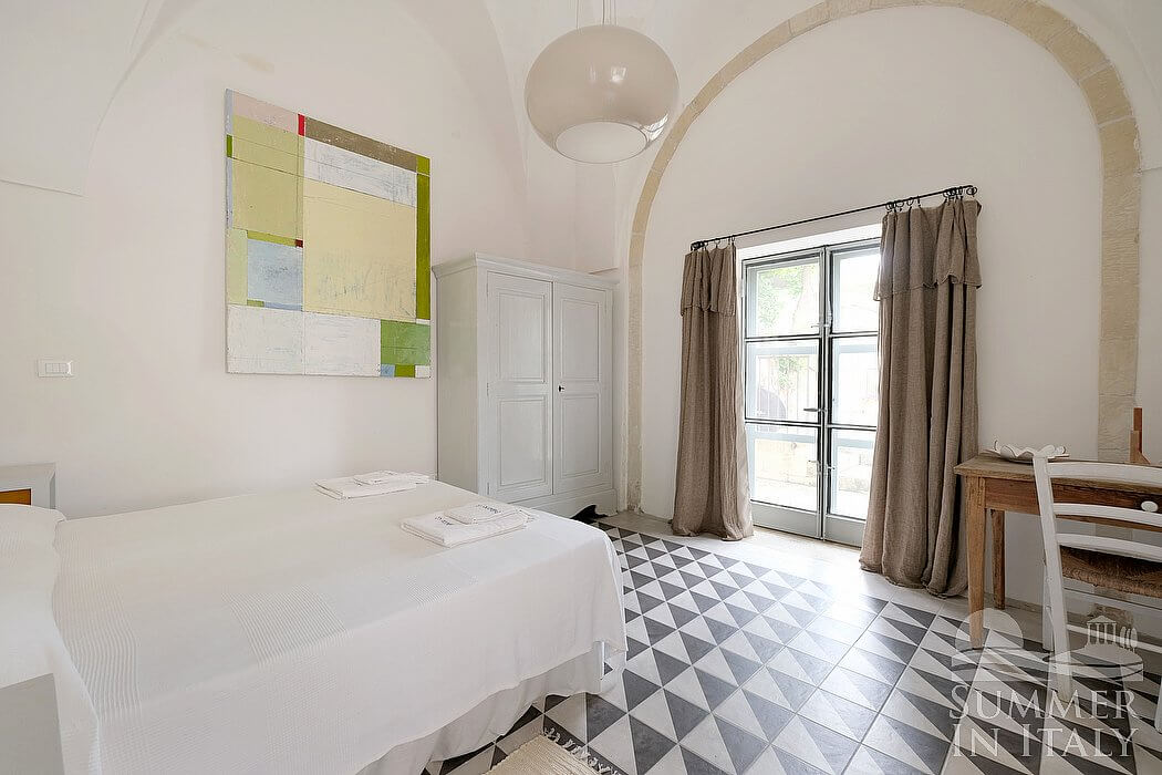 The second living room is paved with stone tiles. The ceiling is vaulted. The furnishings are classic and welcoming, and include two sofas, two armchairs and a desk. There is an age-old fireplace made of stone, for decorative purposes only. From the living room you will be able to enter the terrace through a French door.