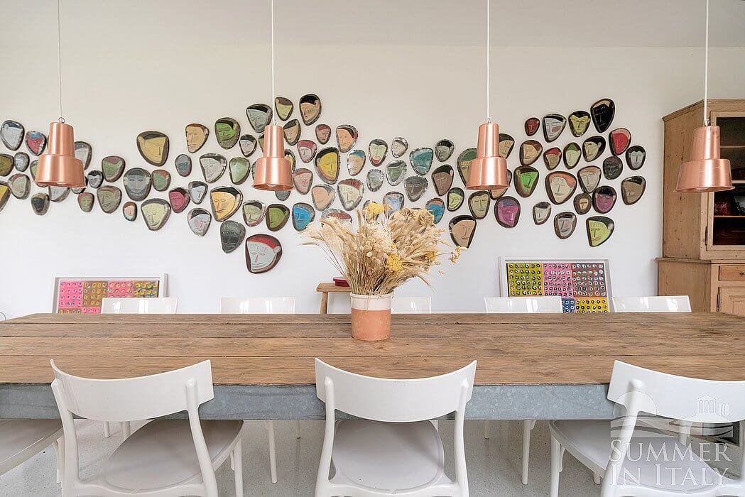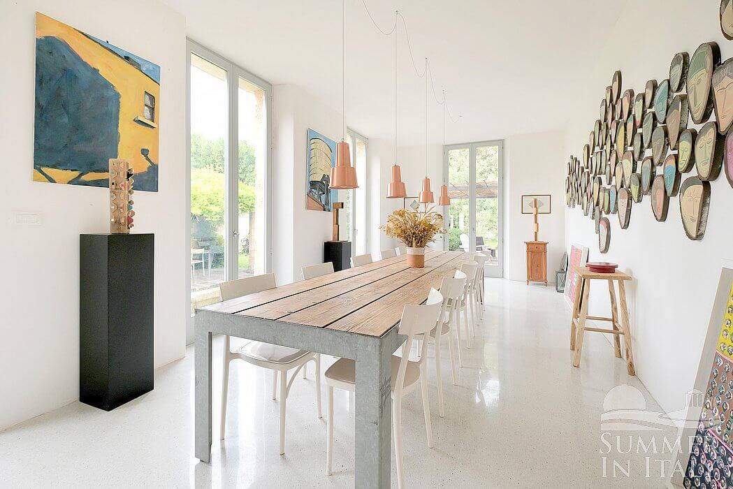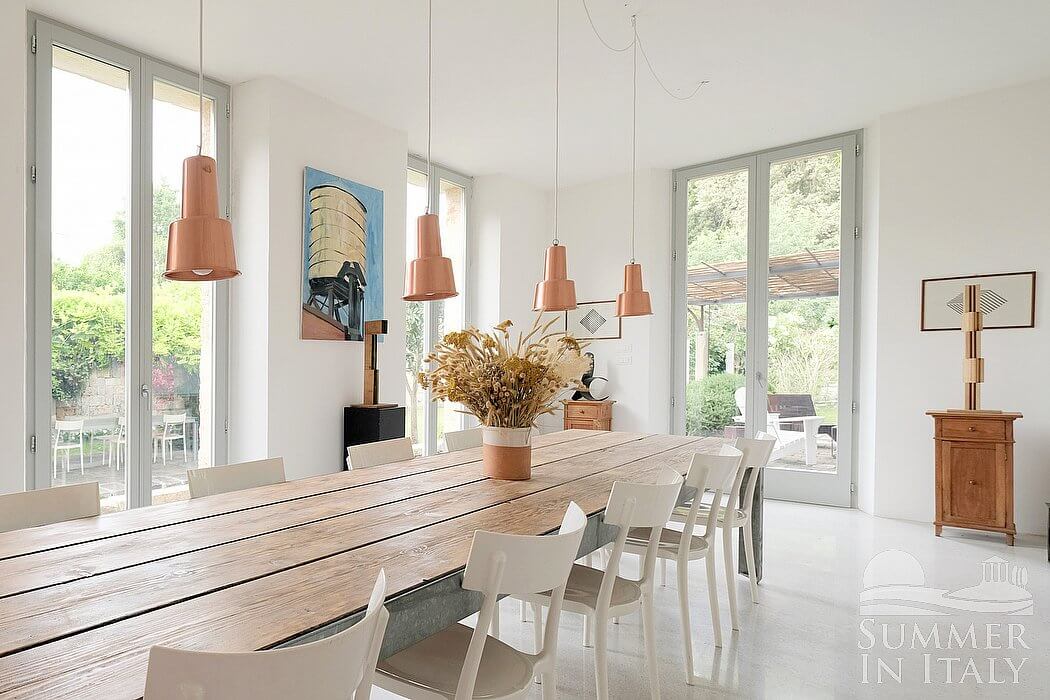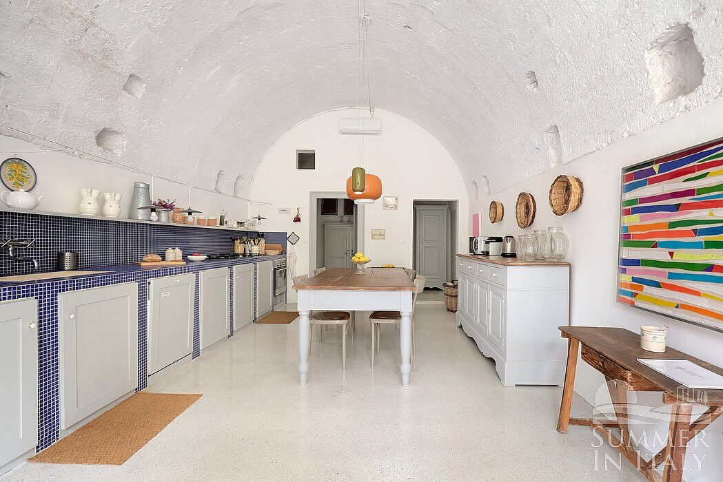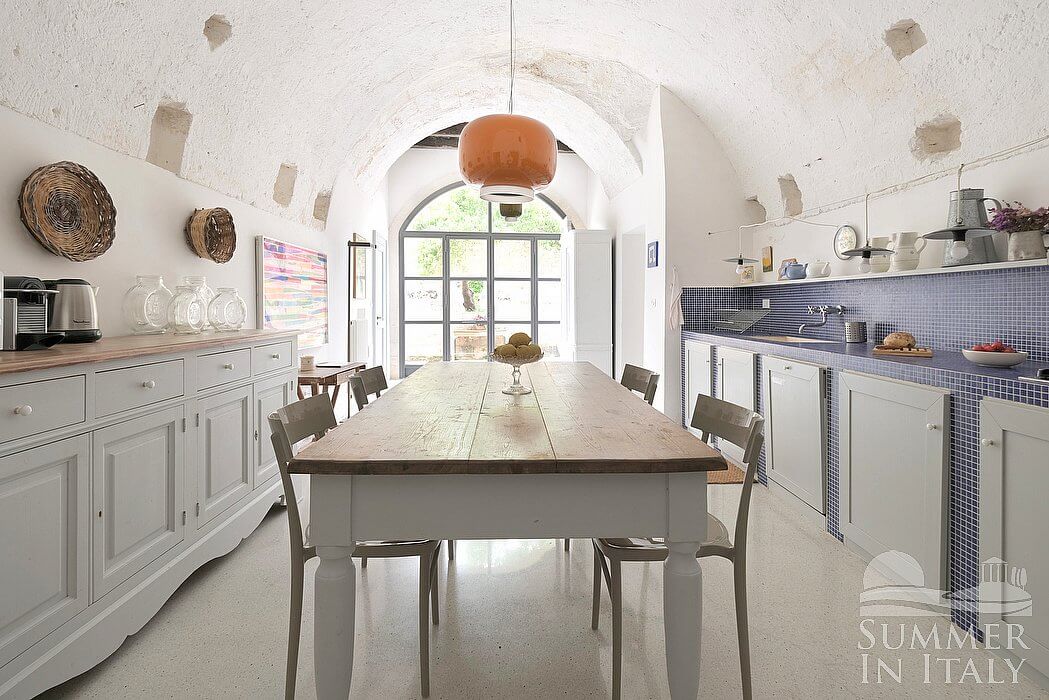 You will be able to enter the kitchen from the dining room through an access area. The ceiling of the kitchen is vaulted. It is equipped with a six-burner gas cooker, an electric oven, a refrigerator with freezer, a dishwasher, a microwave oven, an Italian-style coffee-maker and a kettle. Here you will also find a washing machine (hidden in a utility room), an iron and an ironing board. The dining table can accommodate six guests. From the kitchen a French door will take you to the first patio. The kitchen is equipped with an air conditioning/heating unit.