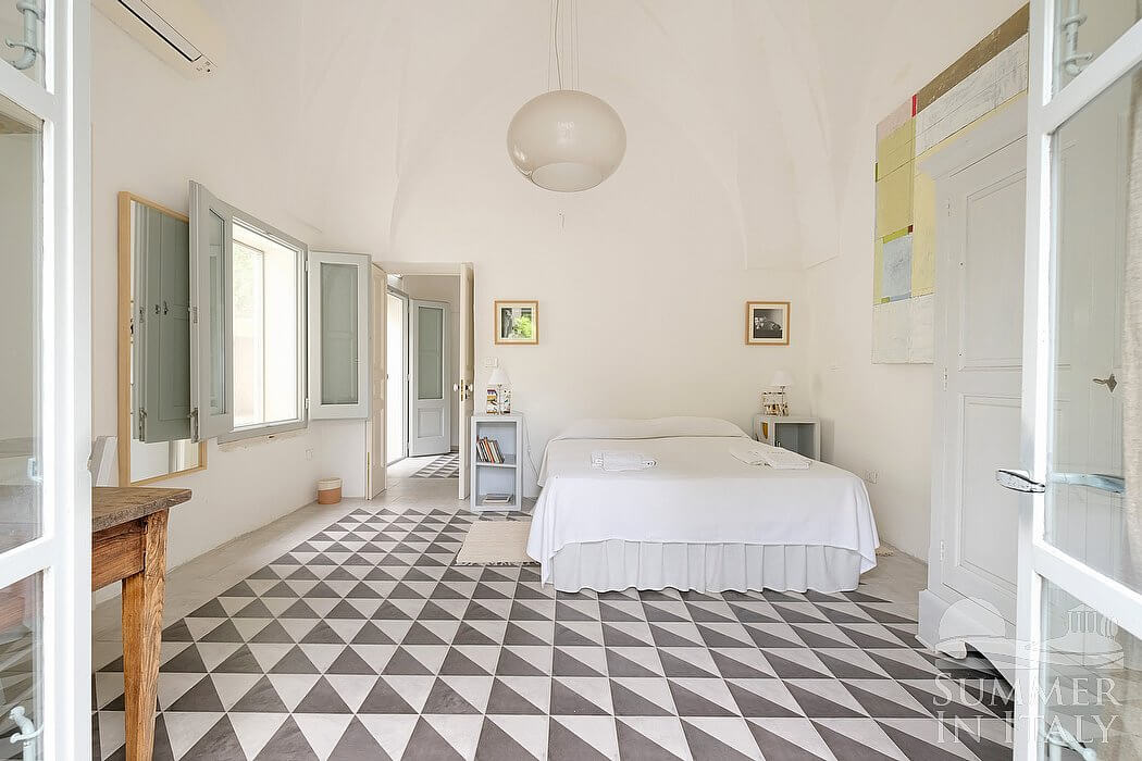 You will be able to enter the first bedroom from the first patio through an external access. The bedroom has a matrimonial bed (160 cm/63 inches, wider than a queen-size bed). The furnishings include a desk. In this room you will find a television (local channels). The room also has a window, and it's equipped with an air conditioning/heating unit. This bedroom has an en-suite bathroom, equipped with a washbasin, a toilet, a shower and a hairdryer.