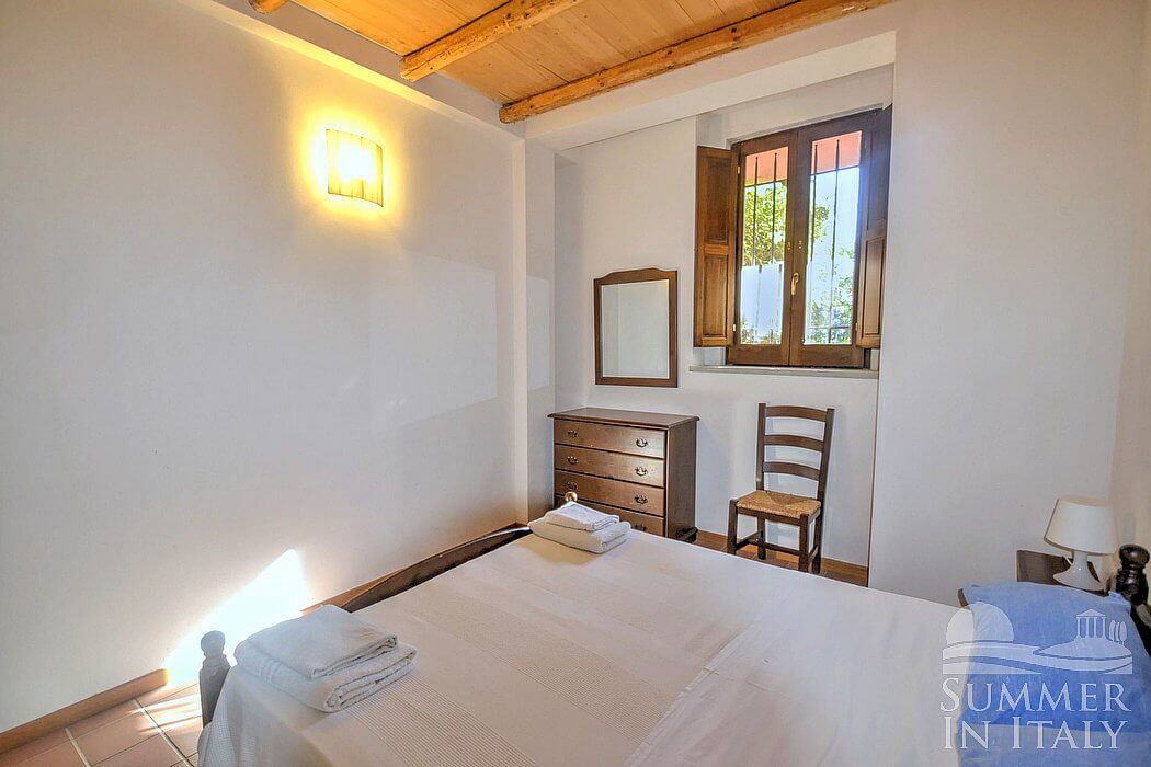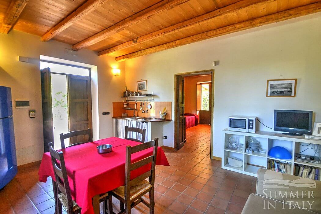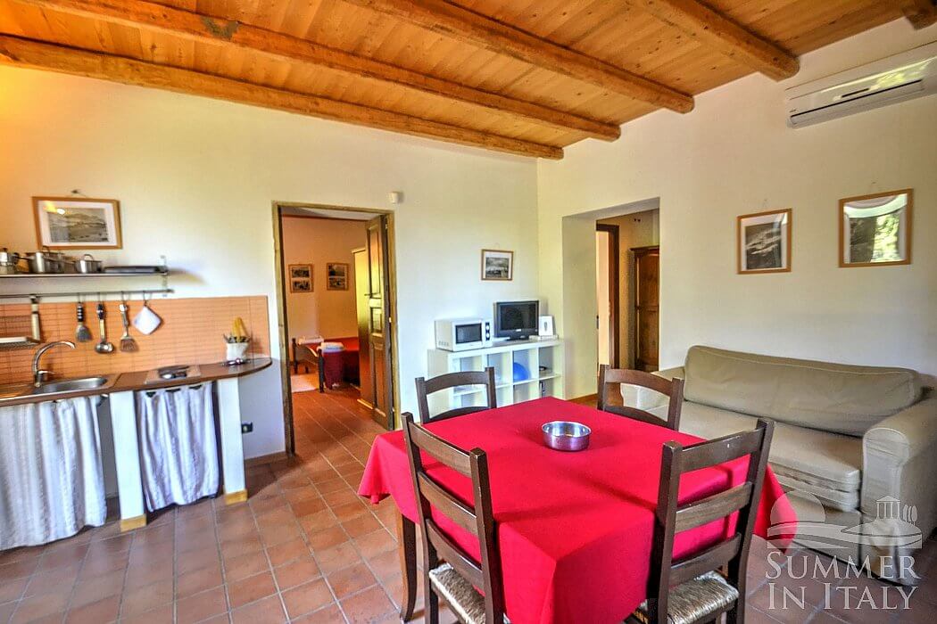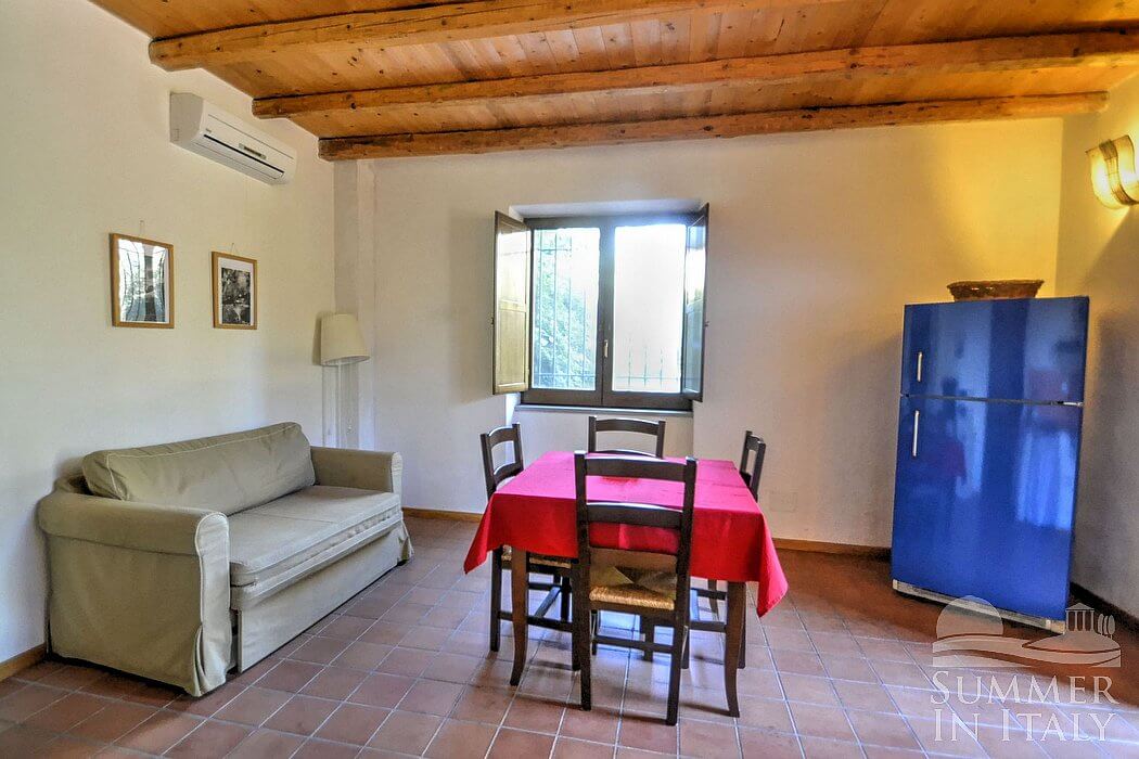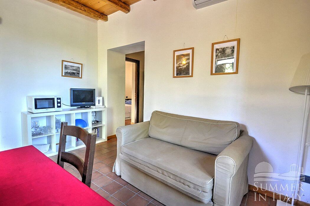 The living room is paved with terracotta tiles. The ceiling has characteristic exposed wood beams. The furnishings are simple and comfortable. The furnishings include a sofa. In the living room you will also find a cooking area. The kitchenette is equipped with a two-burner electric cooker, a small electric oven, a refrigerator with freezer and an Italian-style coffee-maker. The dining table can accommodate four guests. In this room you will find a satellite television (local channels). From the living room you will be able to enter the patio through a French door. The room also has a window.