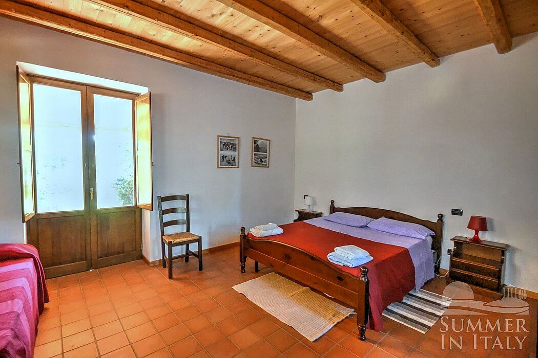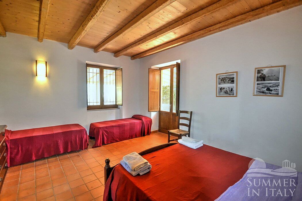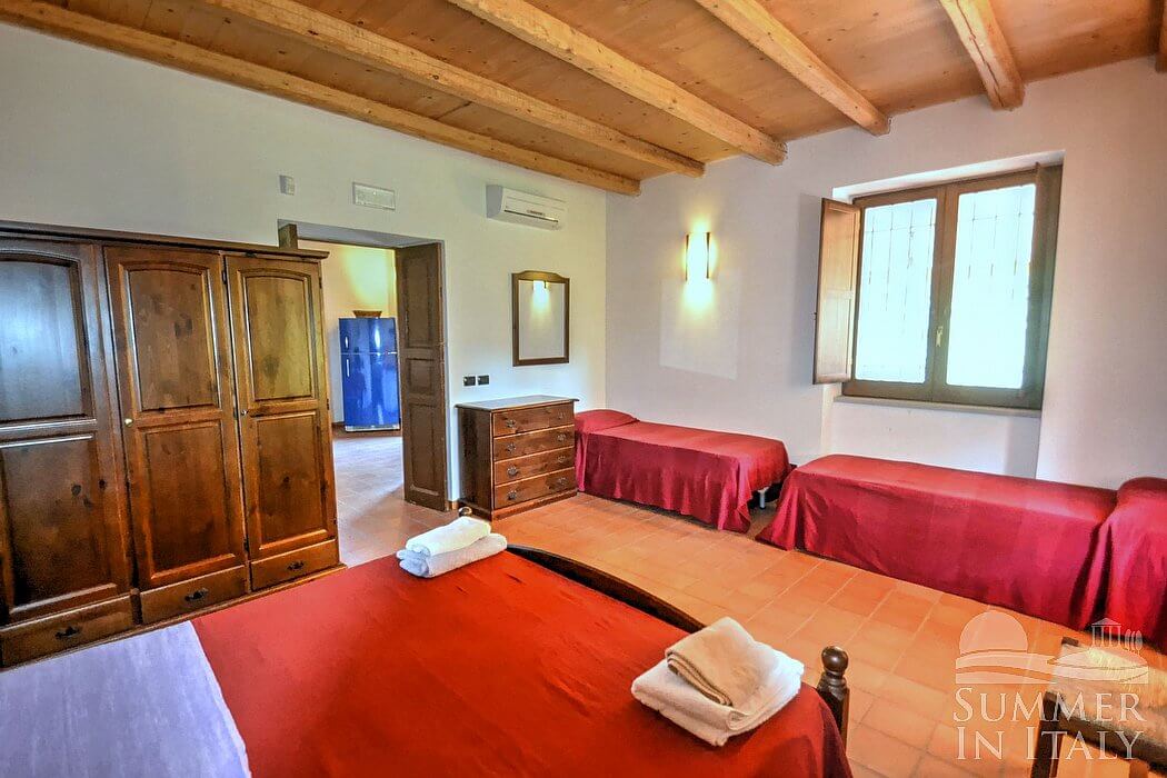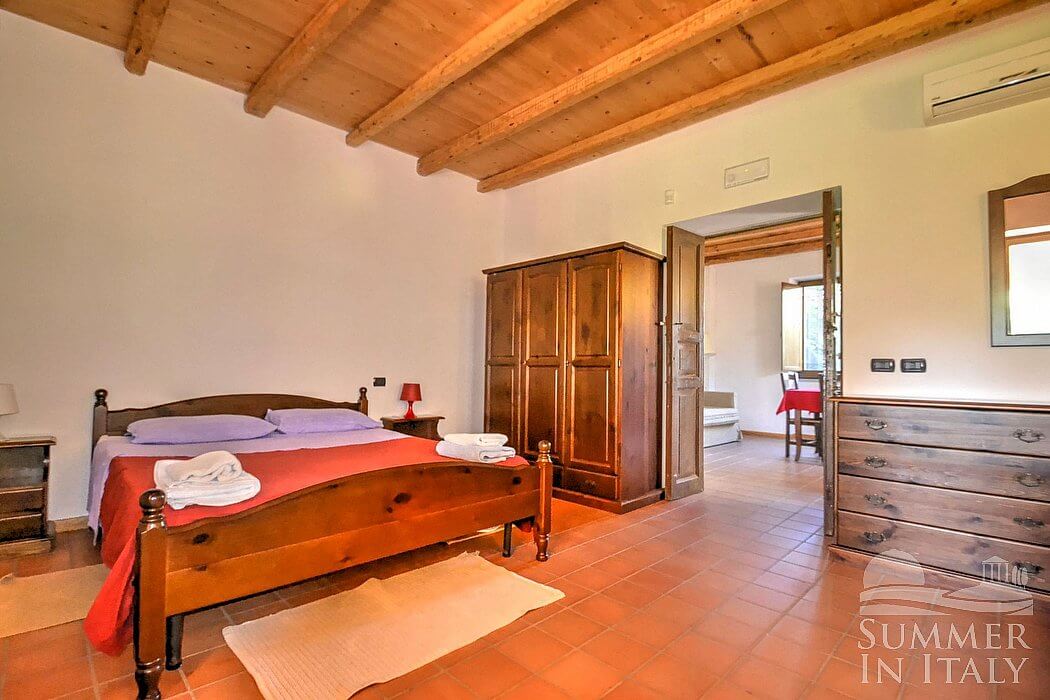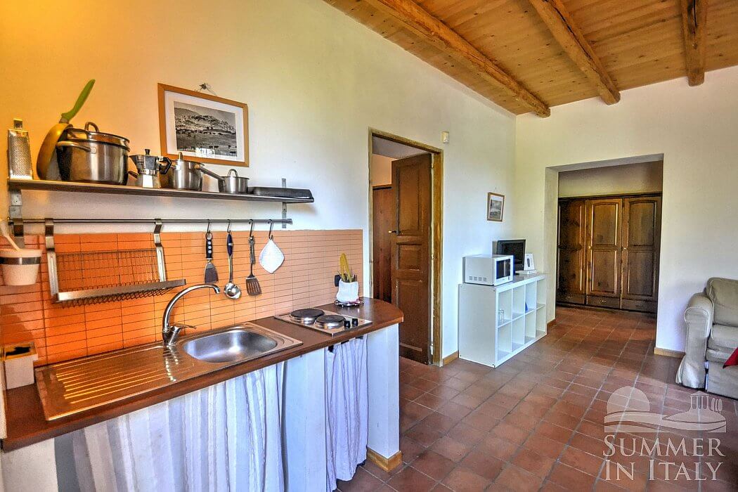 The living room is paved with terracotta tiles. The ceiling has characteristic exposed wood beams. The furnishings are simple and comfortable. The furnishings include a sofa. In the living room you will also find a cooking area. The kitchenette is equipped with a two-burner electric cooker, a small electric oven, a refrigerator with freezer and an Italian-style coffee-maker. The dining table can accommodate four guests. In this room you will find a satellite television (local channels). From the living room you will be able to enter the patio through a French door. The room also has a window.