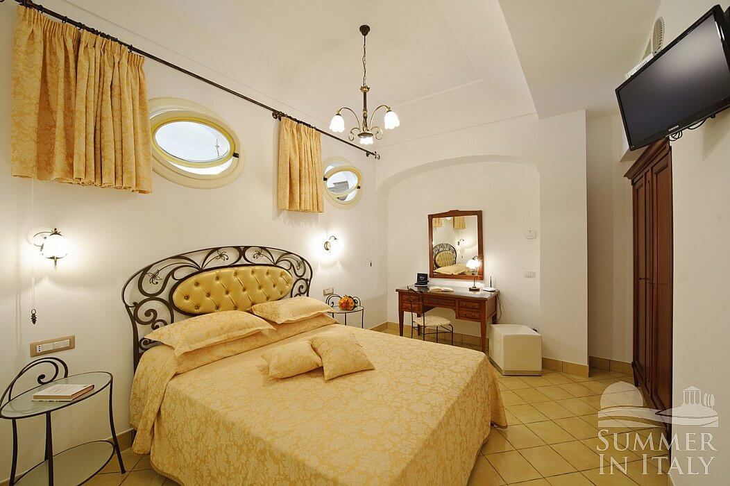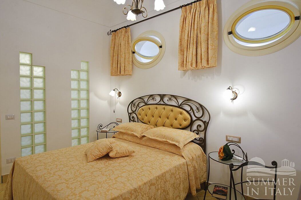 The living room is paved with original handmade majolica tiles. The furnishings are elegant and welcoming. The furnishings include a divan that unfolds into a double bed. In the living room you will also find a cooking area. The kitchenette is equipped with a four-burner gas cooker, an electric oven, a refrigerator with freezer, a dishwasher, a microwave oven and an Italian-style coffee-maker. There is also a washing machine. The dining table can accommodate six guests. In this room you will find a flat-screen satellite television (local channels). From the living room you will be able to enter the small balcony with a view of the sea and of the coastline through a French door. The room is equipped with an air conditioning/heating unit.