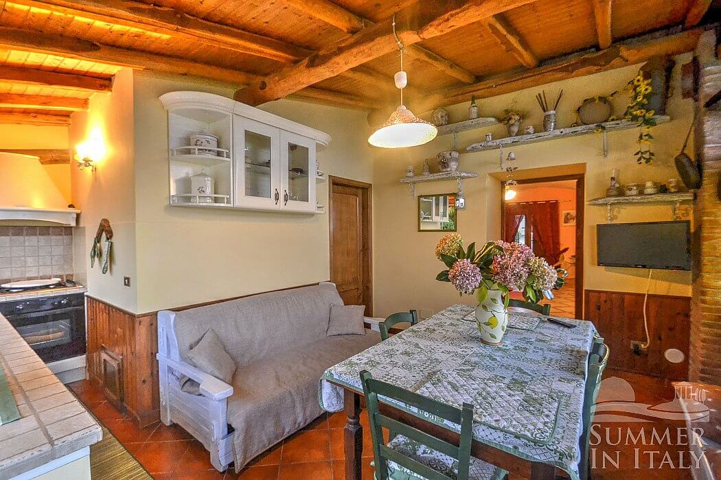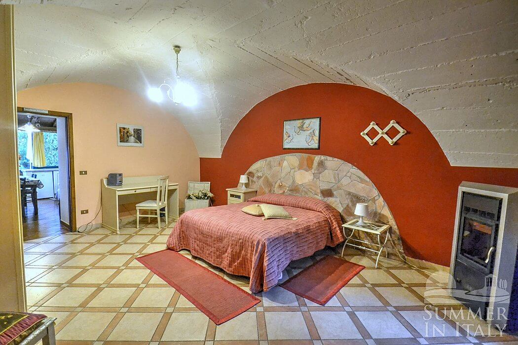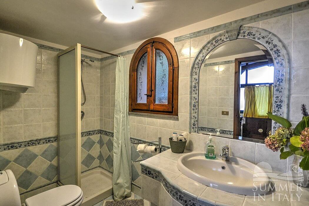 You will be able to enter the living room from the bedroom. The furnishings are cozy and comfortable. The furnishings include a sofa. In the living room you will also find a cooking area. The kitchenette is equipped with a four-burner gas cooker, an electric oven, a small refrigerator with freezer and an Italian-style coffee-maker. The dining table can accommodate four guests. In this room you will find a television (local channels). From the living room you will be able to enter the garden through a French door. The room also has two large panoramic windows.
