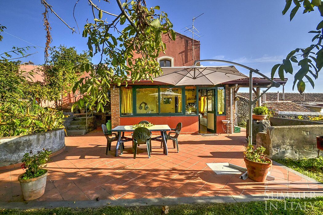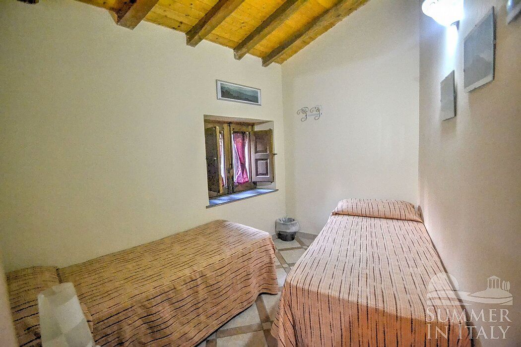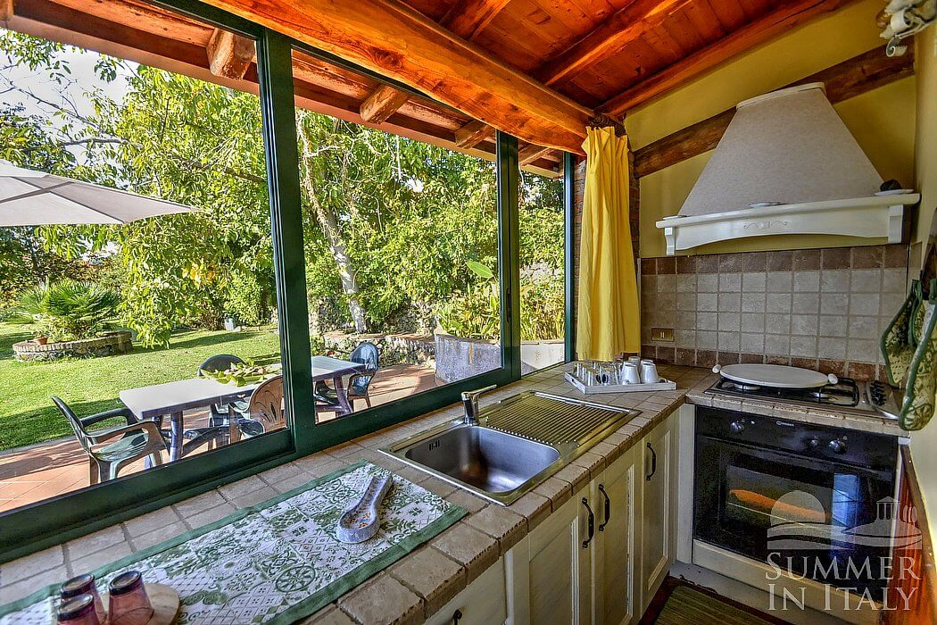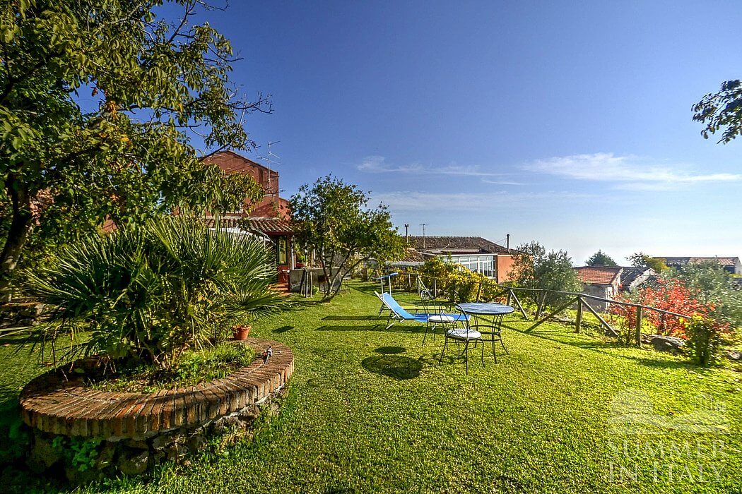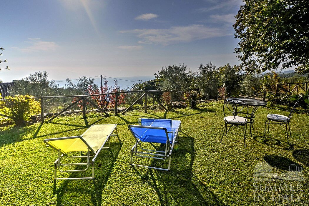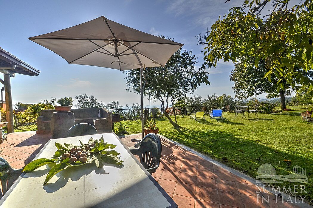 The garden is 400 square meters (4300 square feet) large. It is partly shaded by characteristic trees. It is equipped with a table, chairs, a sun umbrella and sun loungers. Here you will also find a barbecue. From the garden you will enjoy a wonderful view of the valley and of the sea at a distance.