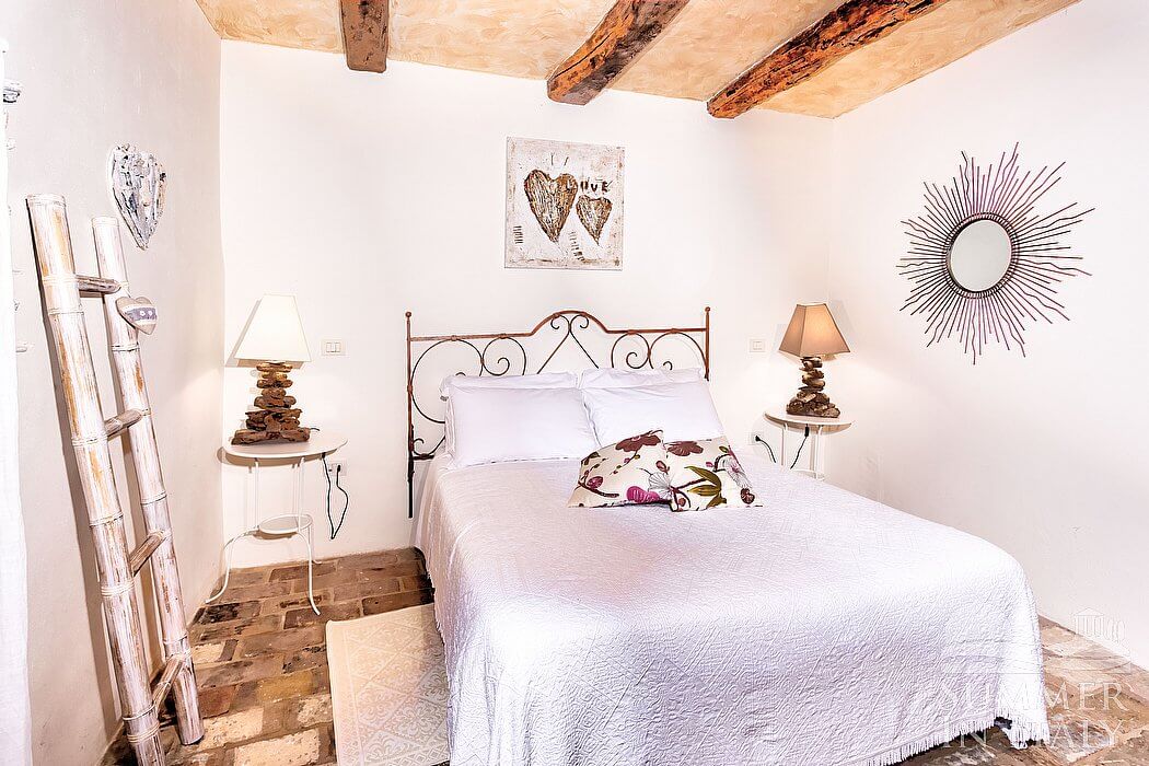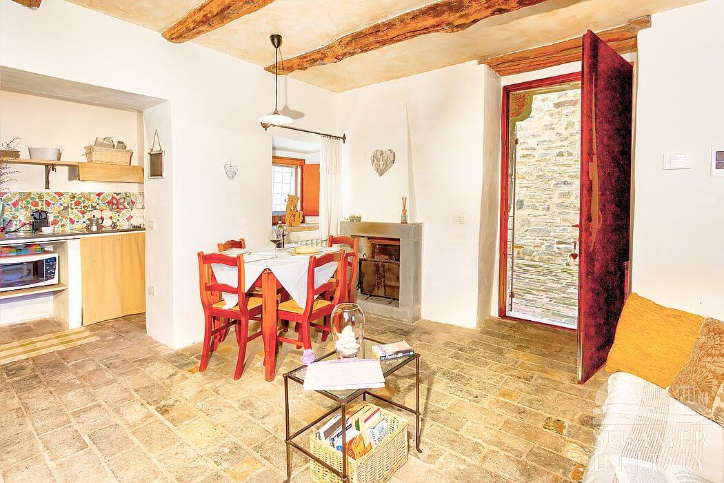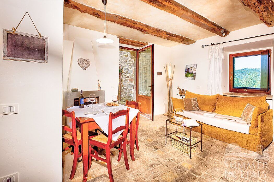 The living room is paved with stone tiles. The ceiling has characteristic exposed wood beams. The furnishings are cozy and comfortable. The furnishings include a divan that unfolds into a double bed. There is a practical fireplace. In the living room you will also find a cooking area. The kitchenette is equipped with a four-burner electric cooker, a refrigerator with freezer, a microwave oven, an Italian-style coffee-maker and a kettle. The dining table can accommodate four guests. The room also has a small window, as well as two windows.