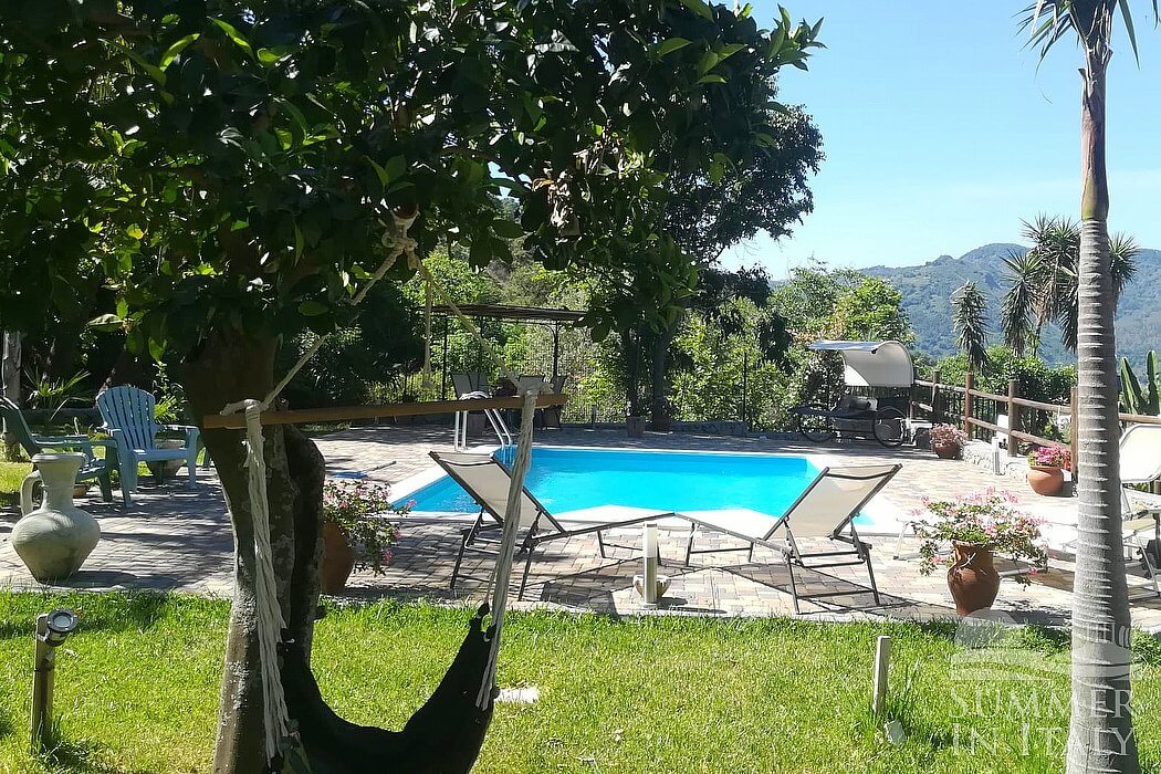 The swimming pool is 4 meters (13 feet) large by 6 meters (20 feet) long, 1.55 meters (5.10 feet) deep. The area is equipped with a table, chairs, sun loungers, a swing and an external shower, and it is partly shaded by trees and by a characteristic pergola with a bamboo roof. From the swimming pool you will enjoy a broad view of the valley and of the greenery. The pool is open from the end of April until the beginning of October.