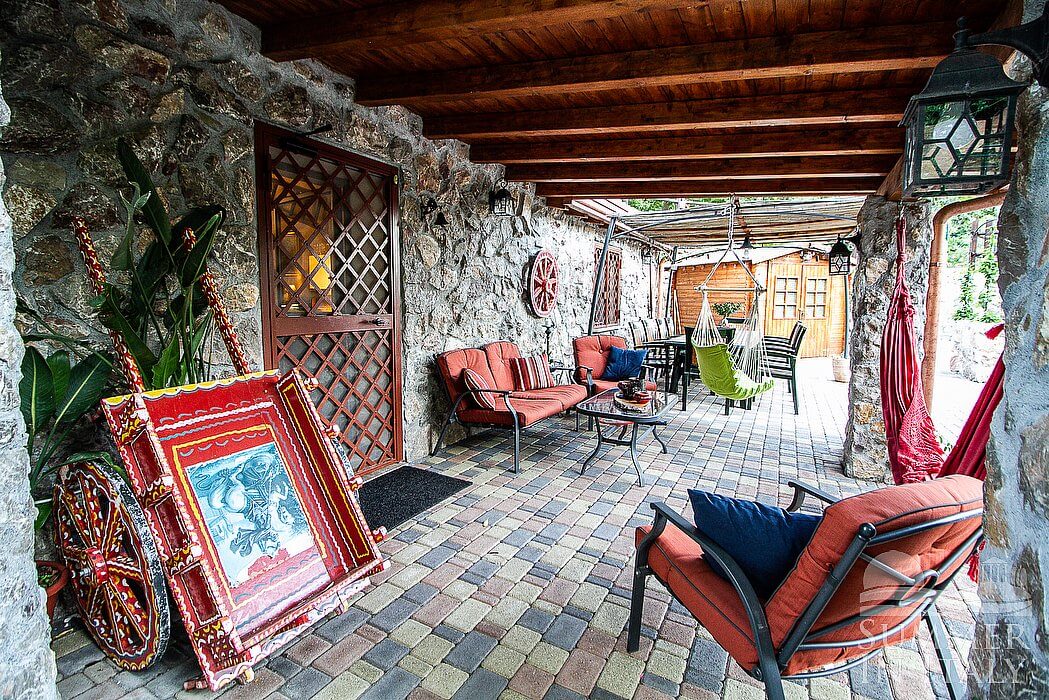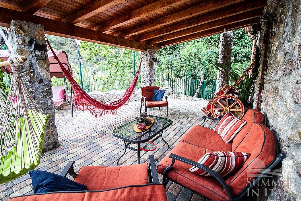 The patio is 30 square meters (320 square feet) large. It is partly shaded by a wood roof and by a pergola with a bamboo roof. It is equipped with a small sofa and two armchairs and with a table, chairs, a sun umbrella, a swing and hammocks. Here you will also find a portable barbecue. From the patio you will enjoy a broad view of the greenery.